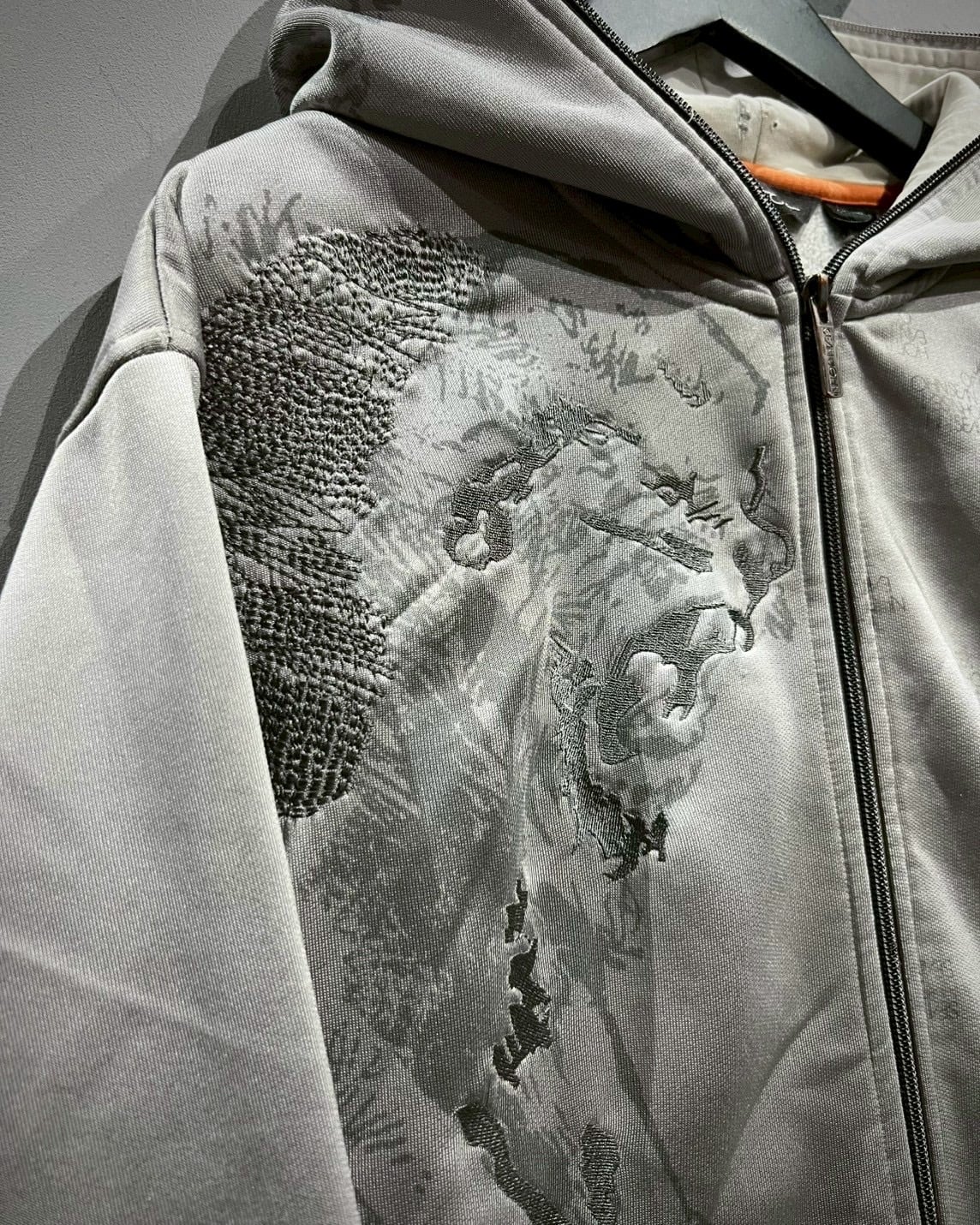 さらに、フードにまでジップが施されたフルジップの稀有なディテール。全て閉めることでその両サイドにもライオンがプリントされた細部までこだわり抜かれたデザインの1着。