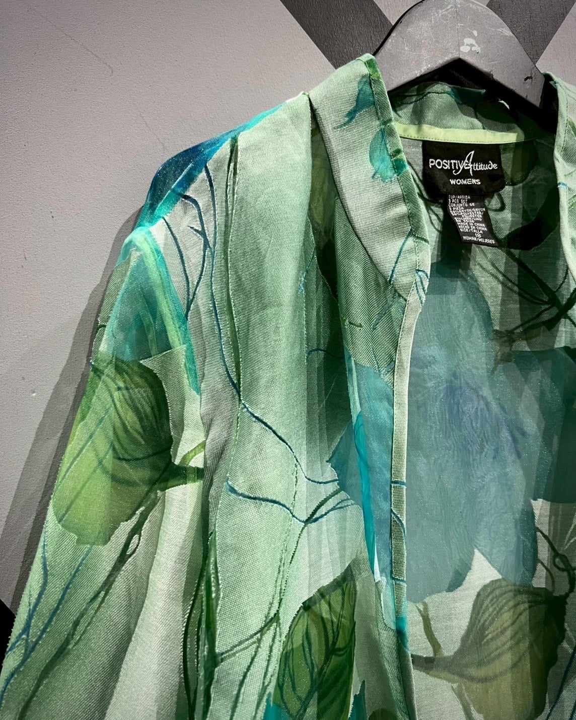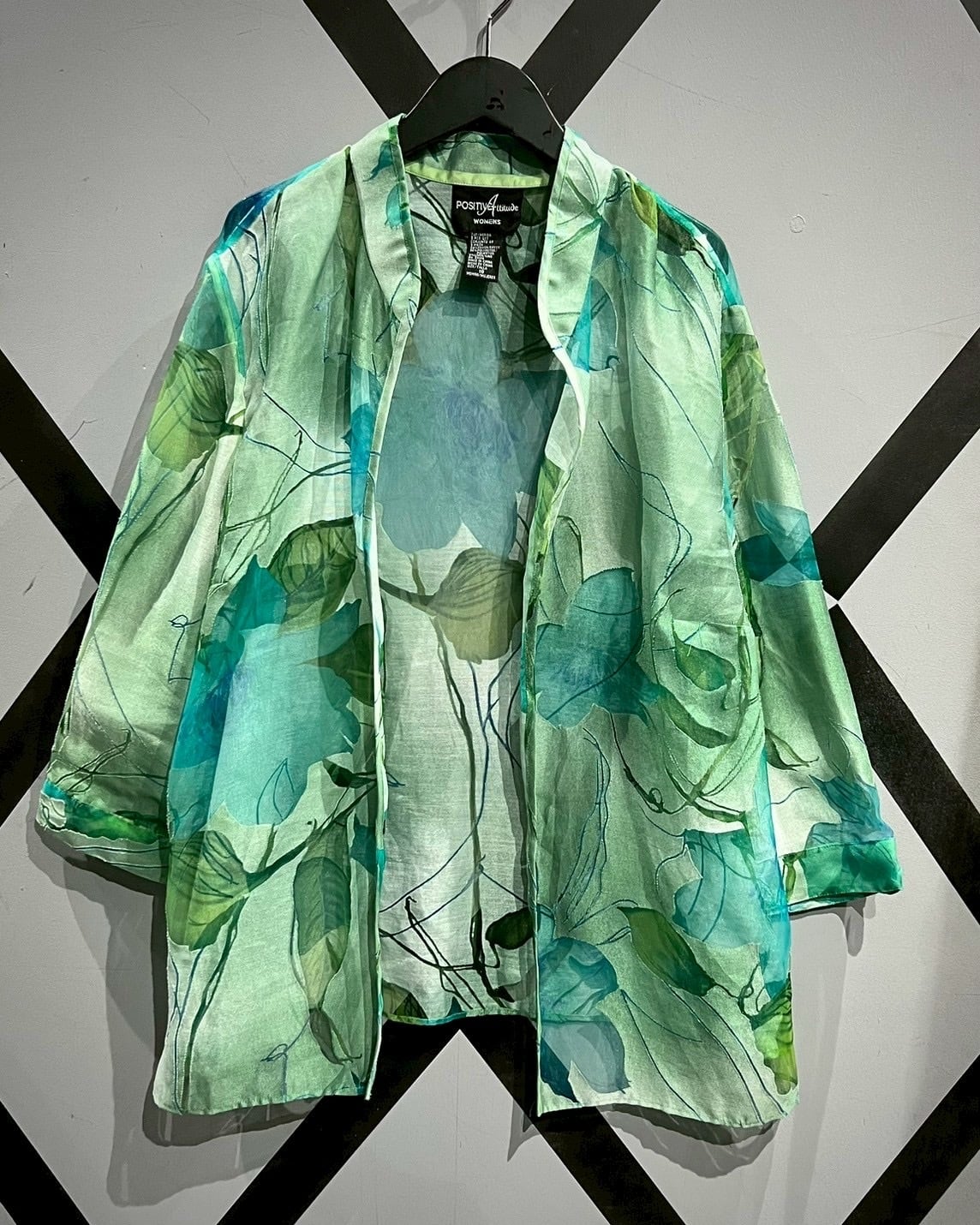 サラッとした透け感のあるシアー素材をベースに、美しいブルーベースの花柄刺繍を施したシアー羽織りジャケット。