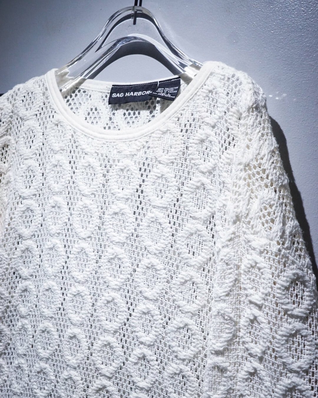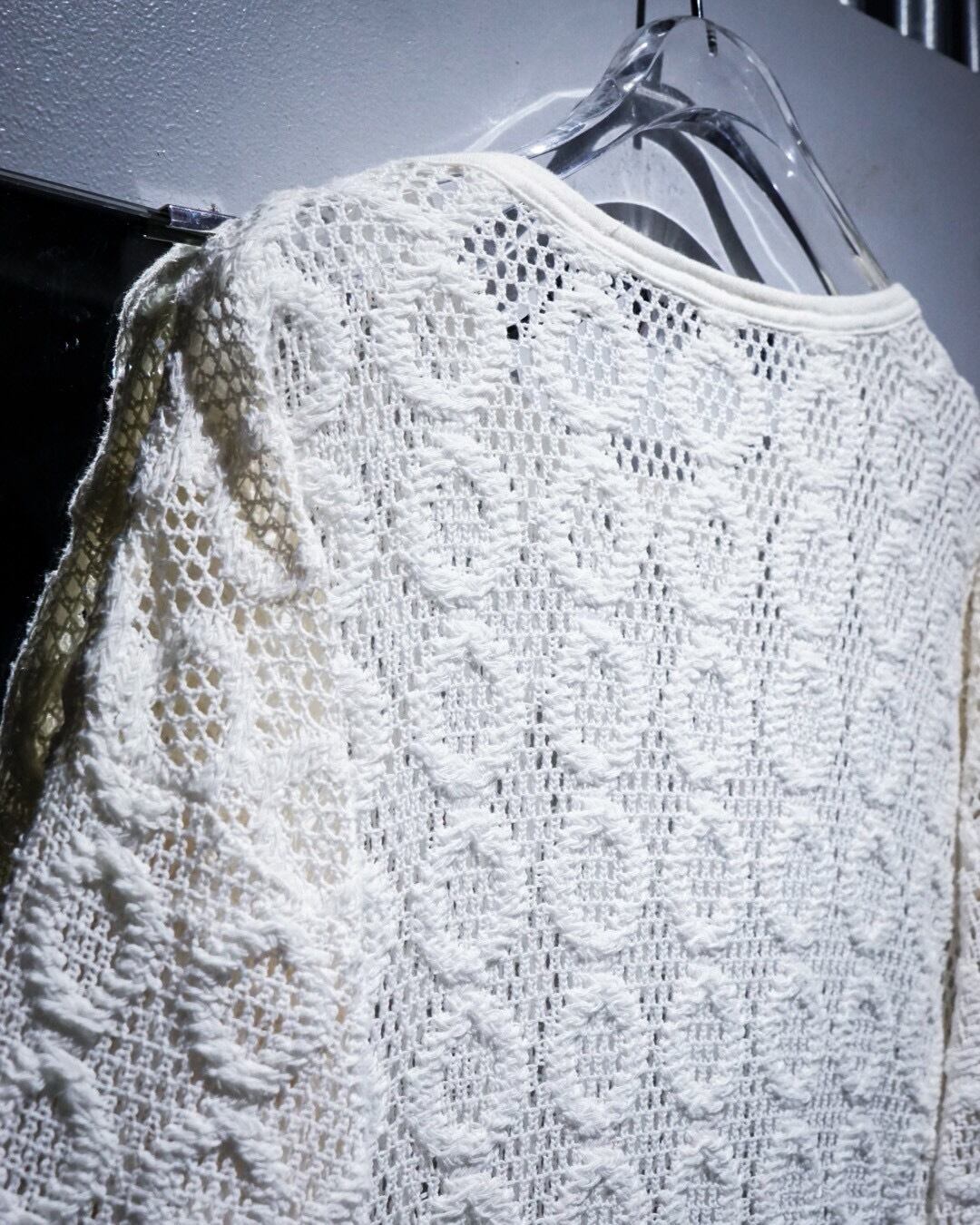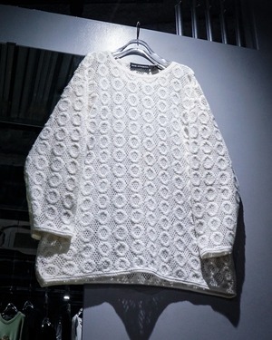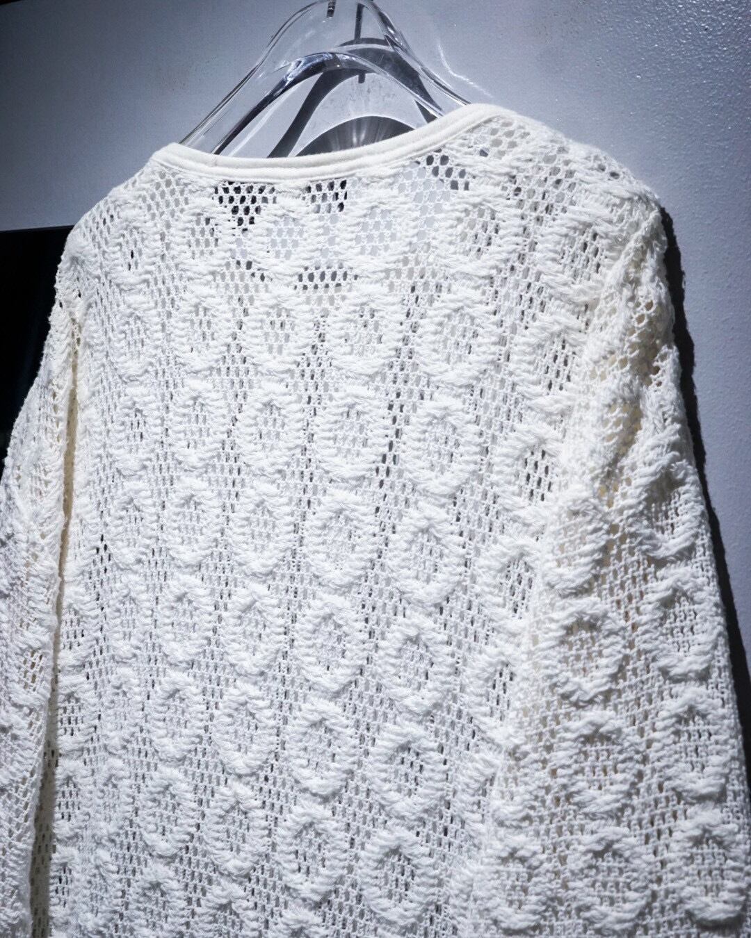 ざっくりと粗い目のメッシュをベースにサークル状の織り込みを全体に施したプルオーバー。