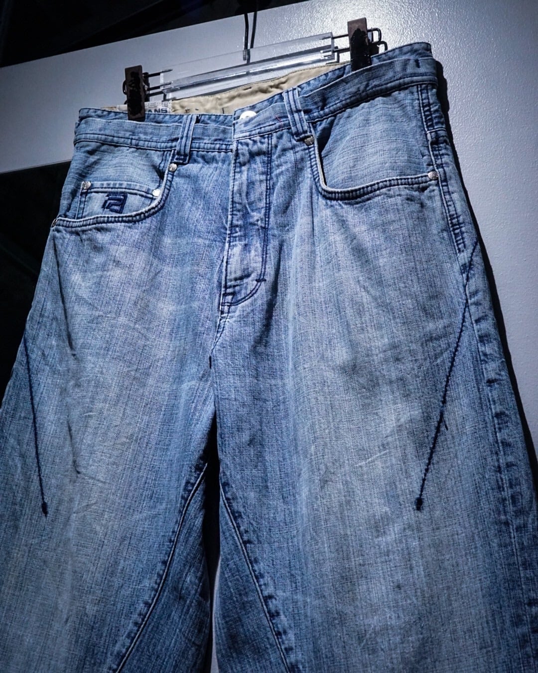 美しくフェードが効いたデニム素材をボディに、切り替えデザイン、随所に濃いネイビーのステッチデザインを施したバギーデニム。