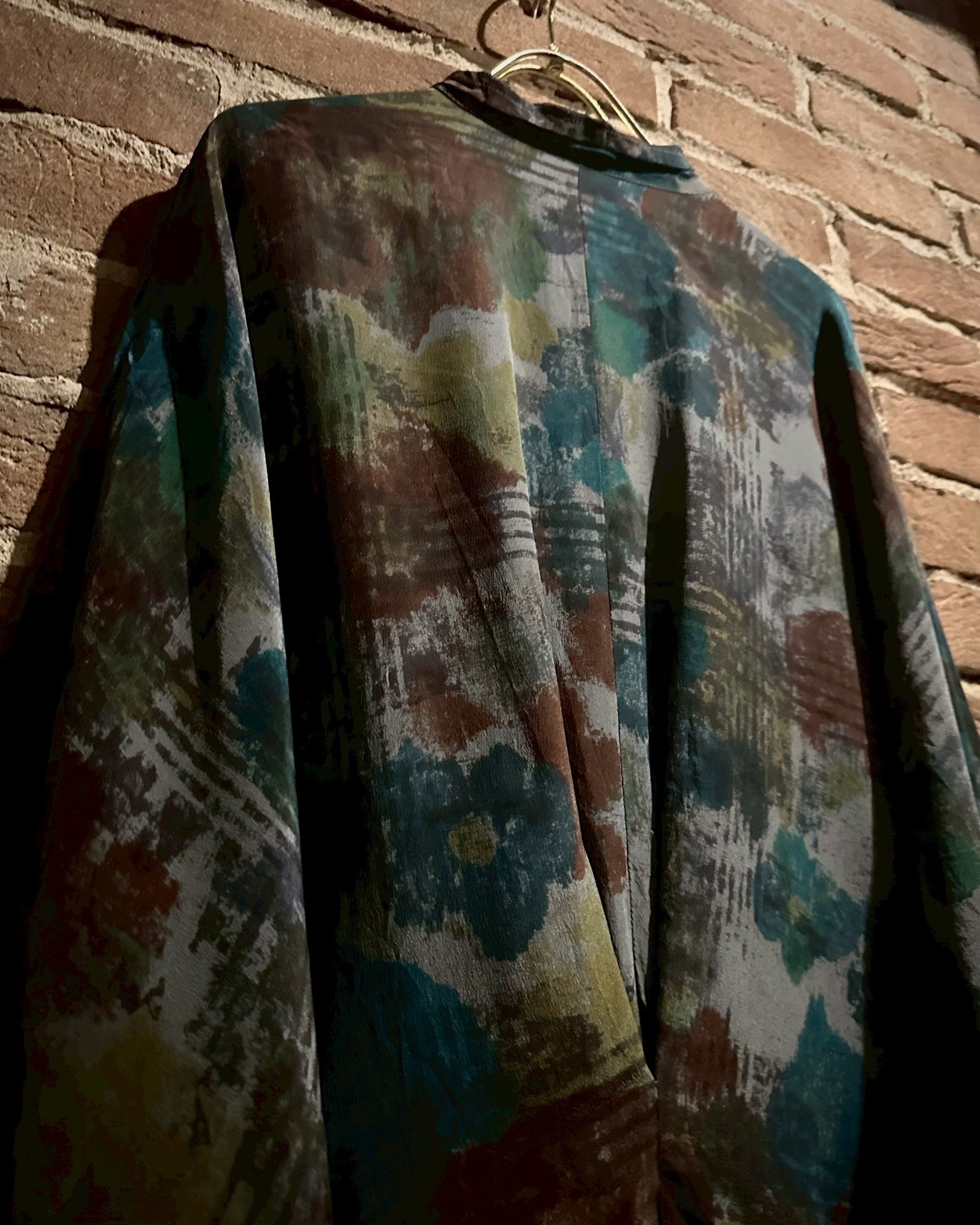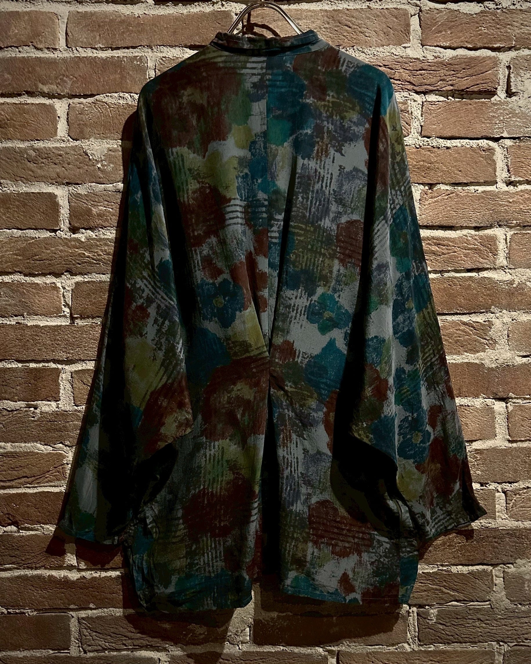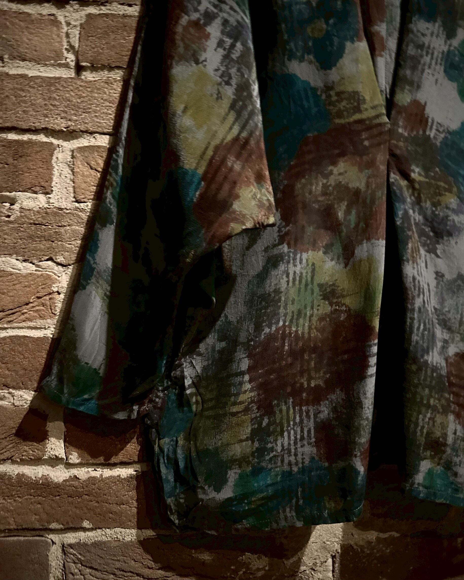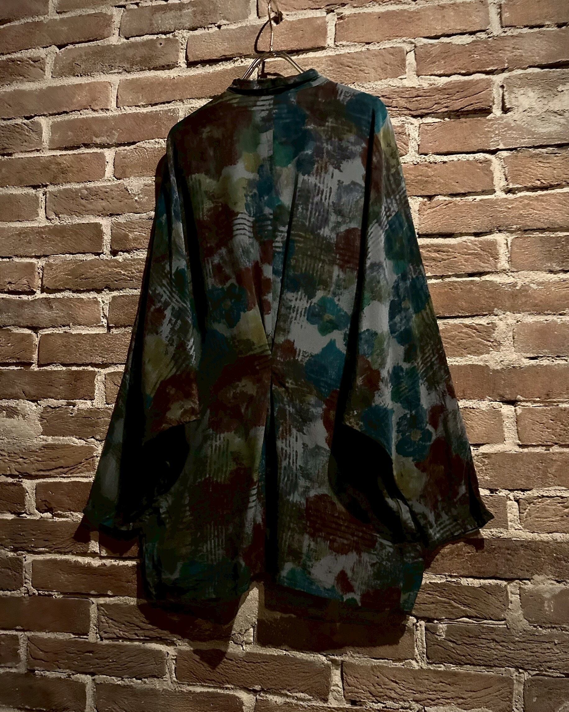 くすんだ暗めのトーンで花柄を全面に施した1着。染のようなムラ感もあり、平面の中に奥行きのある逸品です。