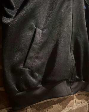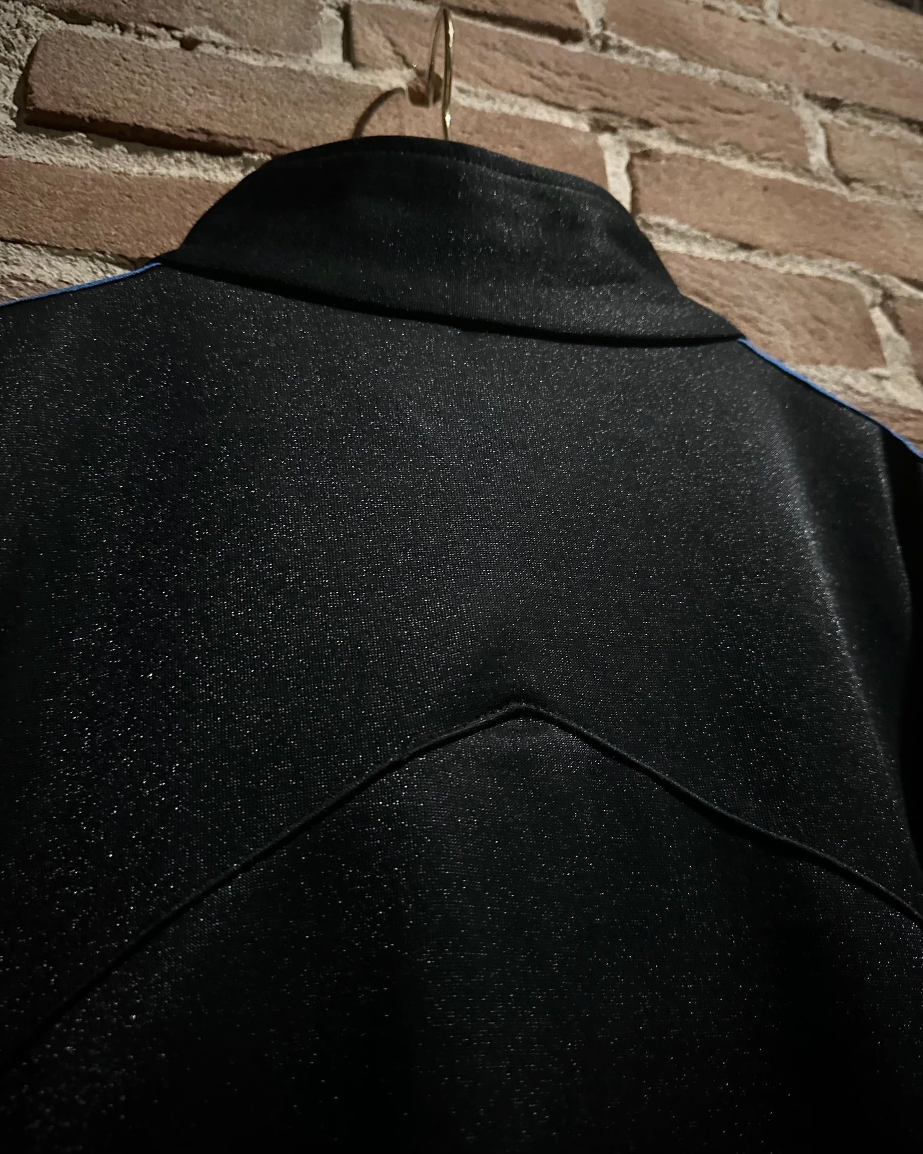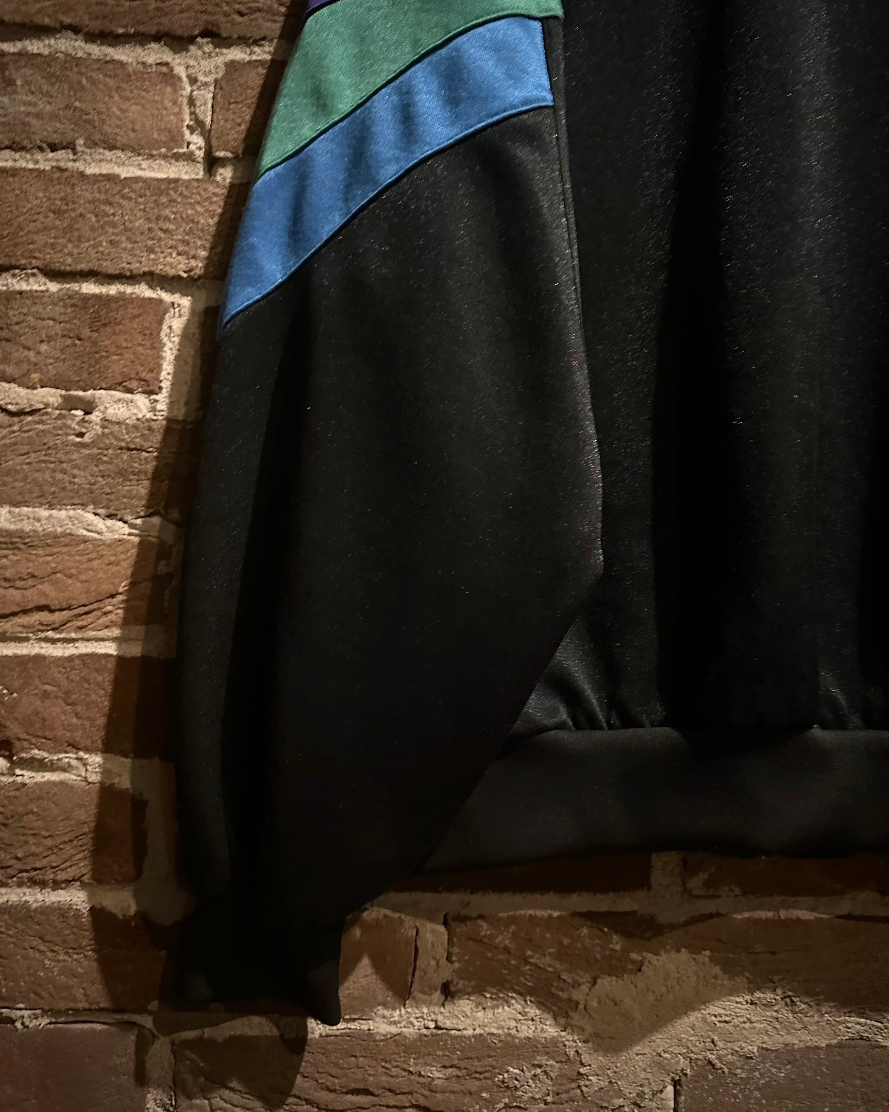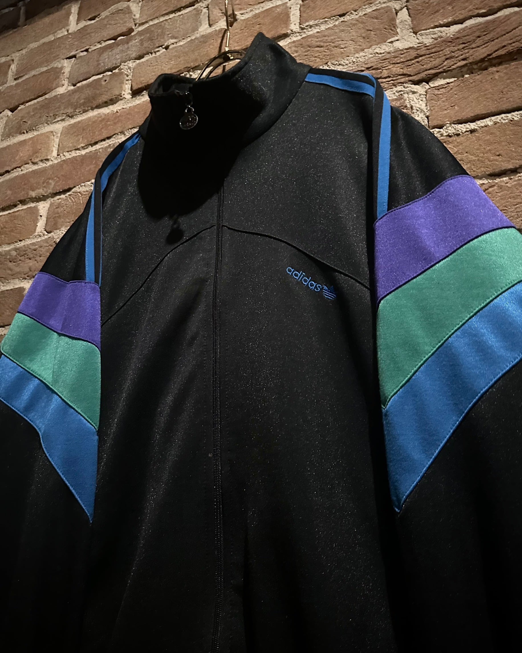 ブラックのボディをベースに、紫、緑、青のカラーリングで切り替えられたadidasのトラックジャケット。