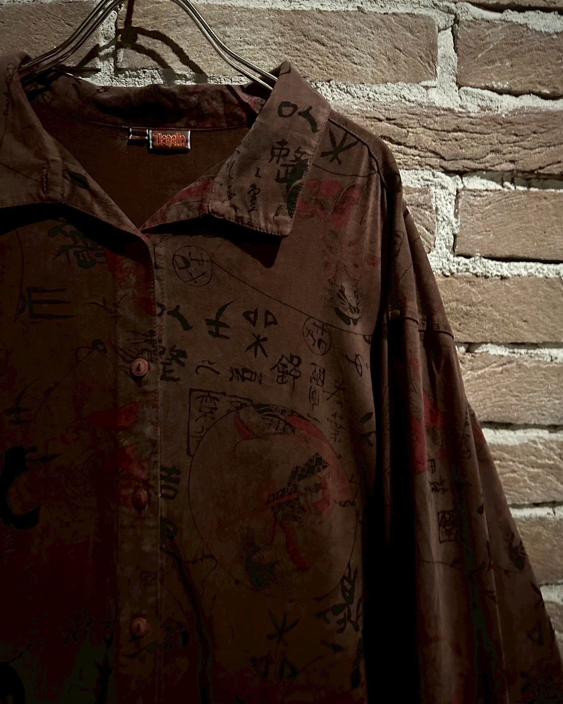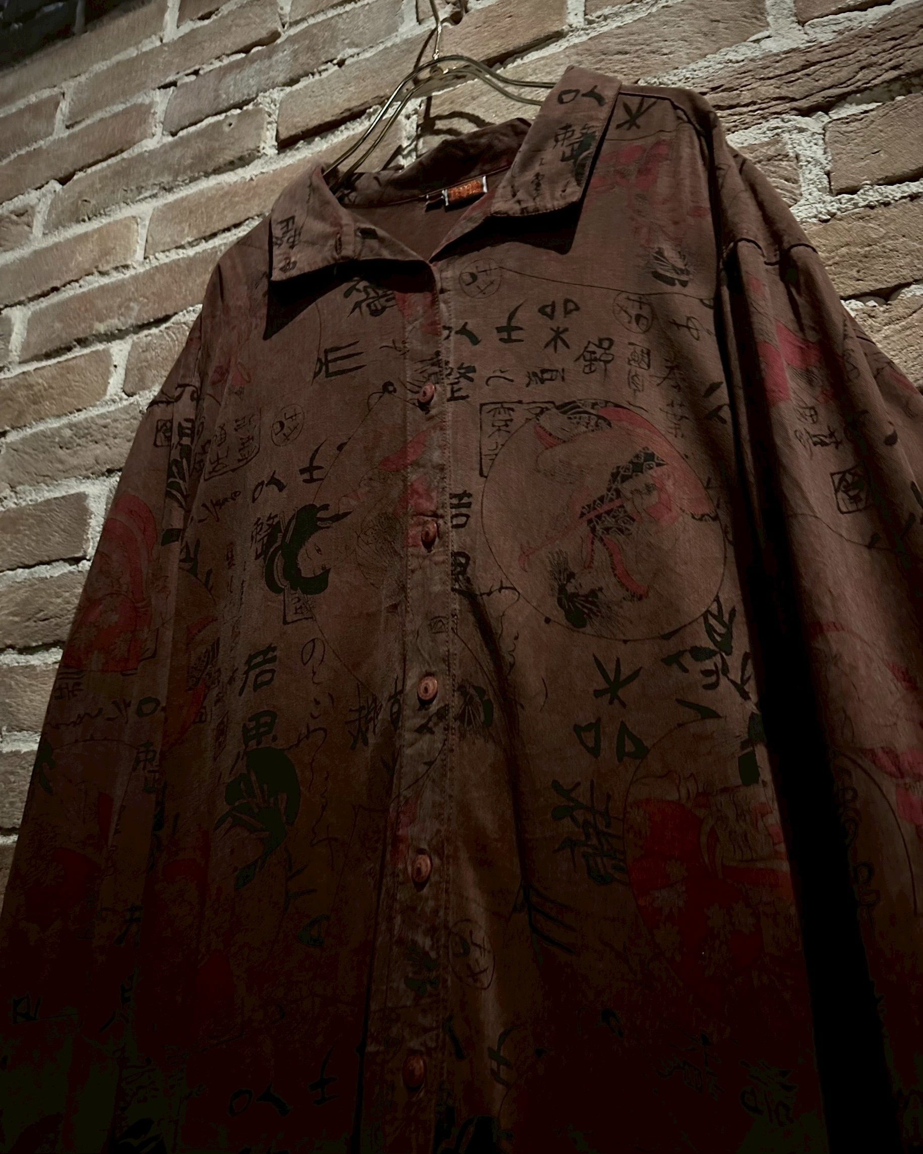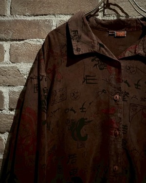 ブラウンのボディをベースに"漢字"をデザインに載せた、チャイナな雰囲気漂う長袖シャツ。