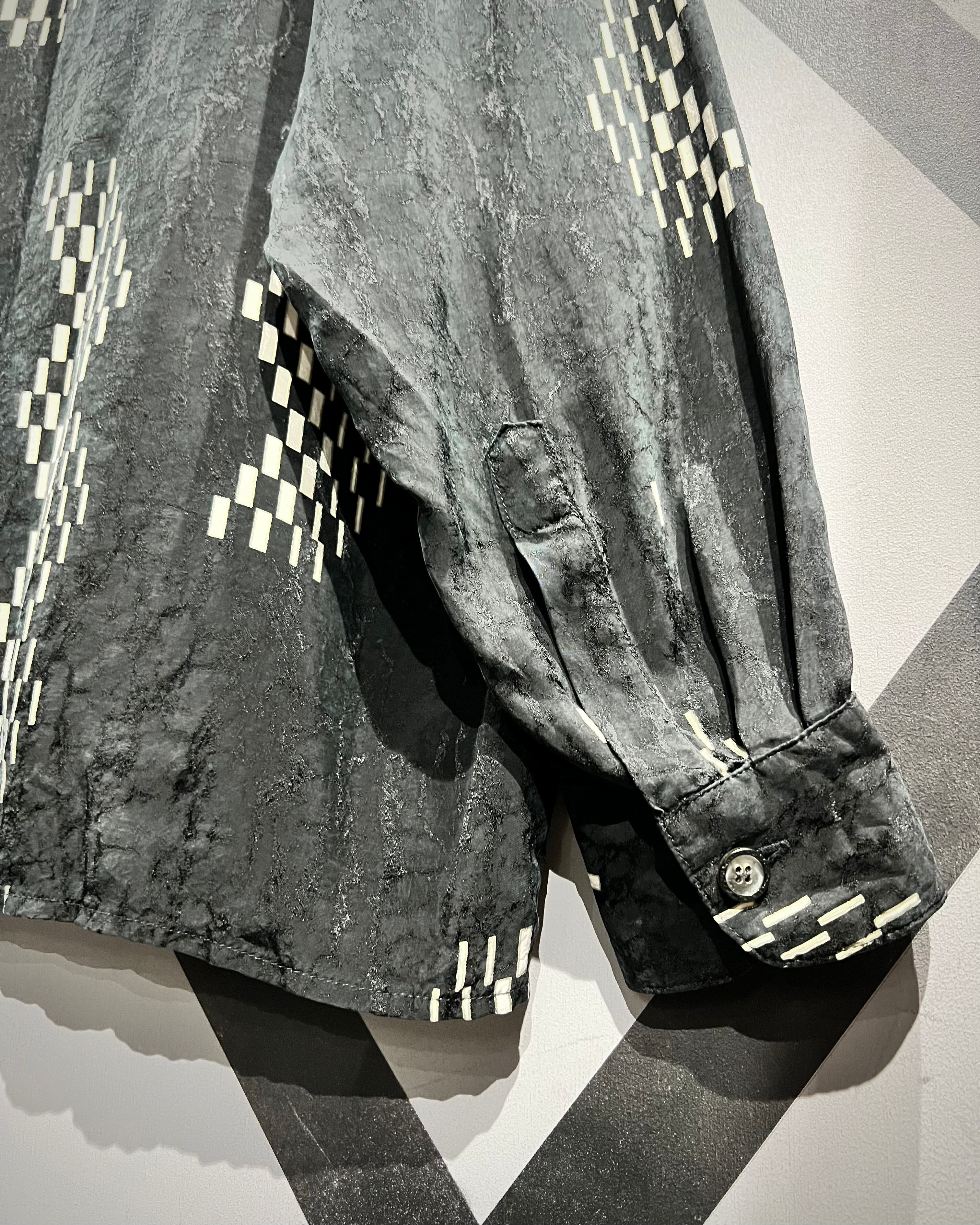 シルク素材を用いたブラックのボディをベースに、織りによって抽象的な柄をボディ全体に映し出し、その上から歪んだ市松模様を載せた長袖シャツ。