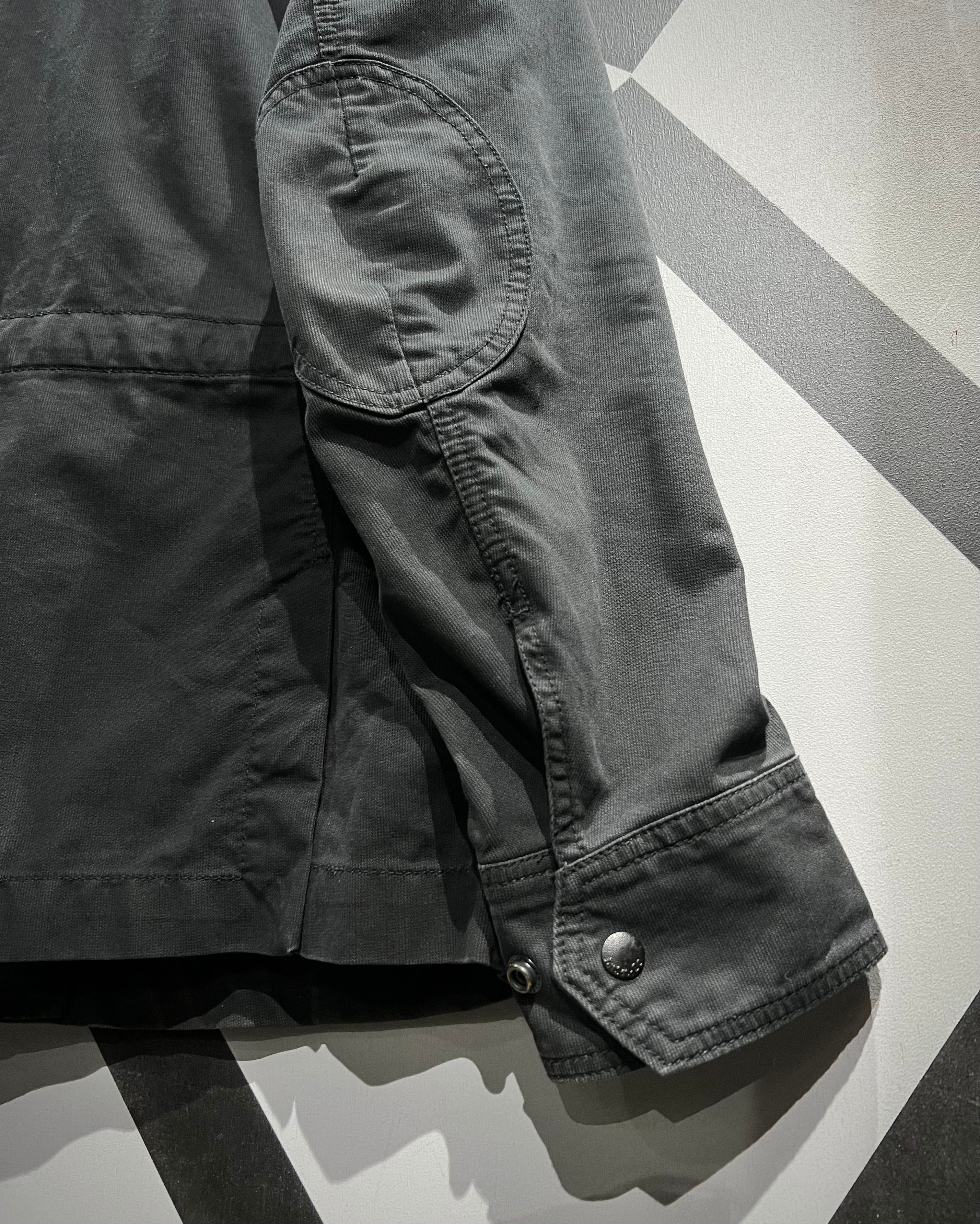 深みのある墨黒カラーで仕上げられた、ハリのあるタフな質感のファブリックをボディに使用し、ミリタリーライクなデザインで仕上げられた1着。