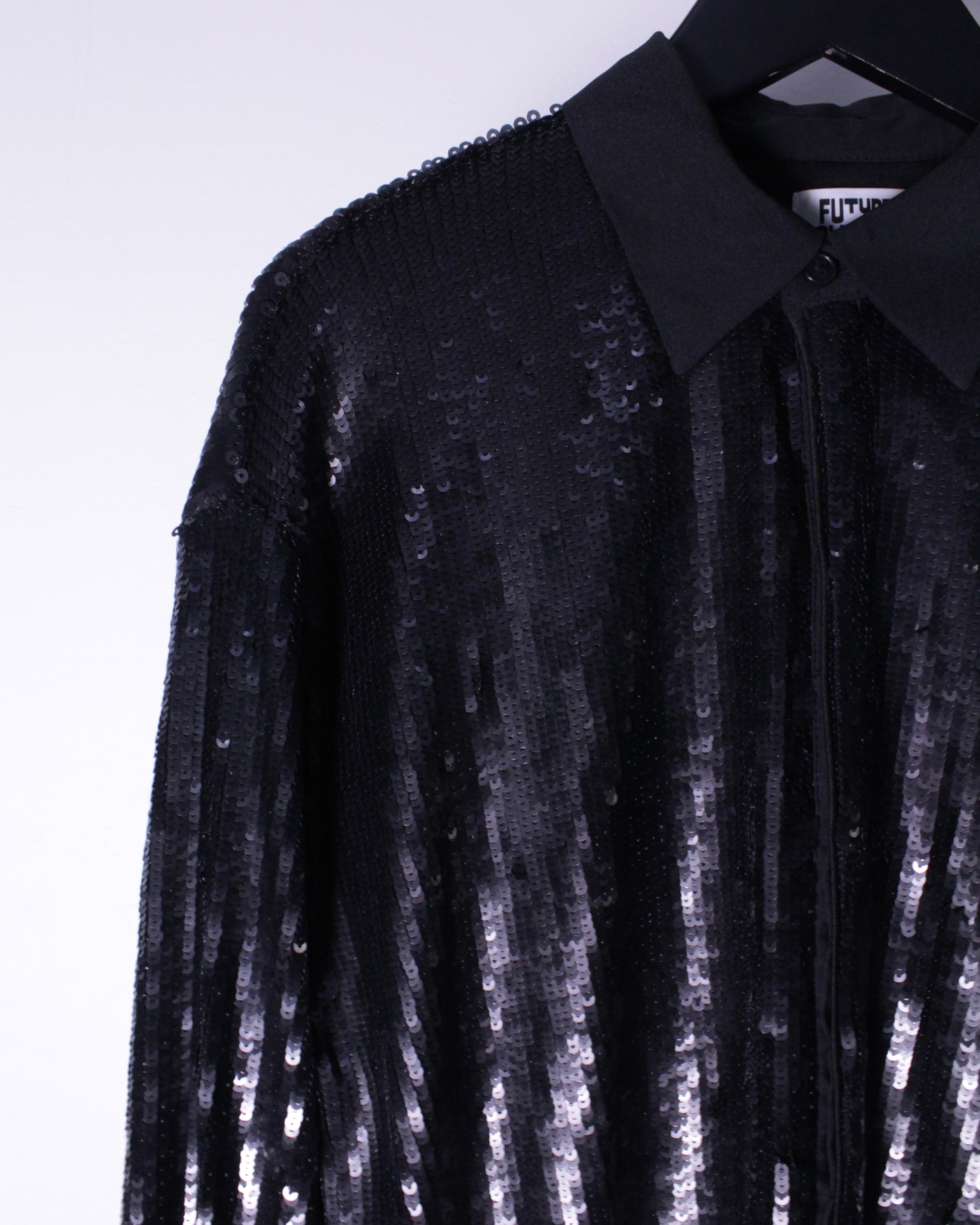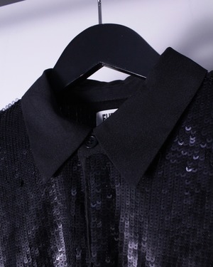 サラッとした質感の伸縮性のある素材をボディに用い、その上から無数のスパンコールを前面に乗せたシャツジャケット。