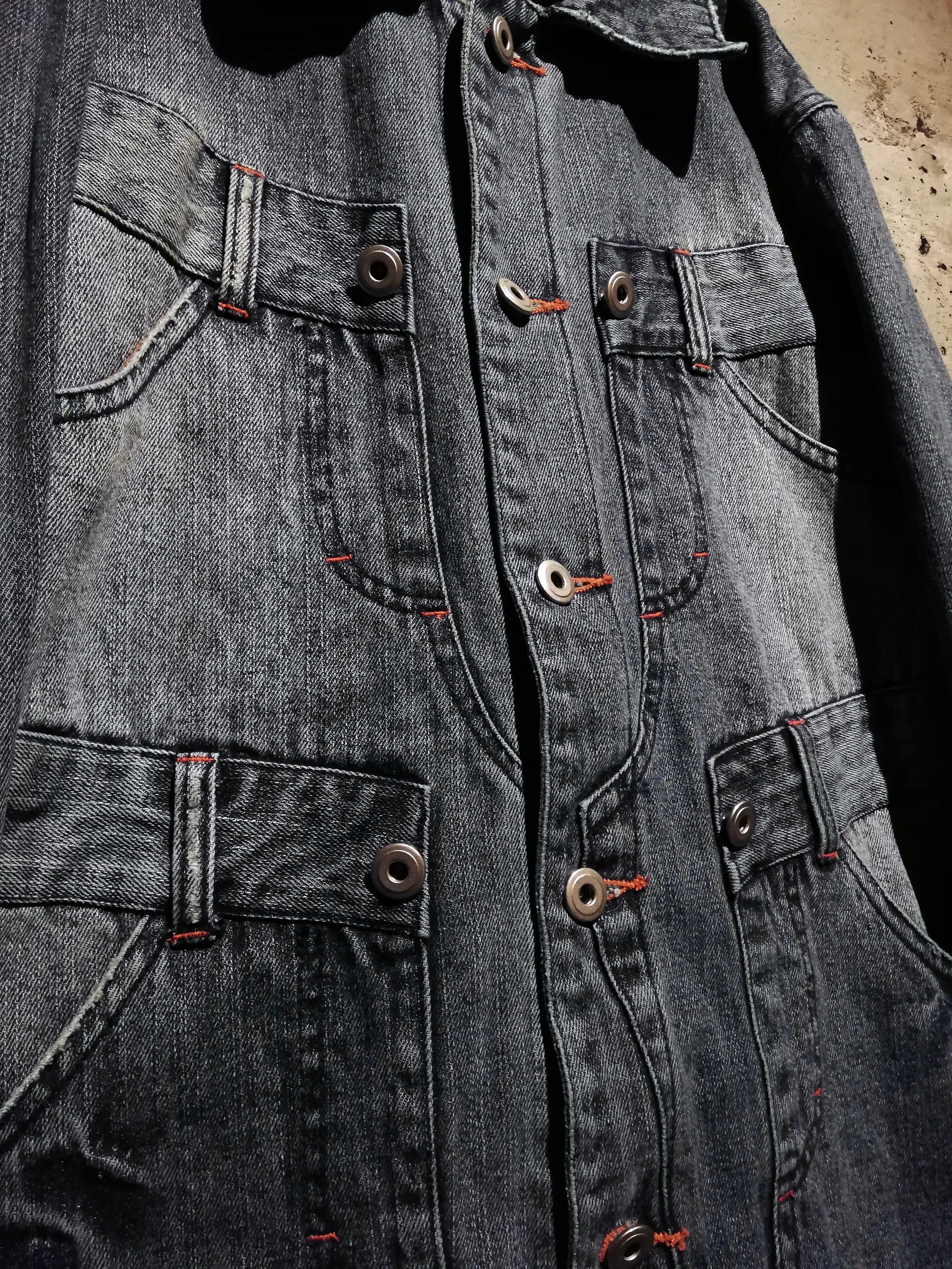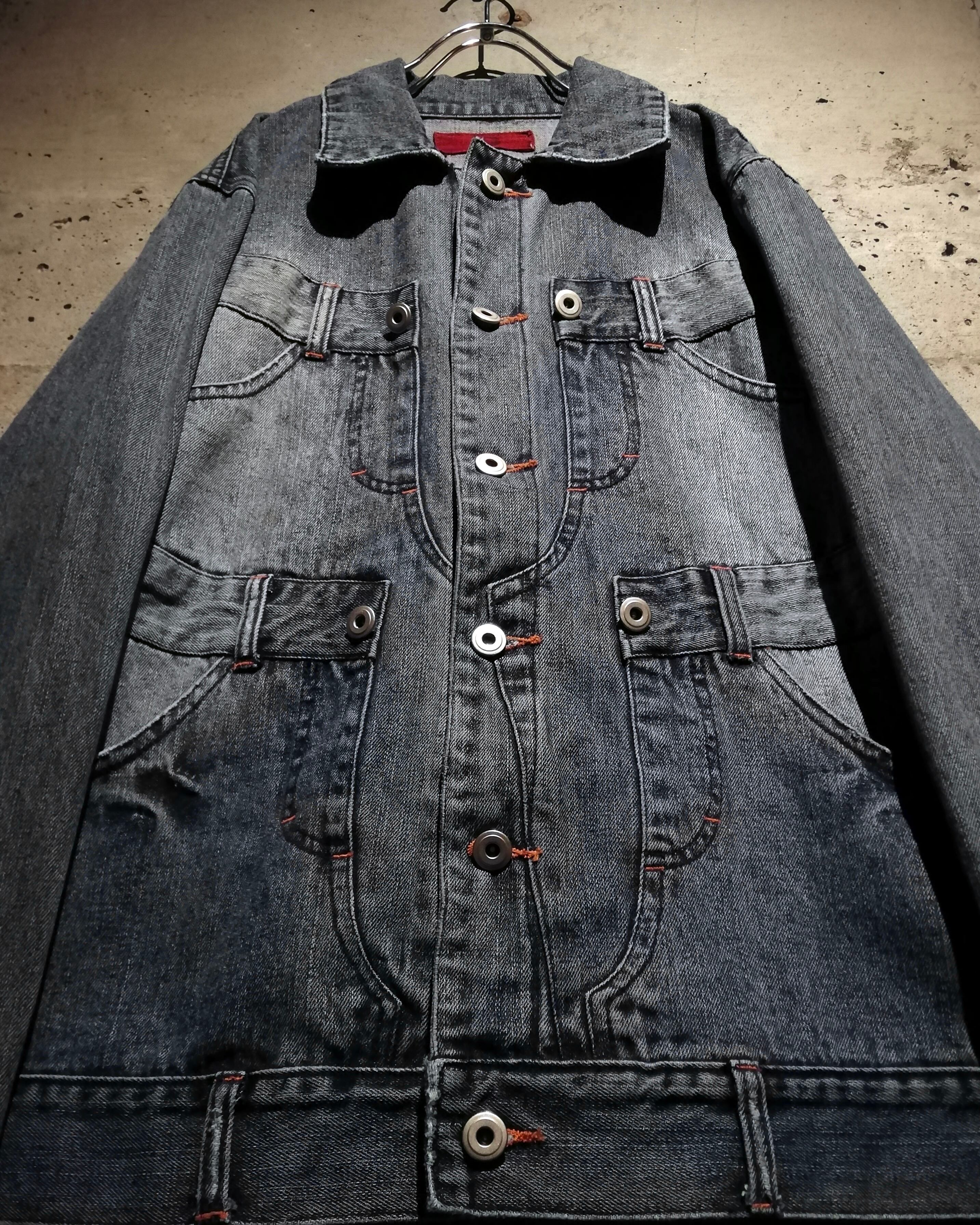 ベルトループにトップボタン、ポケット等々、デニムパンツの一部のディテールを、そのままデザインに落とし込んだ稀有なデニムジャケット。