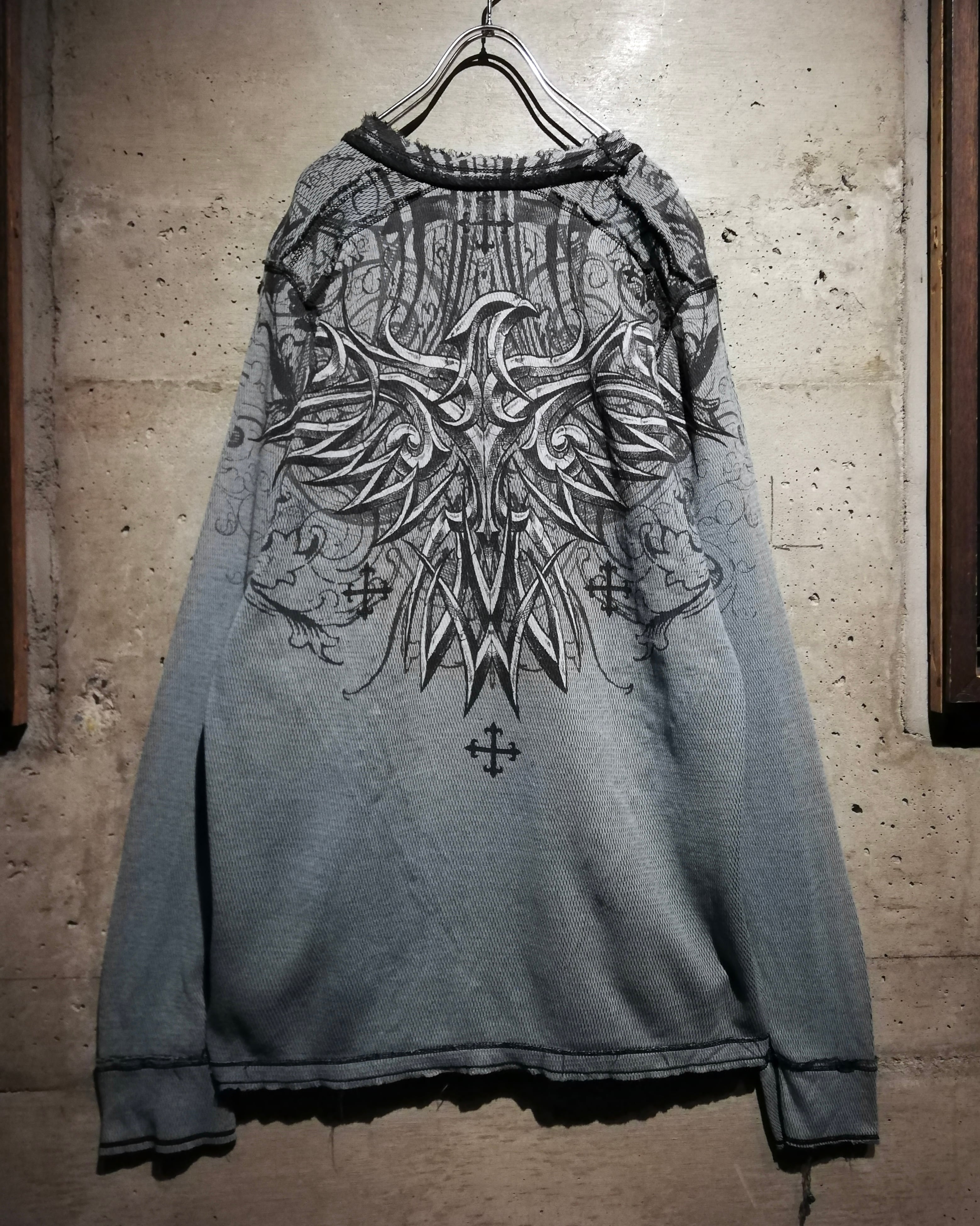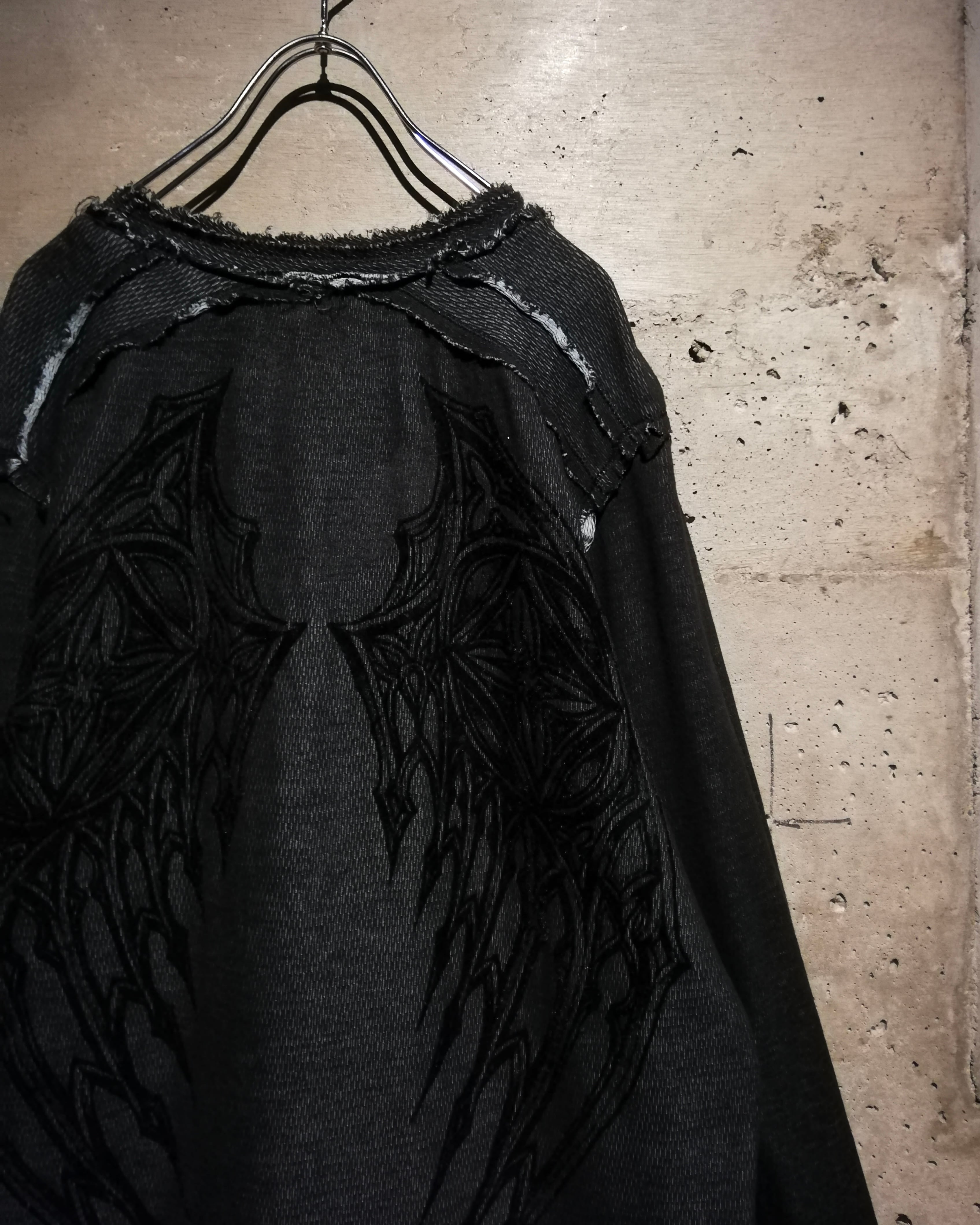 表面はトライバルなモチーフをベースとしたたゴシックなプリントデザイン。裏面はクロスやフェザー、ブランドロゴをフロッキープリントで落とし込んだ、表裏共に当ブランドらしくありながら異なる表情を見せる、リバーシブルならではの二面性を楽しむことが出来る1着。