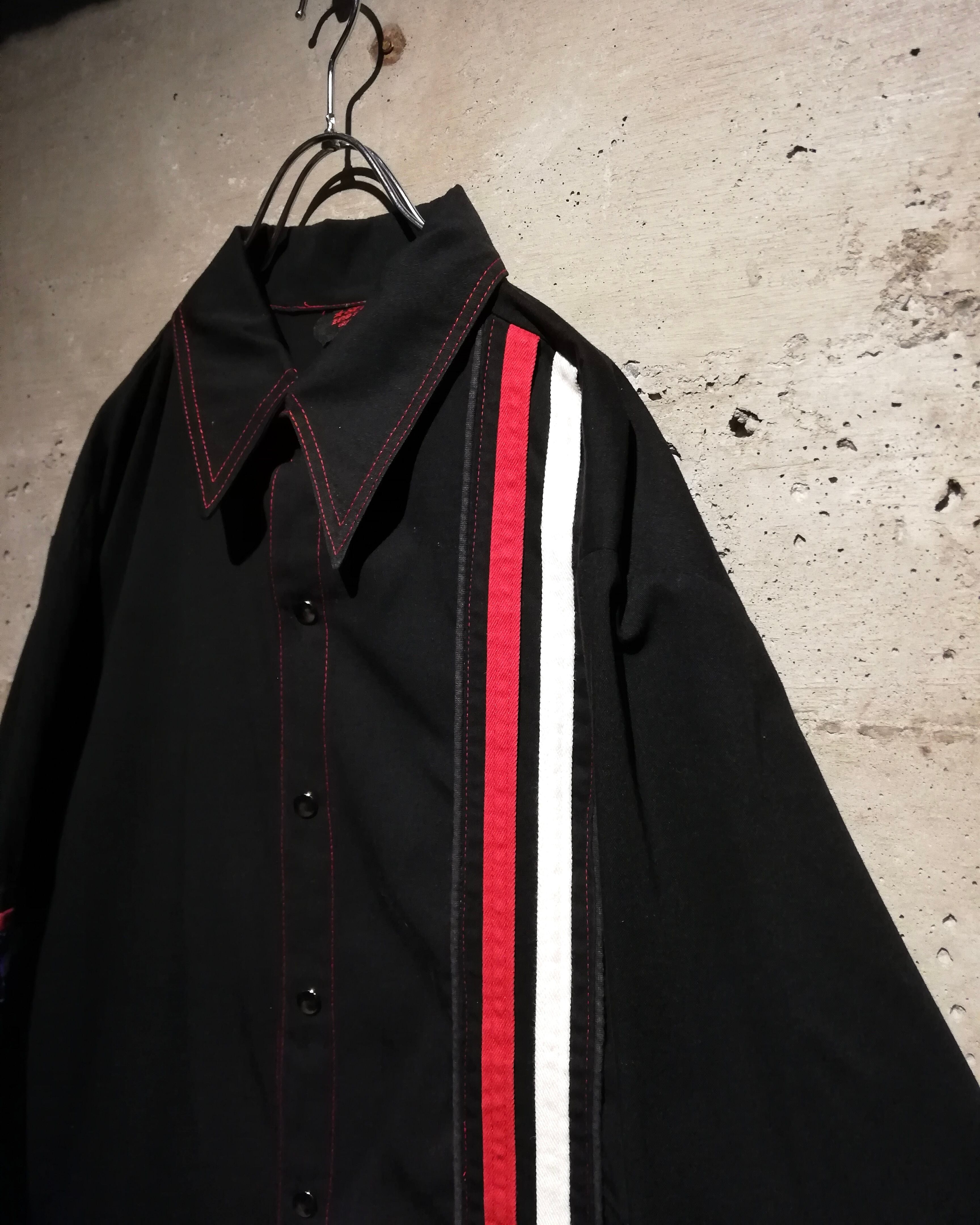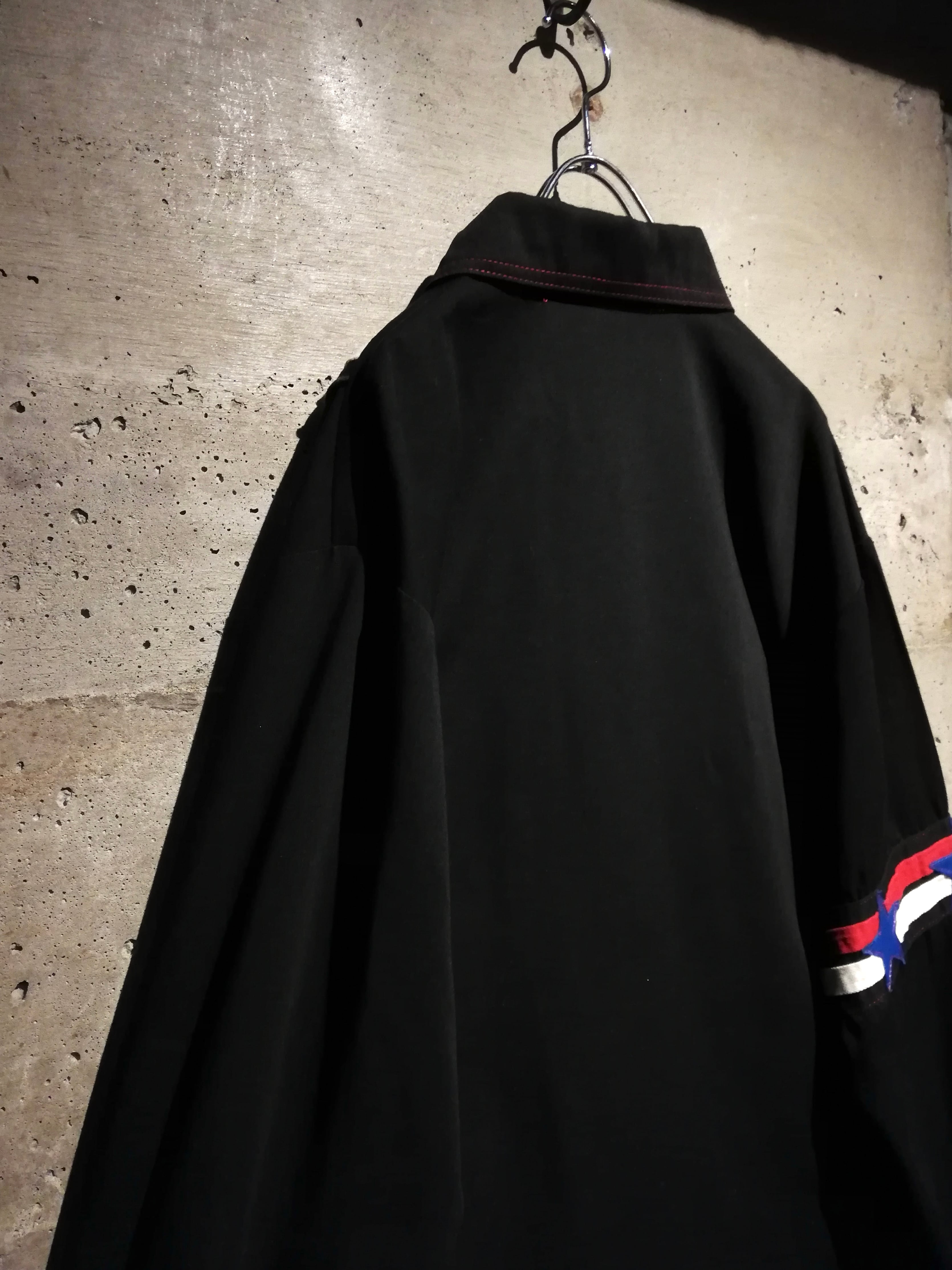 ハリのあるブラックボディに、赤×白のラインをフロント&右袖に走らせ、袖のライン部に星のパッチを載せたシャツジャケット。