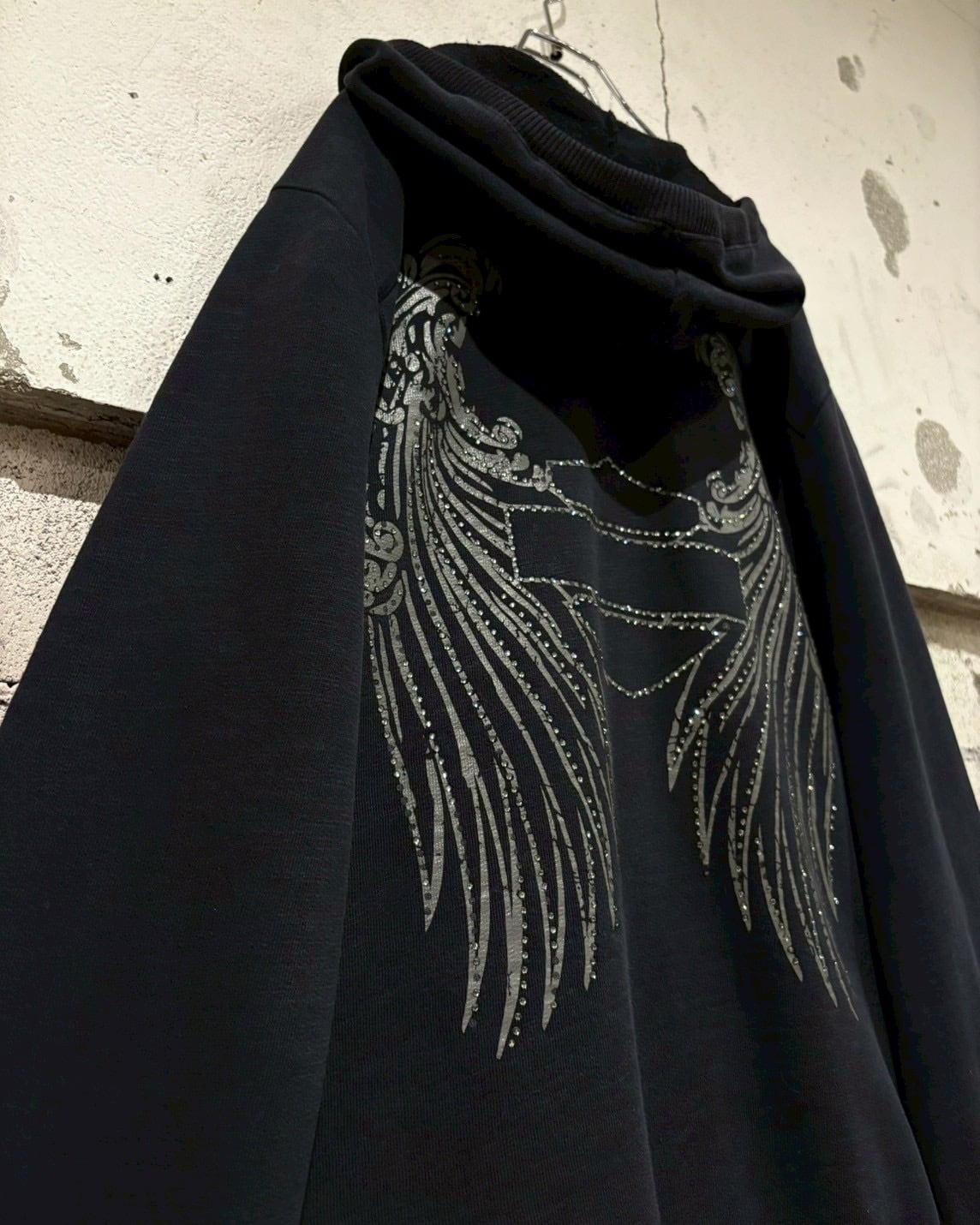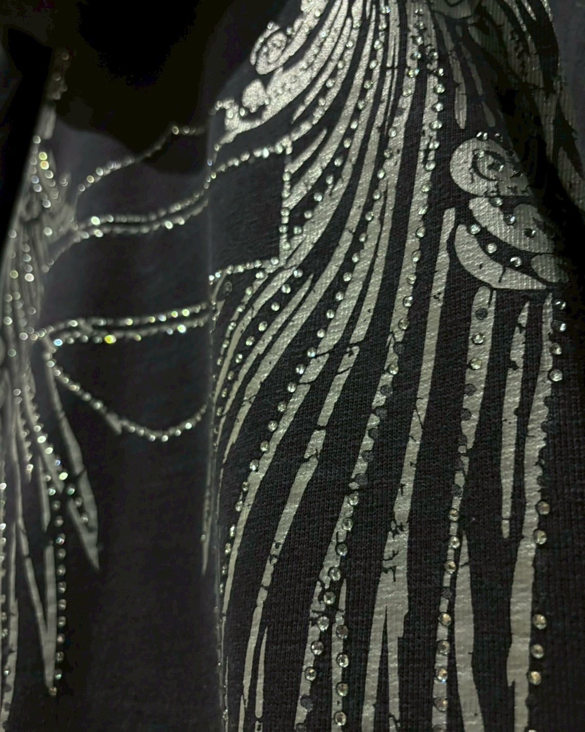 ブラックのボディに、フェザーのプリントを前背面に載せ、ラインストーンの装飾を加えた1着。