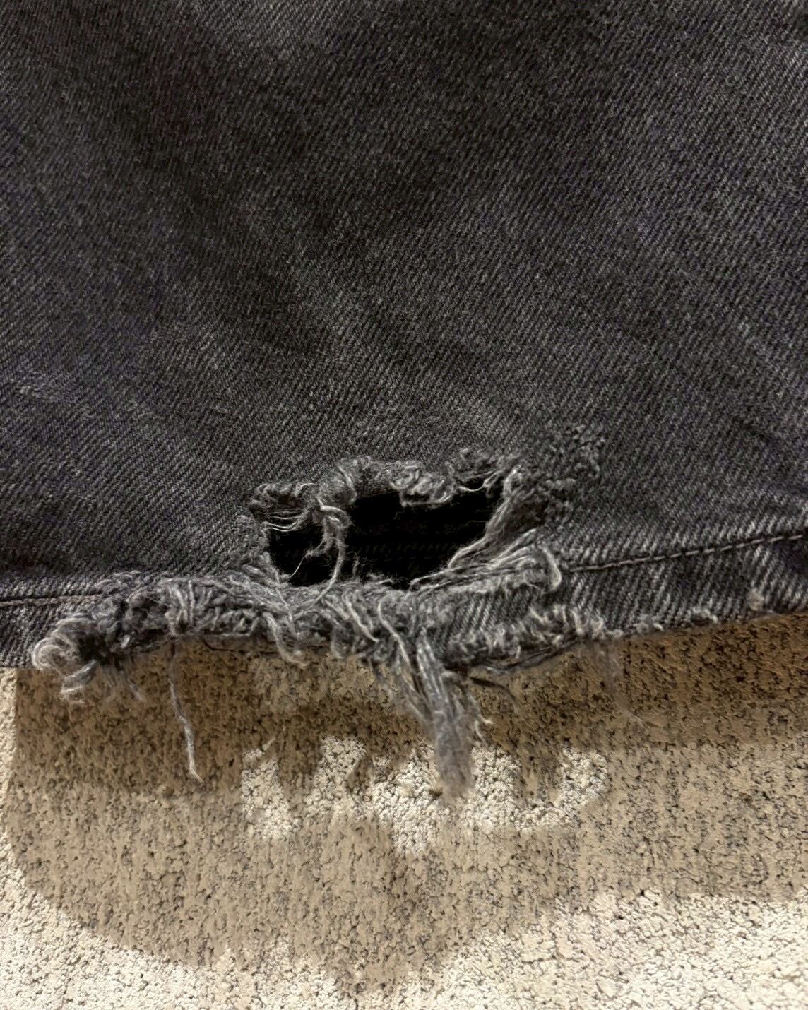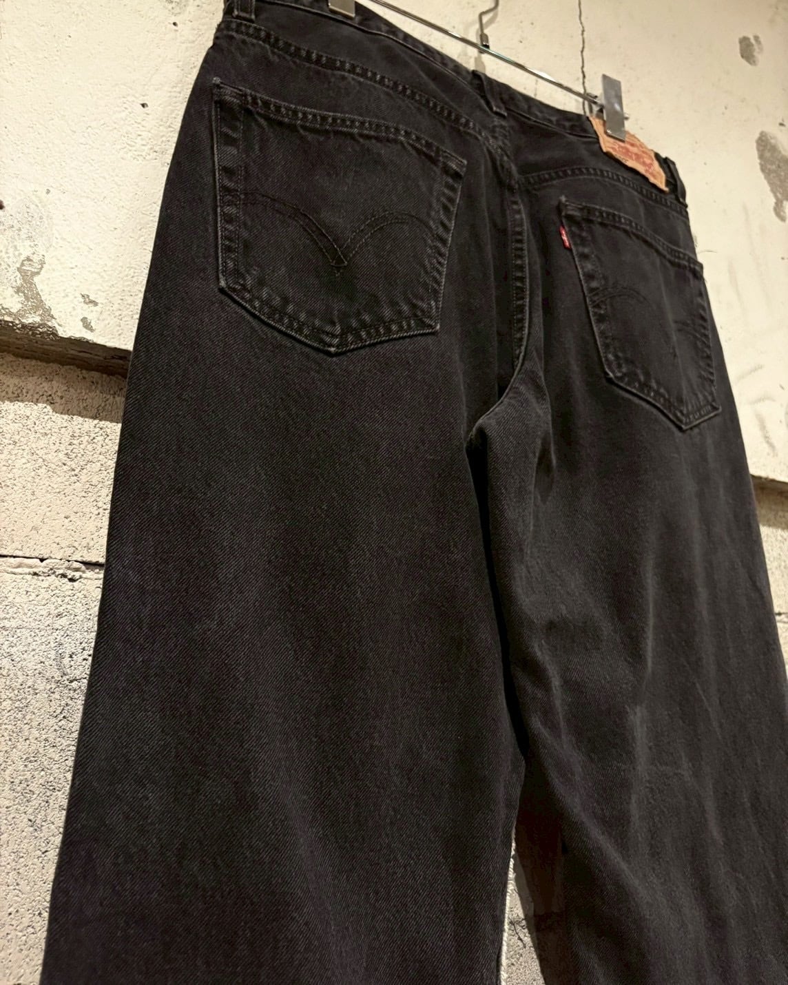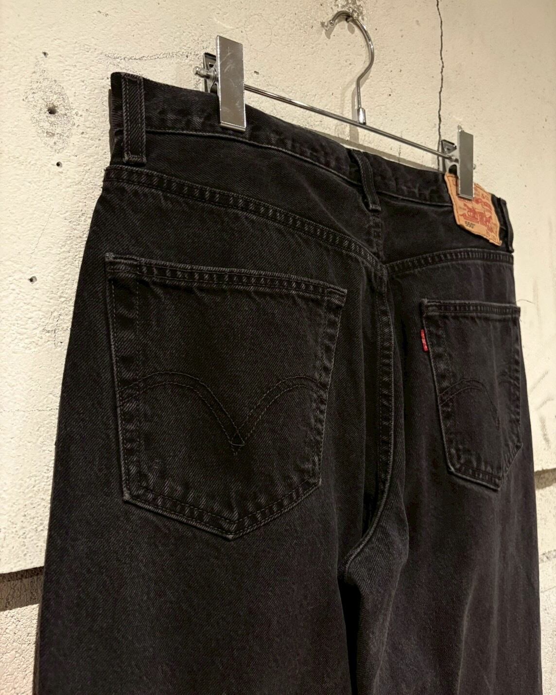 フェードの効いたブラックデニムのボディをベースに、前所有者によるハンドペイント、パッチワークによるカスタムが施された"Levi's" "550"のデニムパンツ。