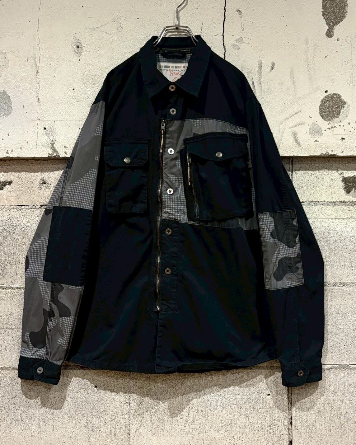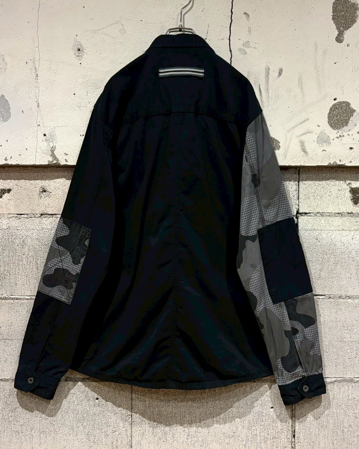 ブラックベースのボディに、モノトーンの迷彩柄、千鳥格子を切り替えた、ハイストリートな雰囲気が漂うシャツジャケット。