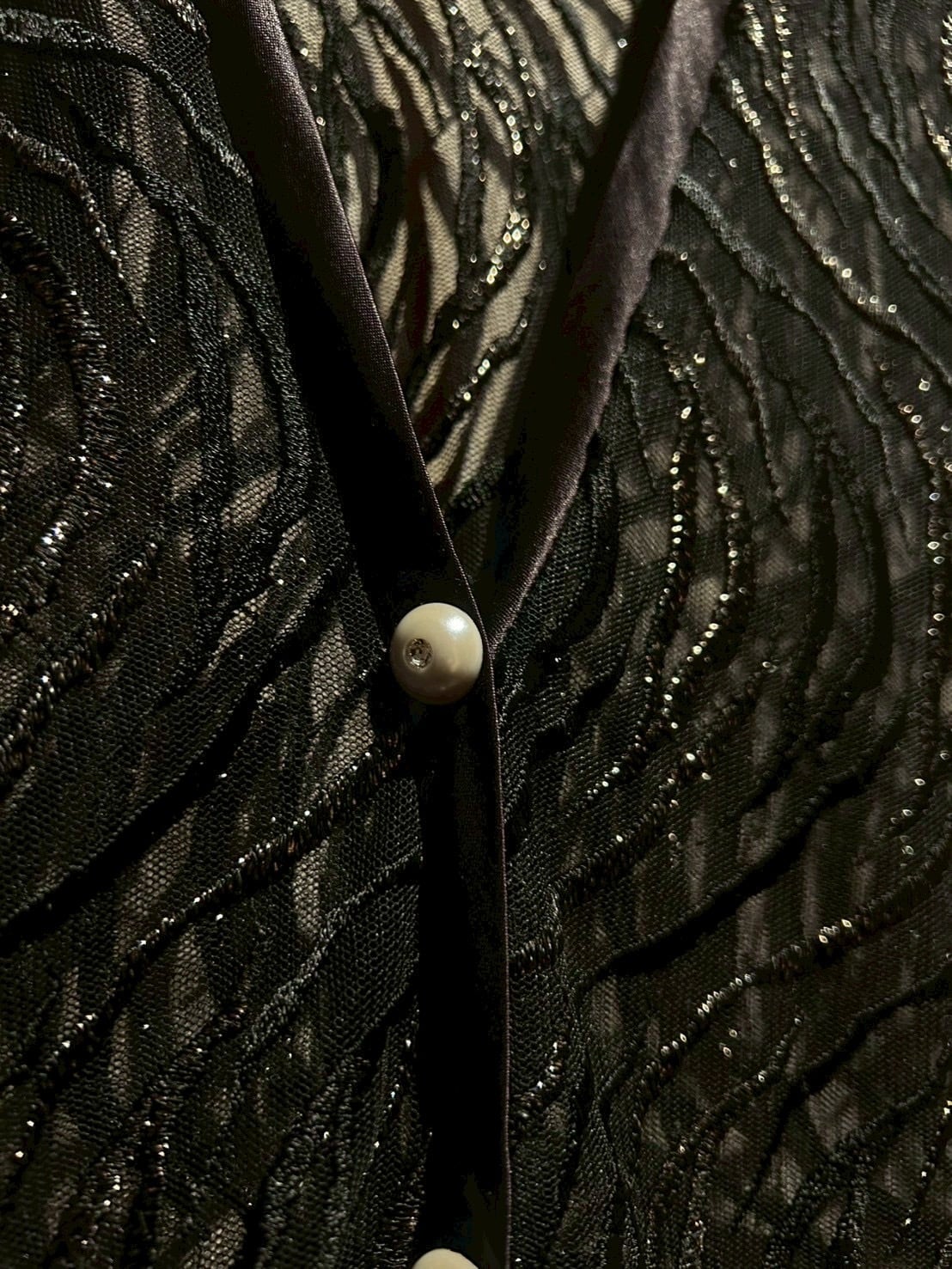 柄には輝きを見せるラメ糸を織り込み、シアーの美しい透明感とも相まって、オールブラックながらも奥行きのある表情に仕上がっており、雰囲気をムンムンに漂わせる1着。