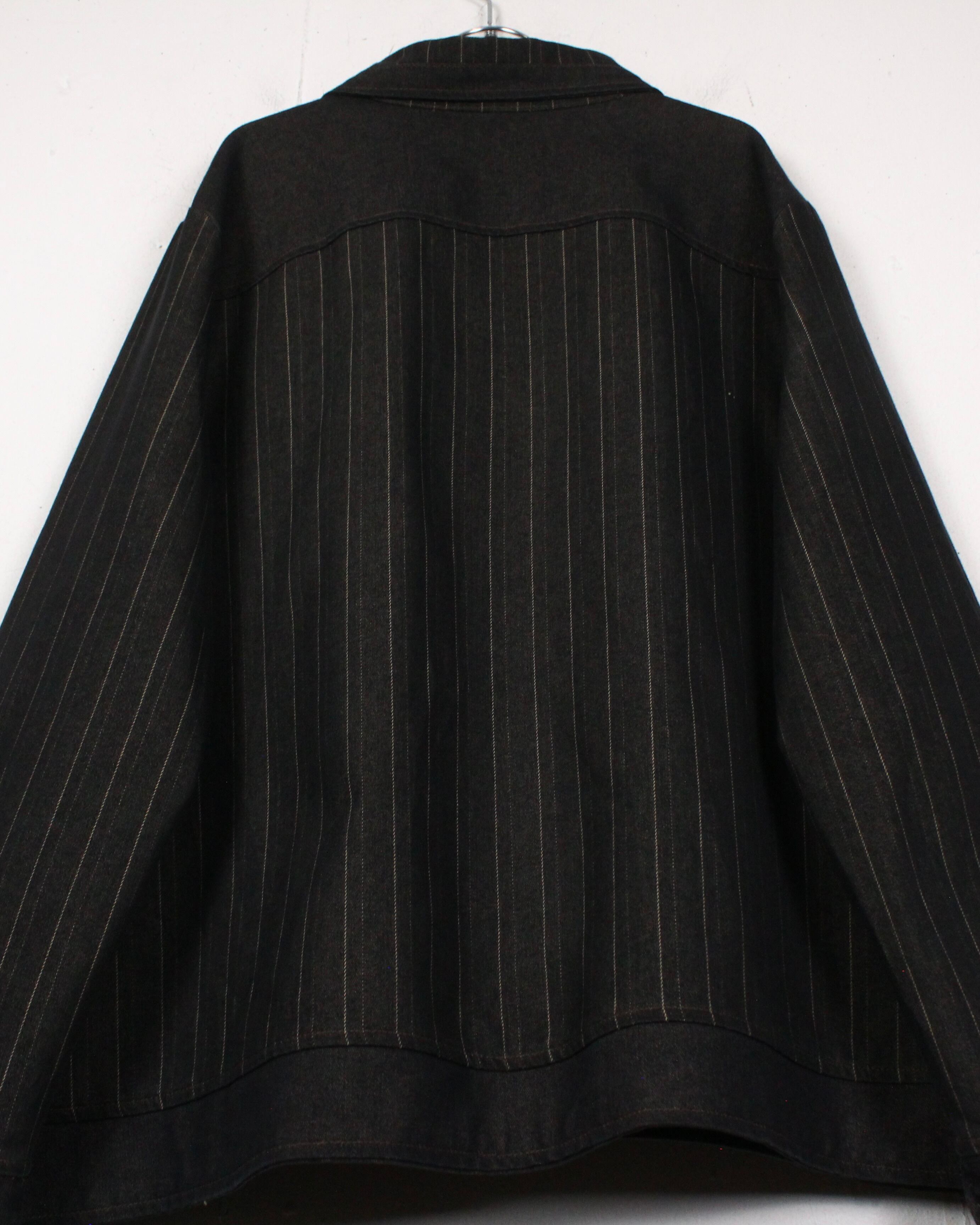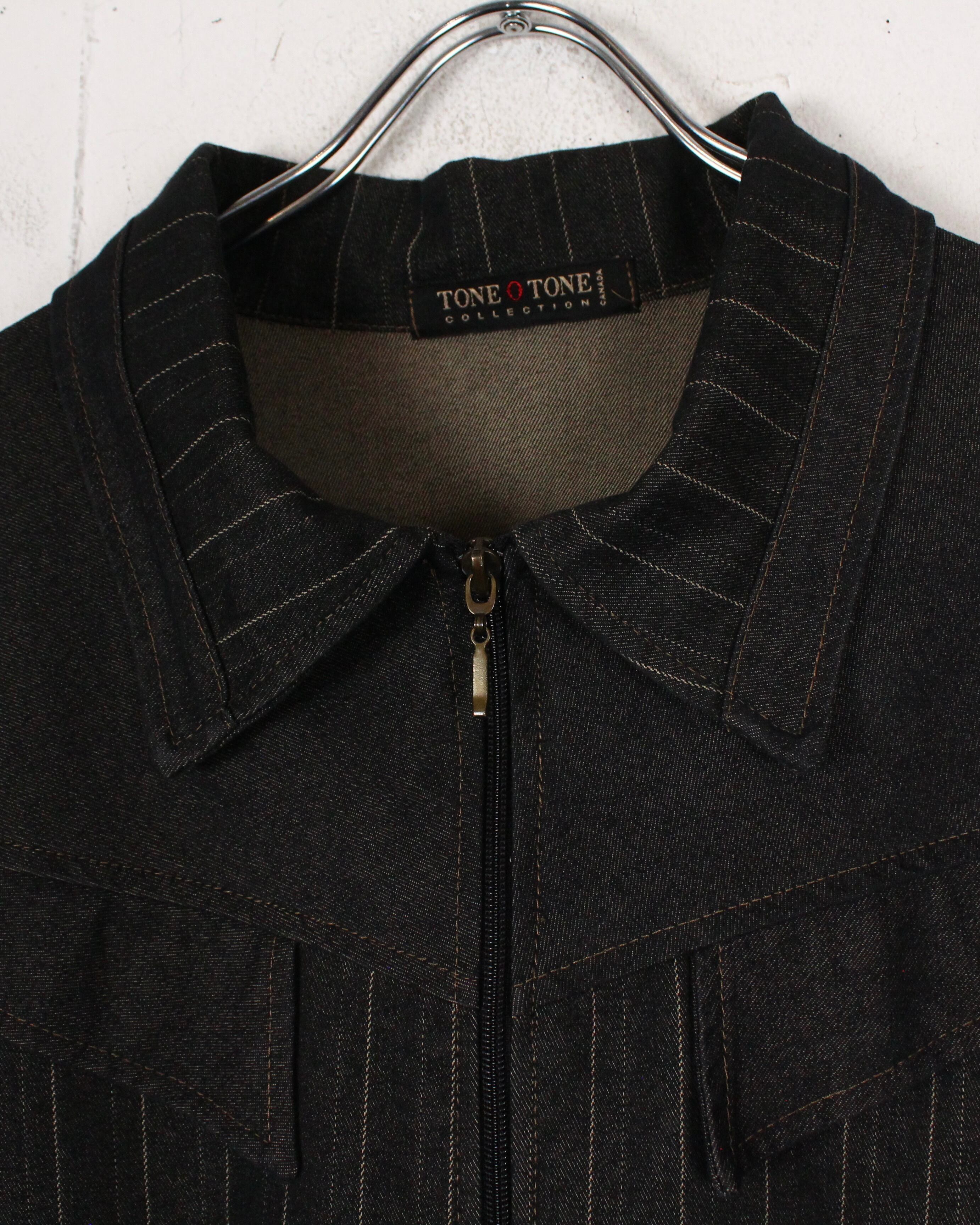 柔らかく薄手のデニムのボディに、襟、身頃、袖にストライプを切り替えたジップアップシャツジャケット。
