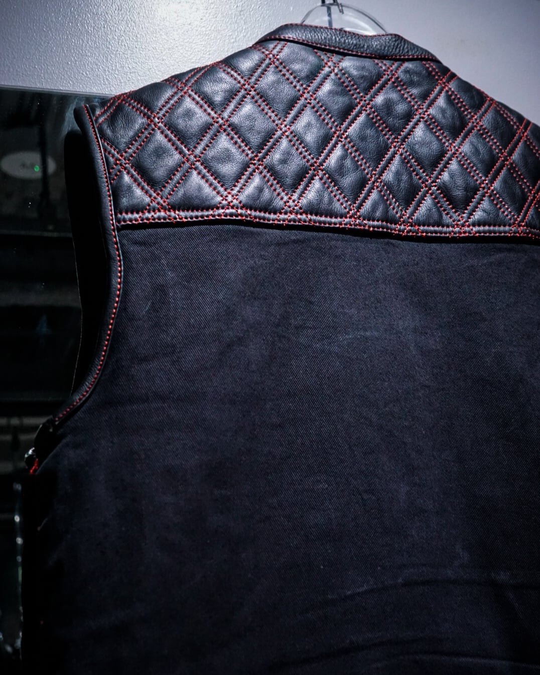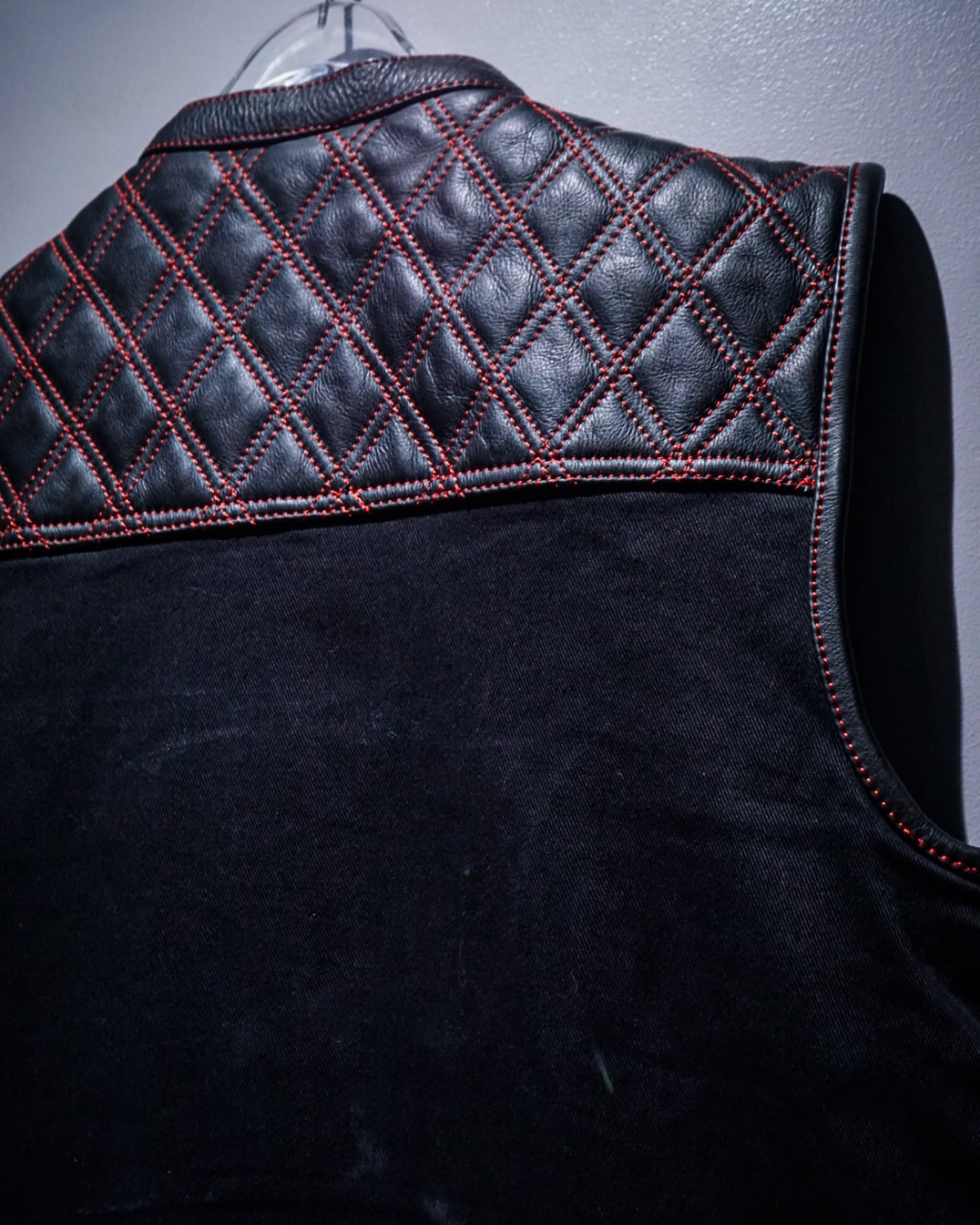 独特な表情を醸し出すブラックコットンツイルのボディに、ヨーク、フラップにレザーを切り替えたスペシャルなベスト。