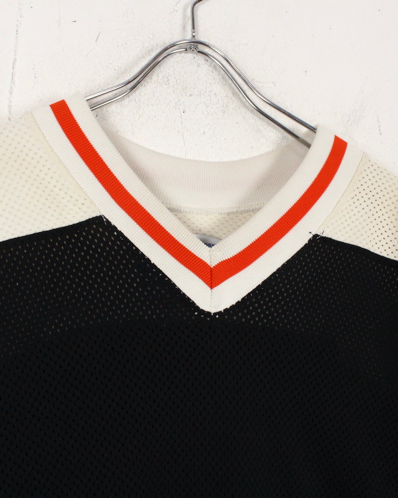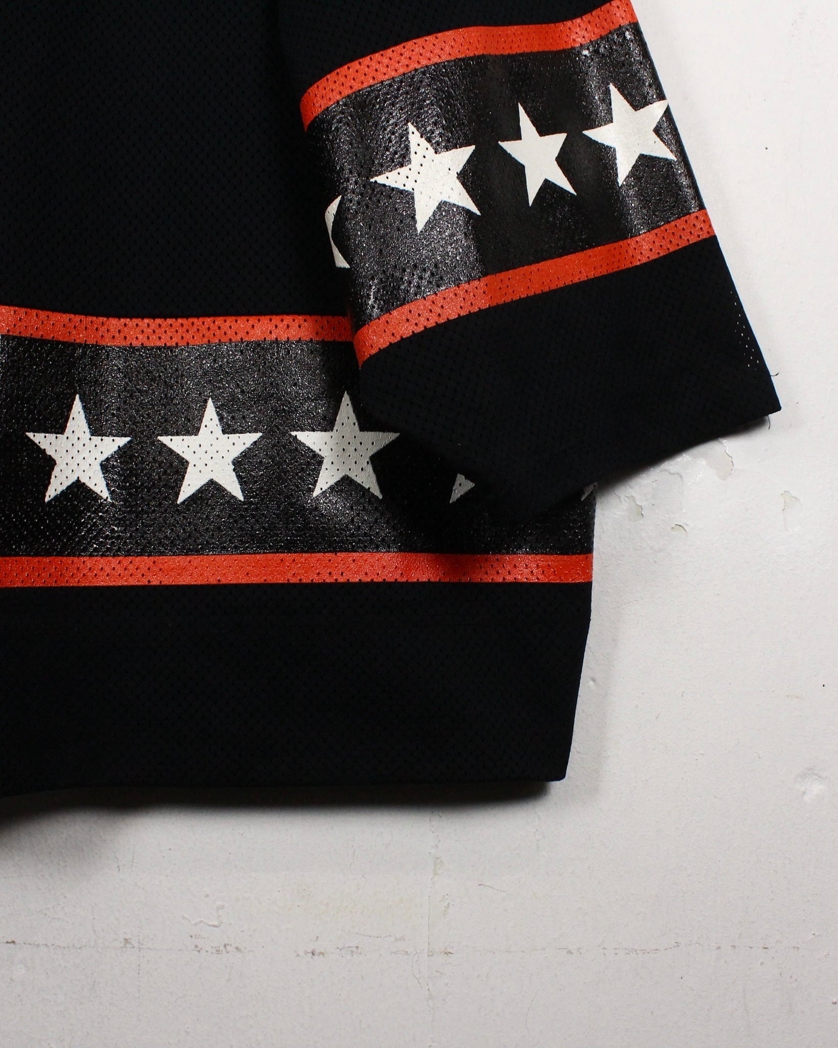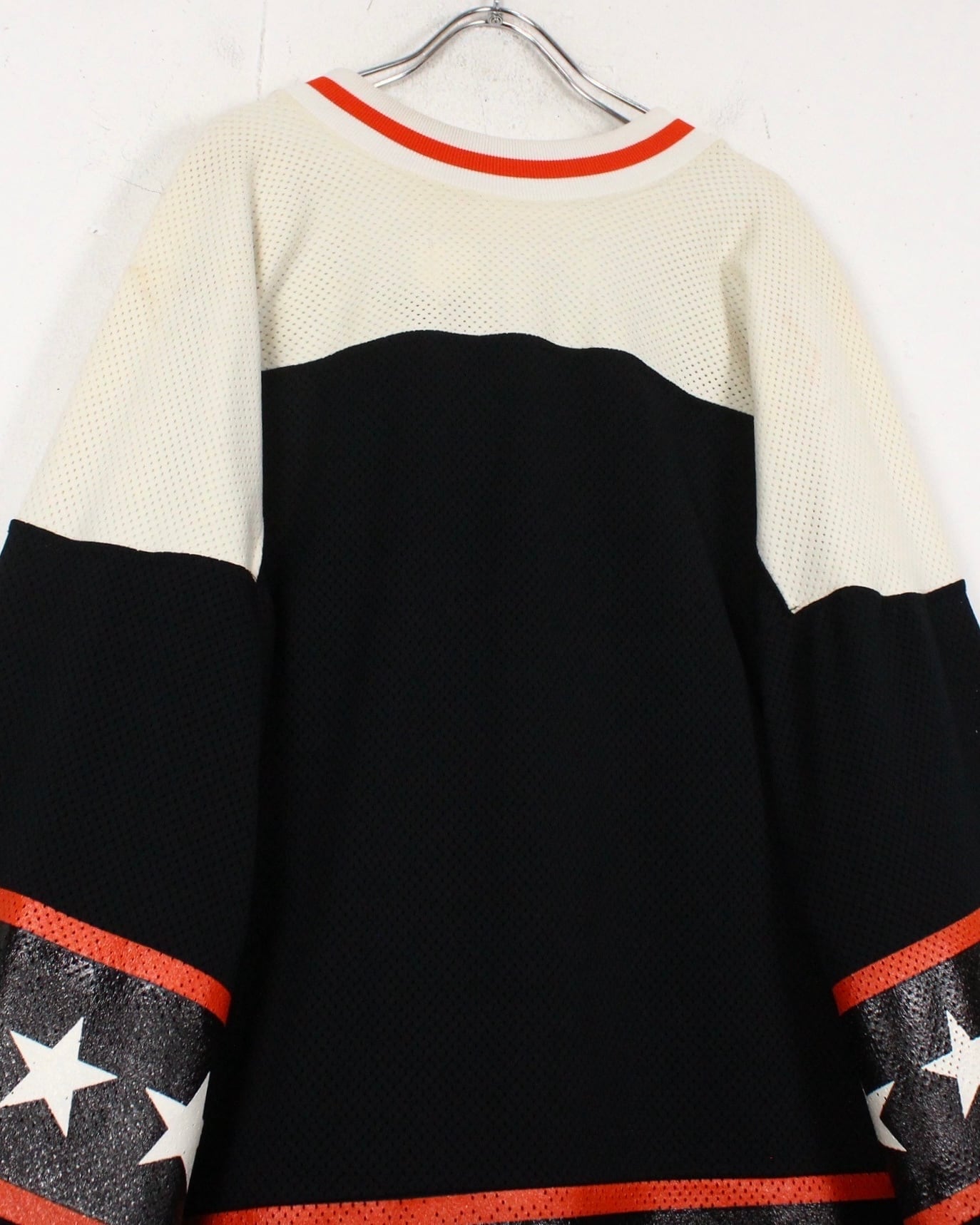 白×黒を切り替え、赤ラインのアクセントと星をプリントで載せたホッケーシャツ。