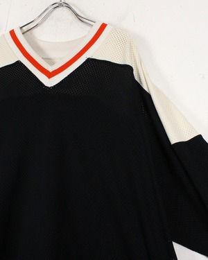 全体に配されたラインデザインや広く開いたVネック等、ホッケーシャツらしさを持ちながらファッション性にも富んだ逸品。