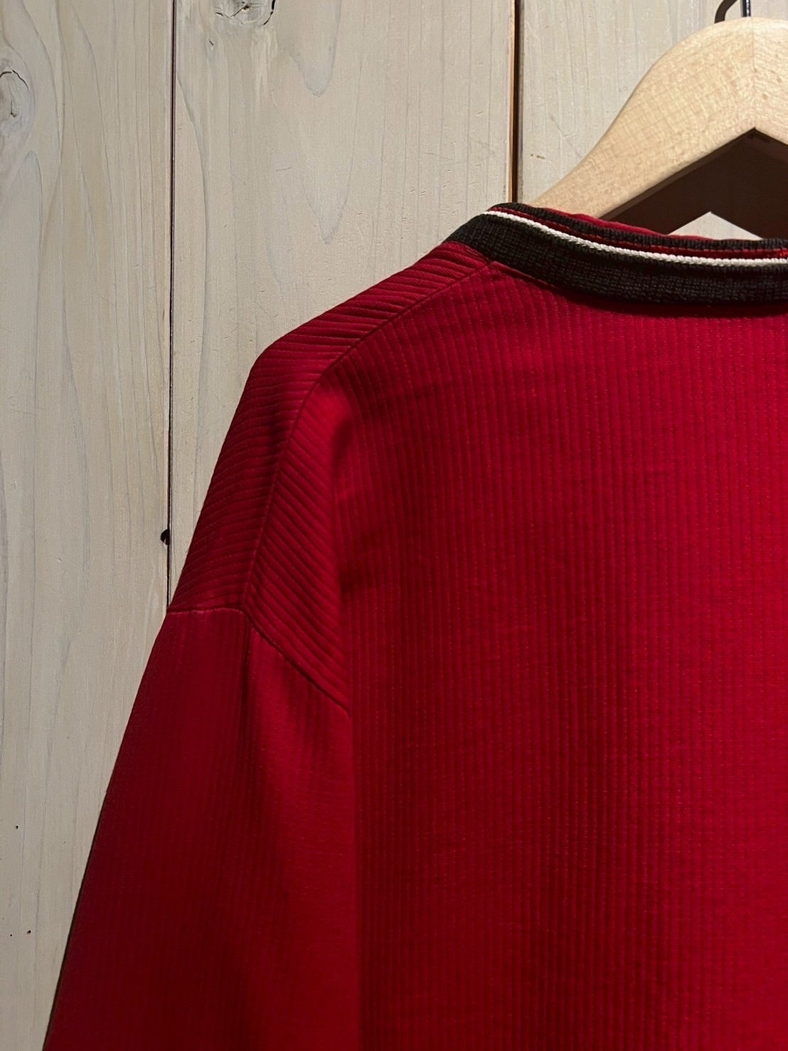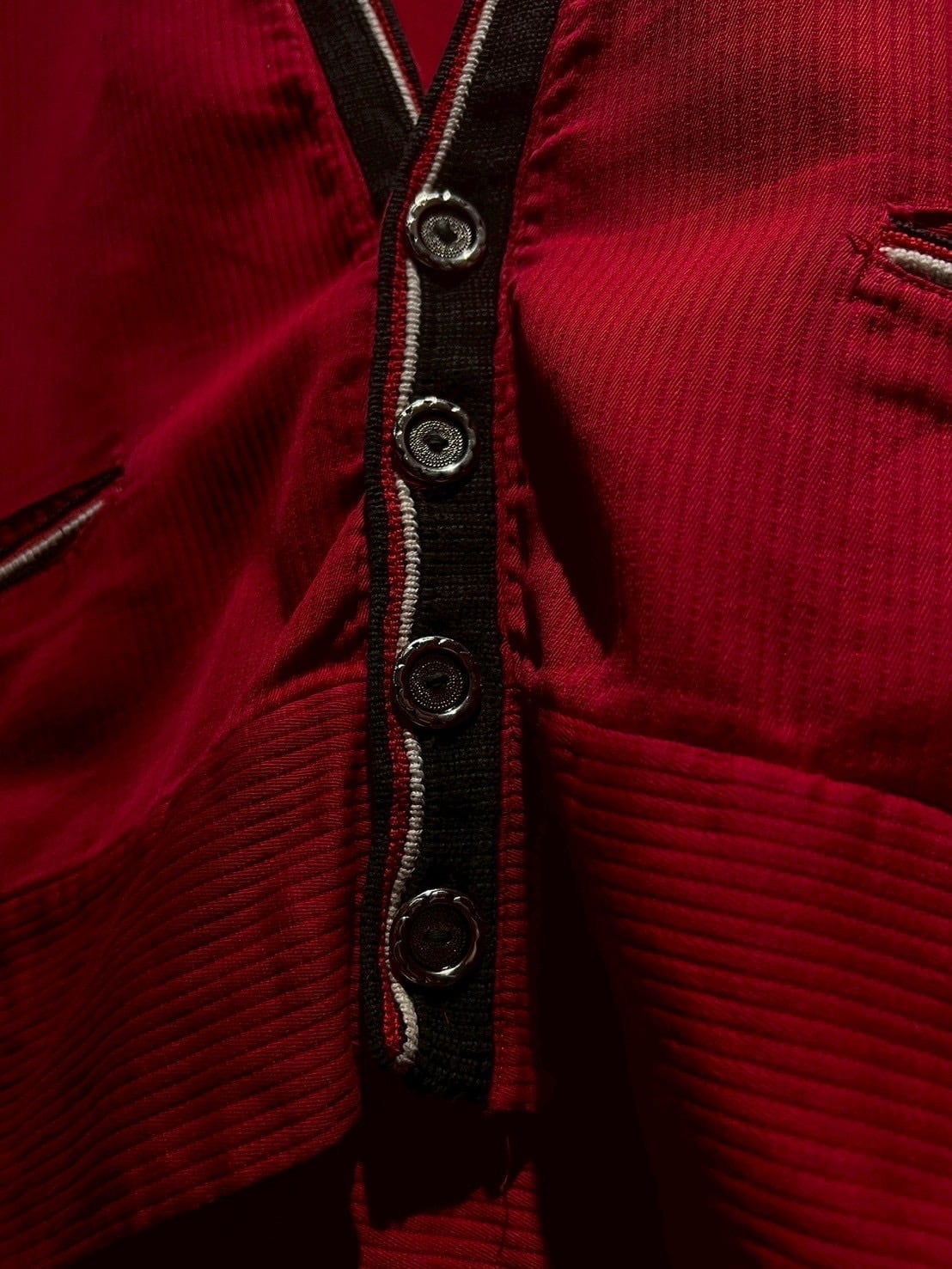 前立てや首周り、ポケットにニッティングで切り替えを施し、シンプルながらデザインのアクセントに。赤、ネイビー、白のトリコロールカラー、デザインの効いたシルバーのボタン使いも洒落てますね。ミニマルな作りですが、細やかなディテールに心惹かれます。