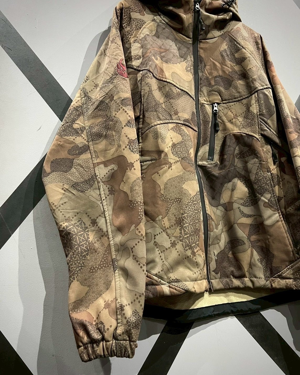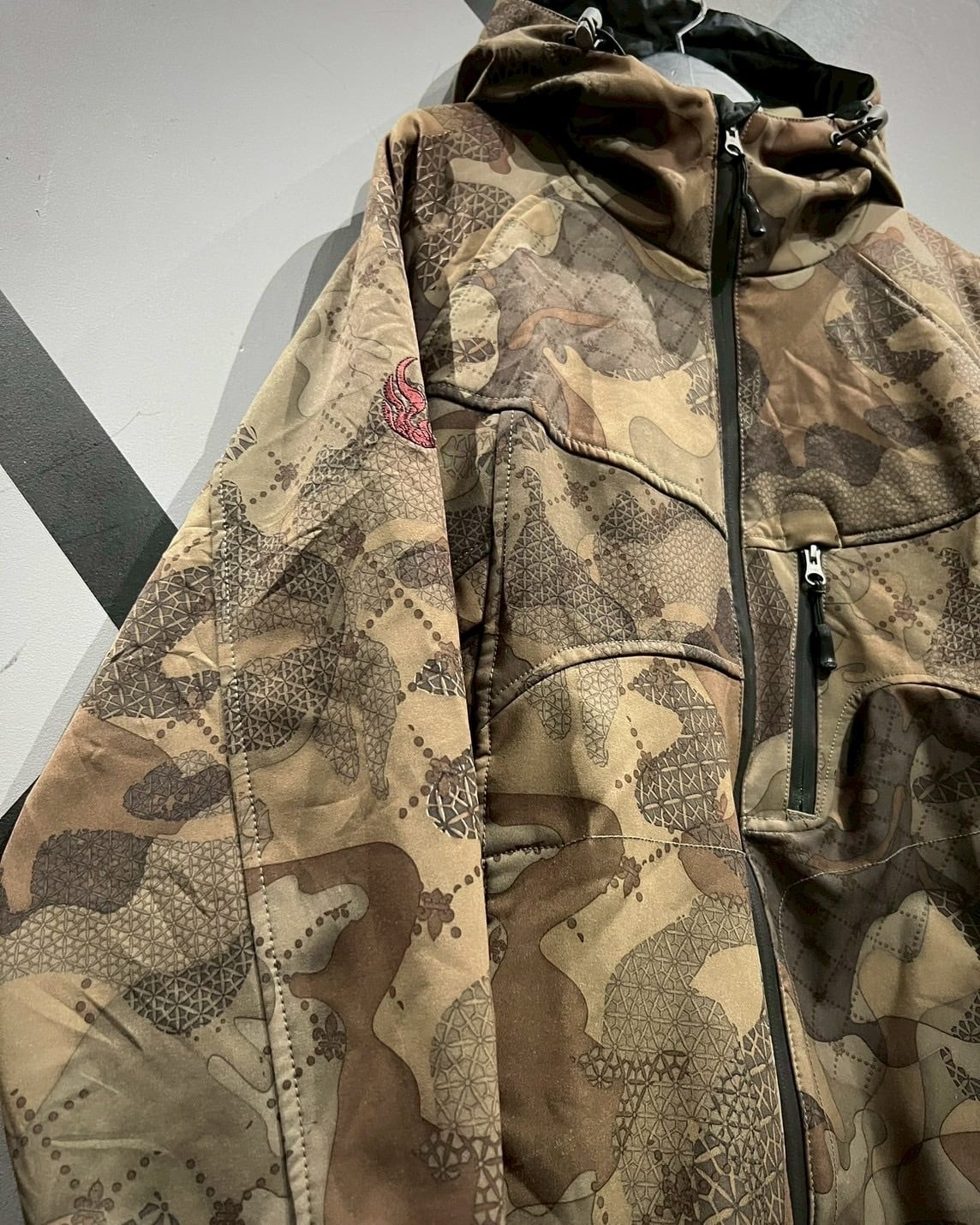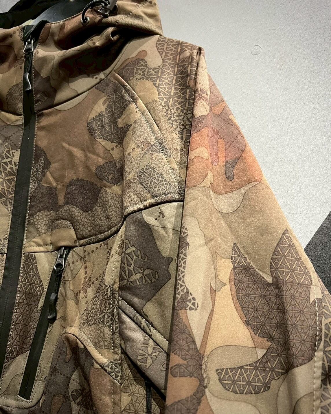 ミリタリー由来のカモフラージュパターンをベースにしながら、幾何学的なドットや三角形のモチーフを組み合わせた、稀有なカモ柄ギアジャケット。