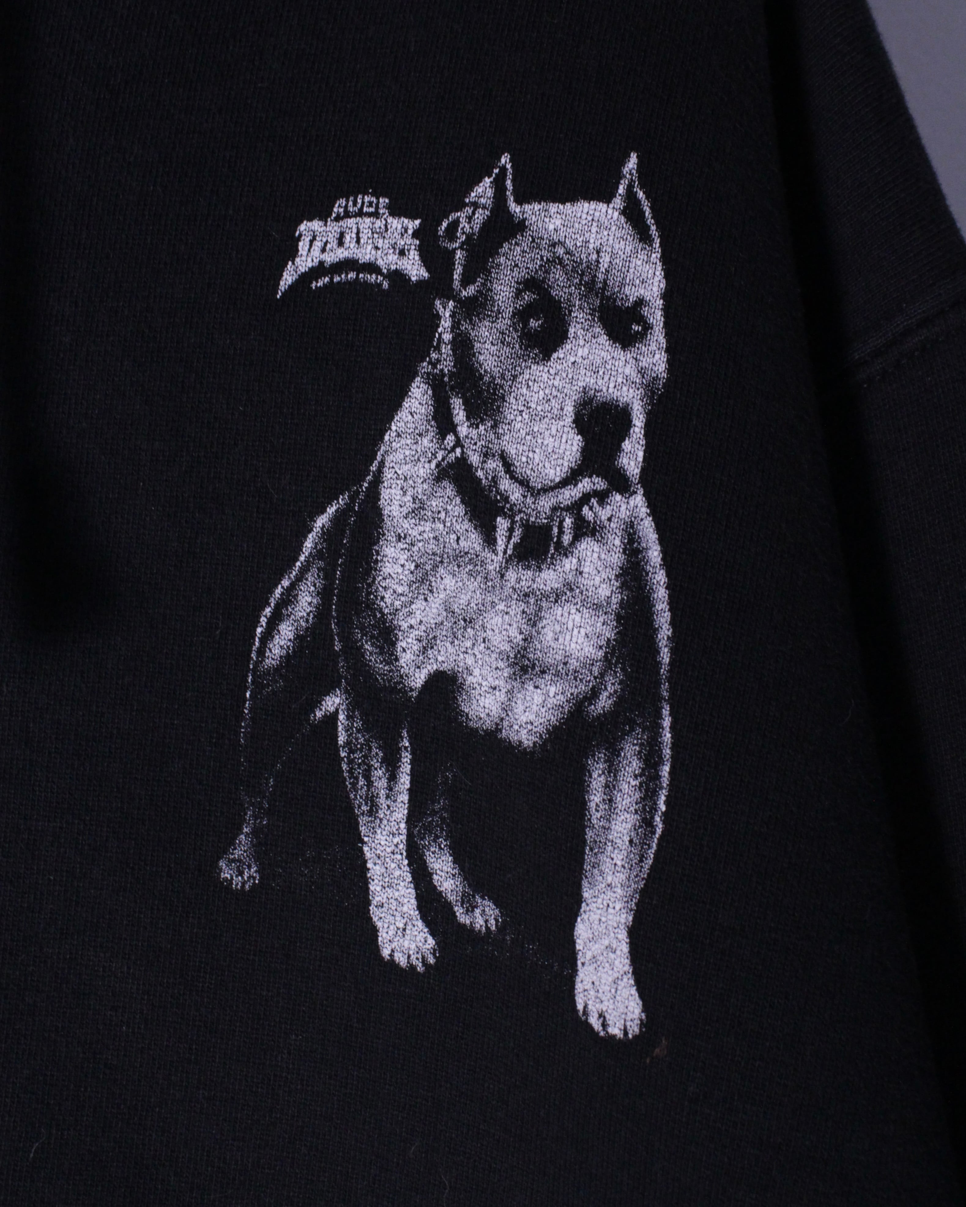 ハリのあるブラックのボディに、チェーンの首輪をしたピットブルをプリントで載せたプルオーバーフーディ。