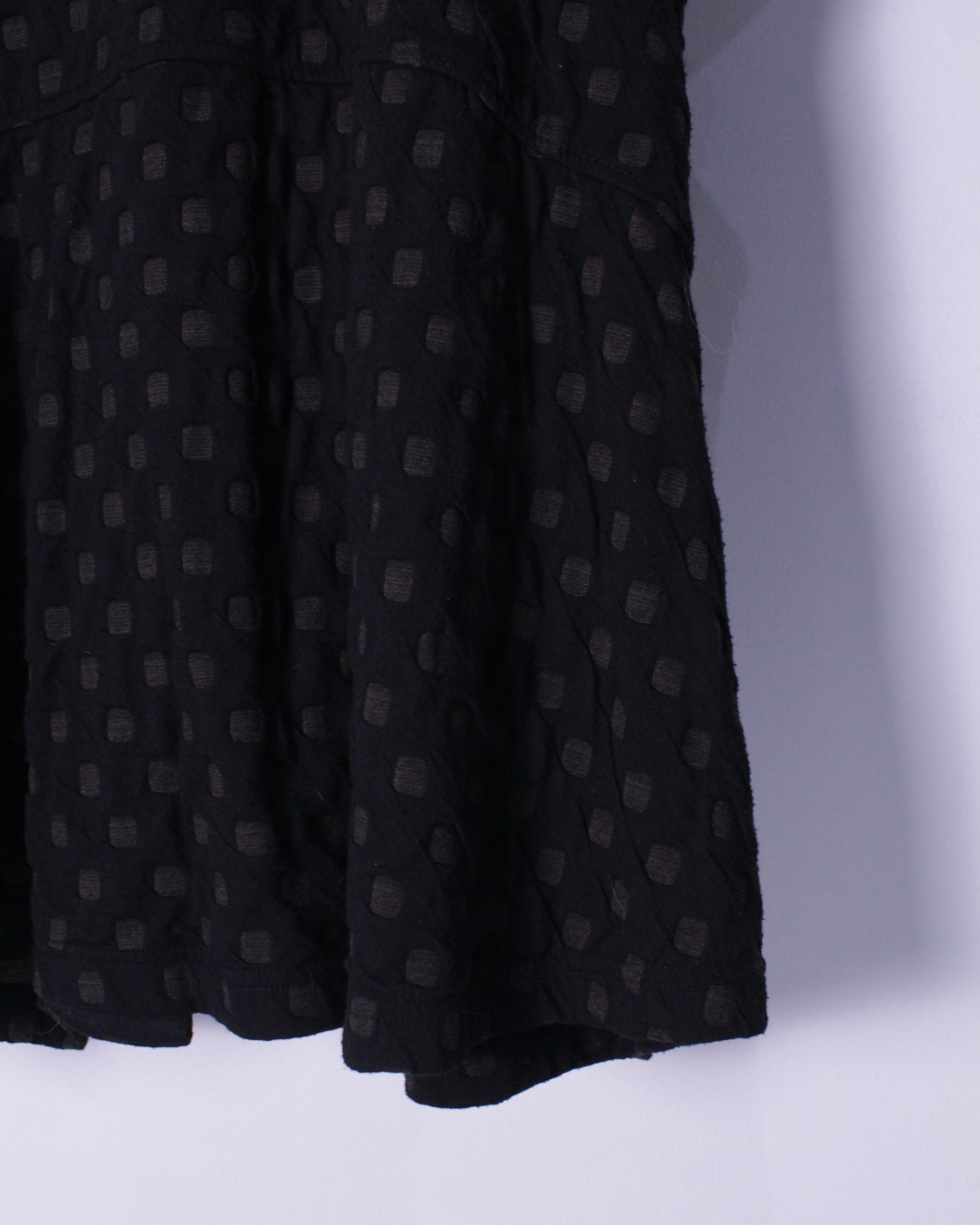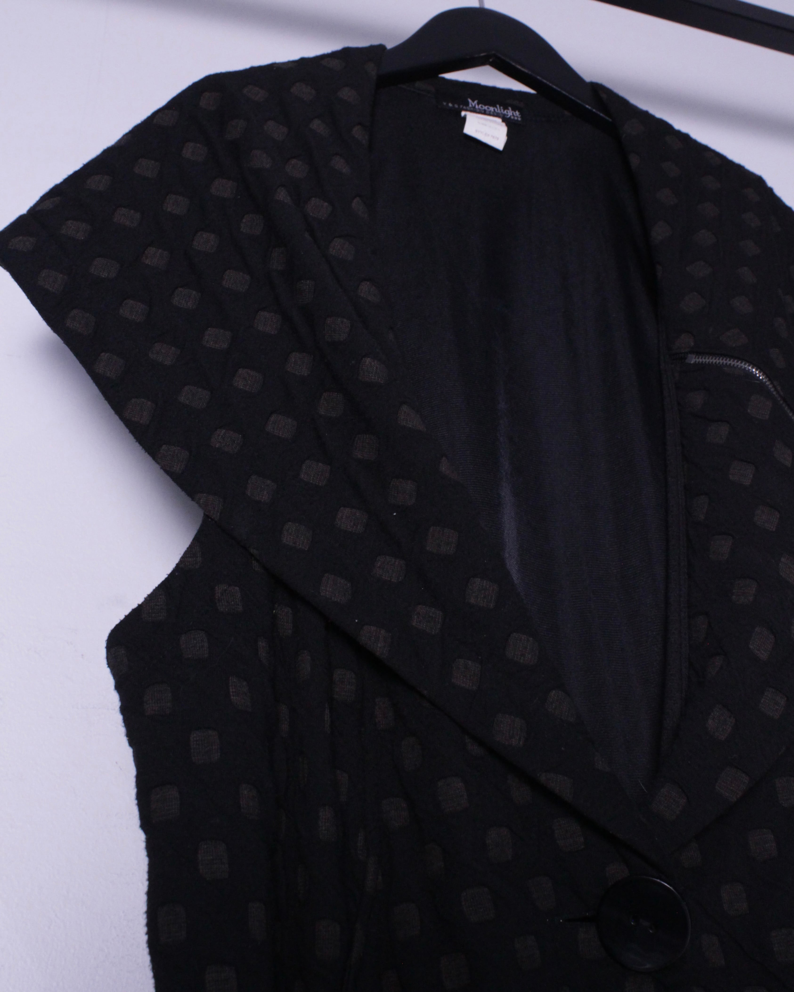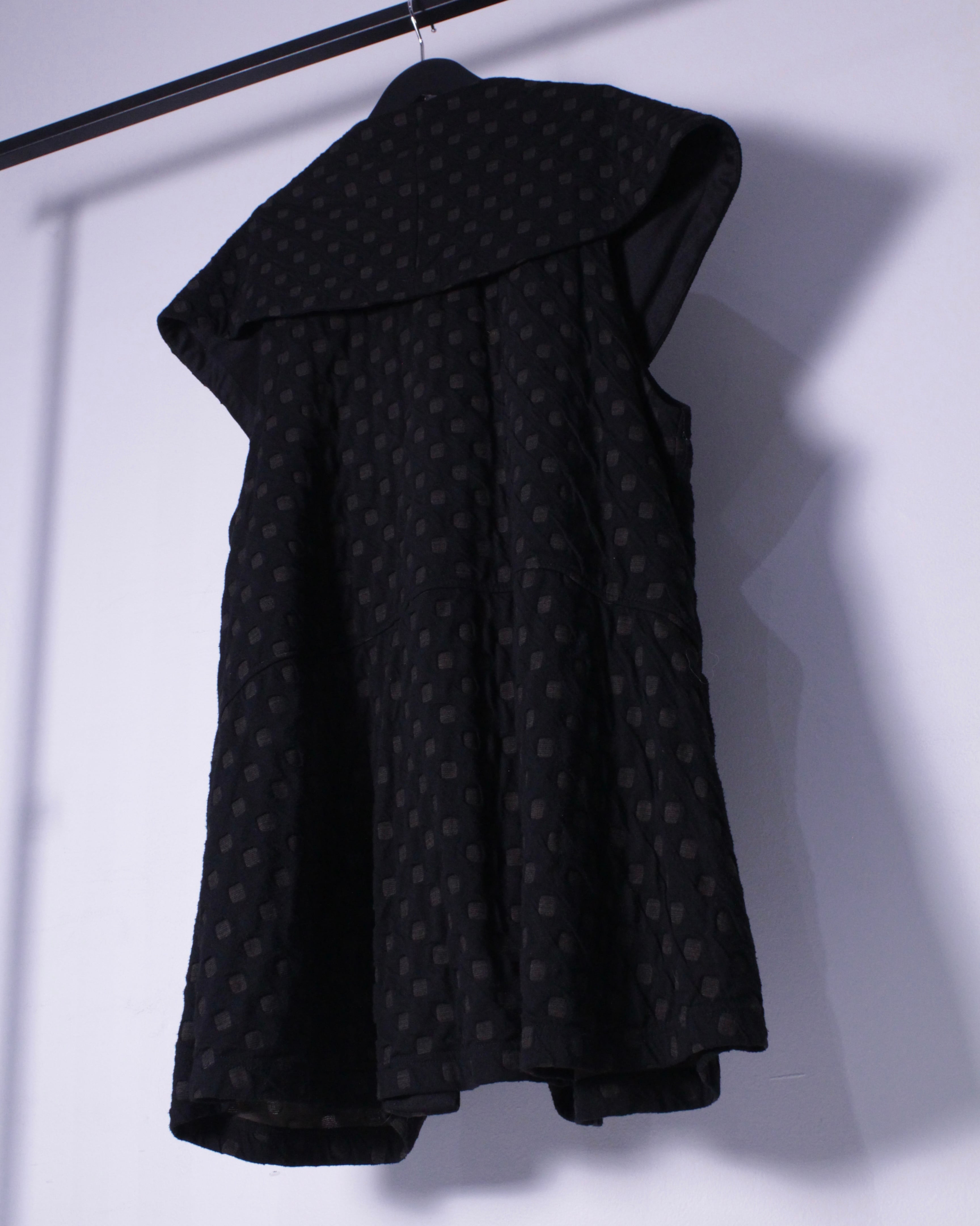 フワッと柔らかなブラックのボディに、スクエア柄を織りで表現した"変形"タイプのベスト。