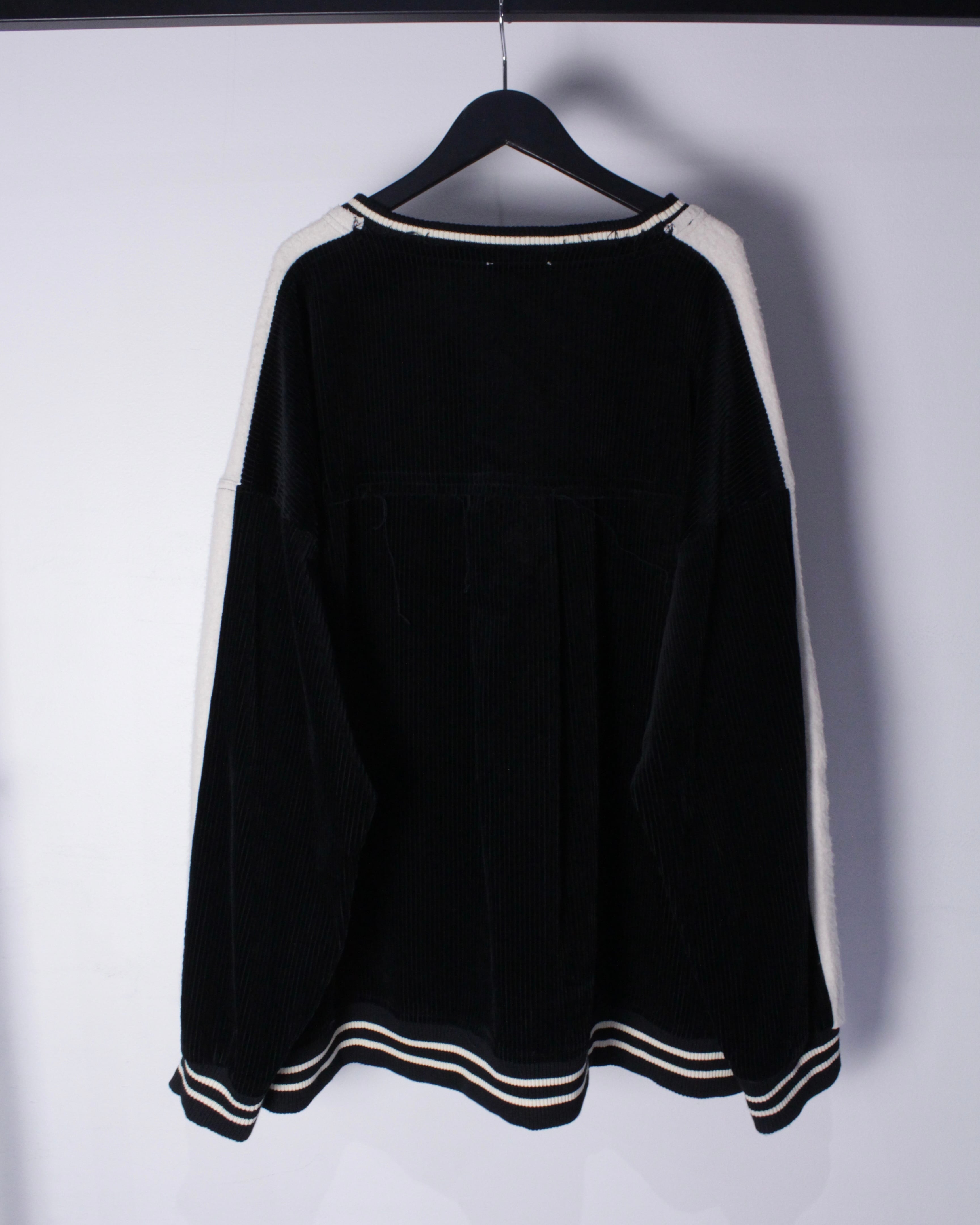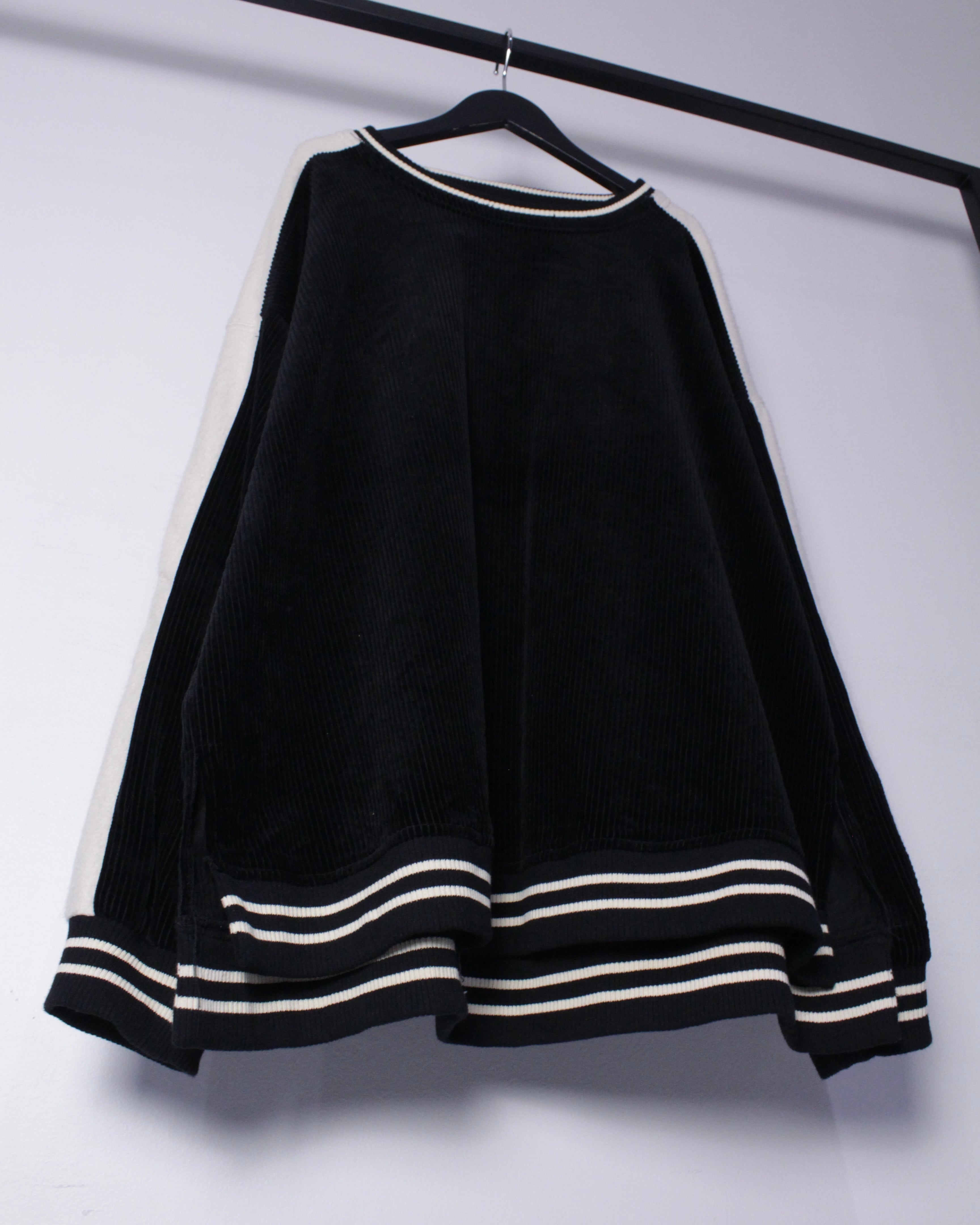 ベロアのような生地感のブラックコーデュロイを用いたボディに、肩からアームにかけてフェルト風のテキスタイルを切り替えたプルオーバー。