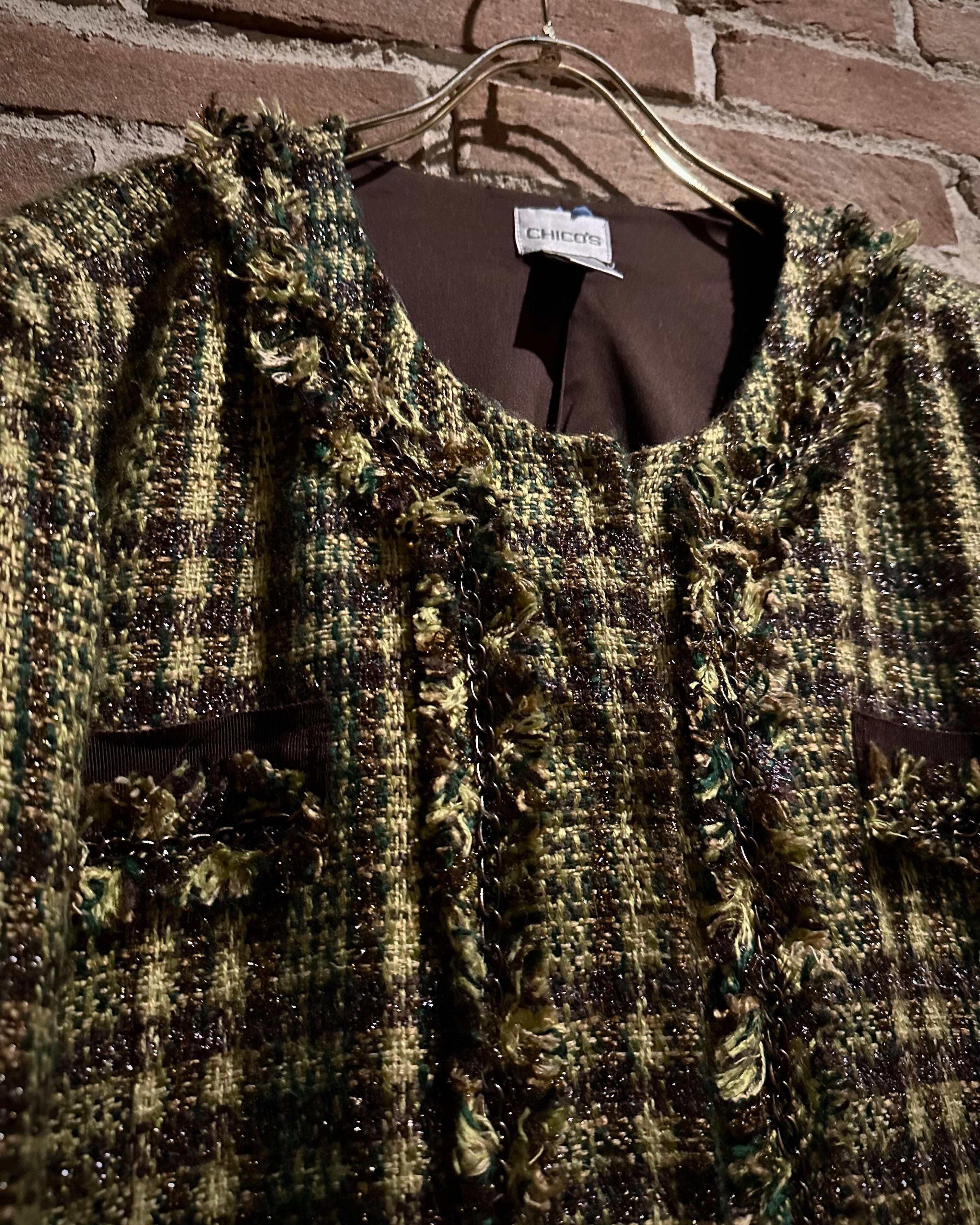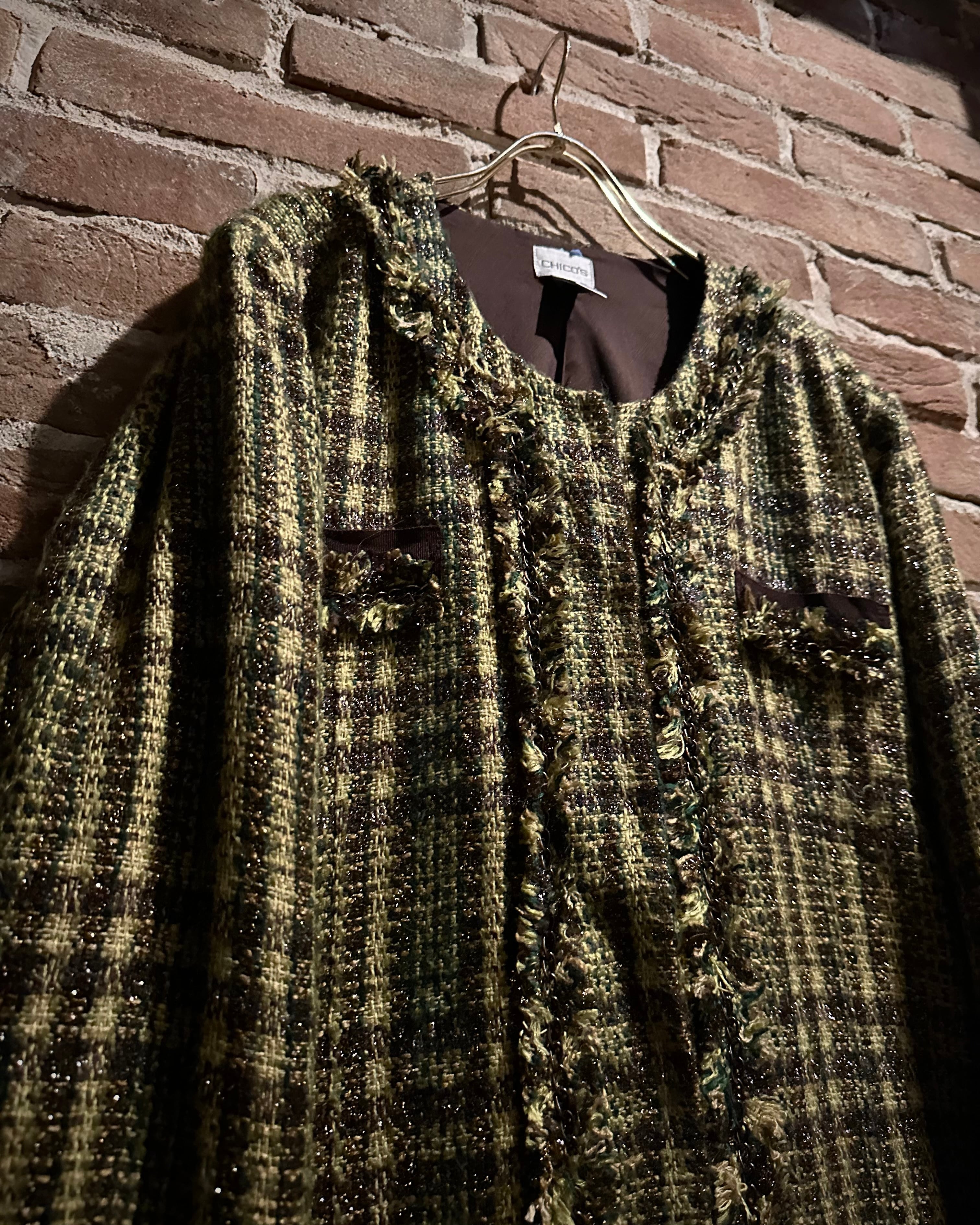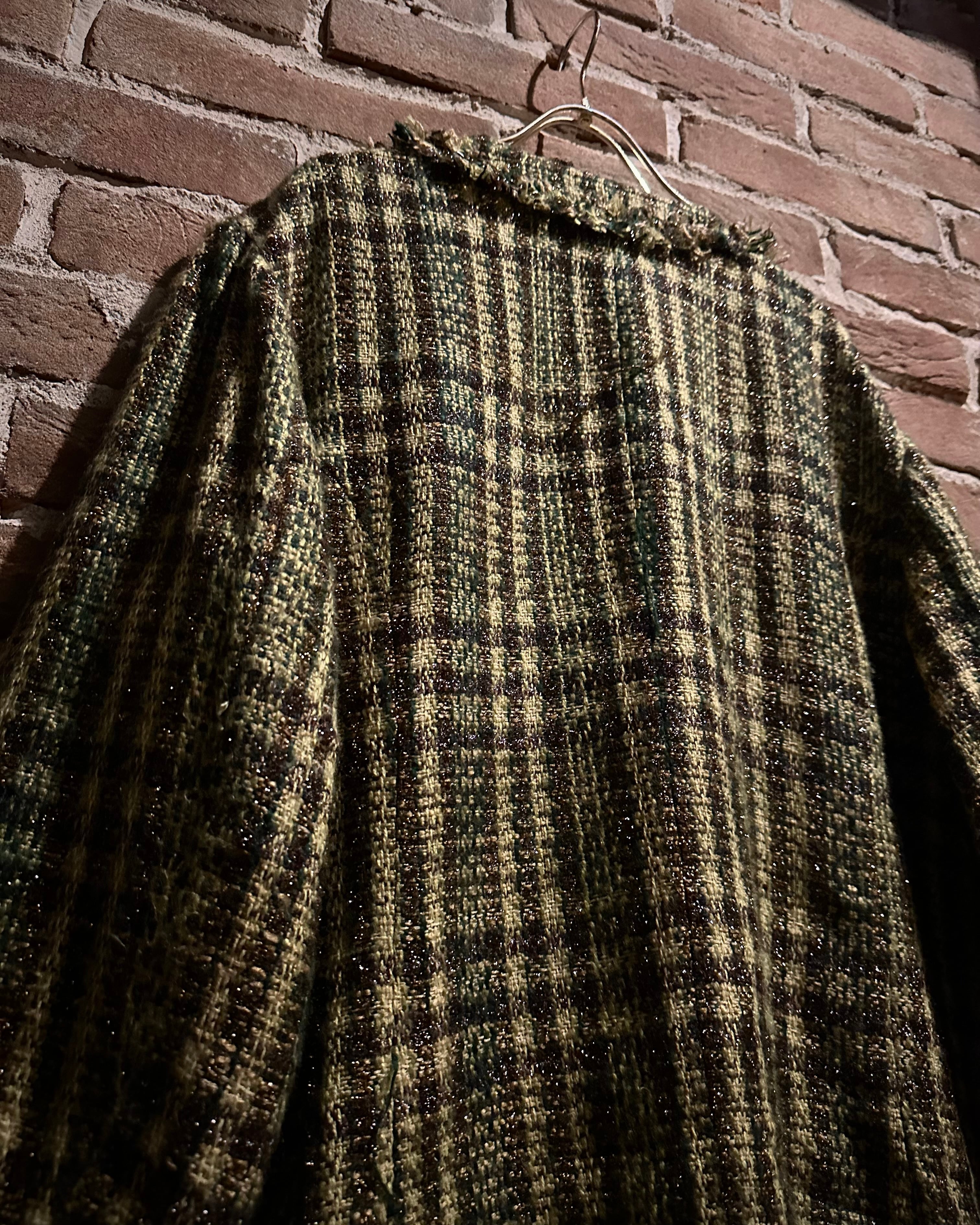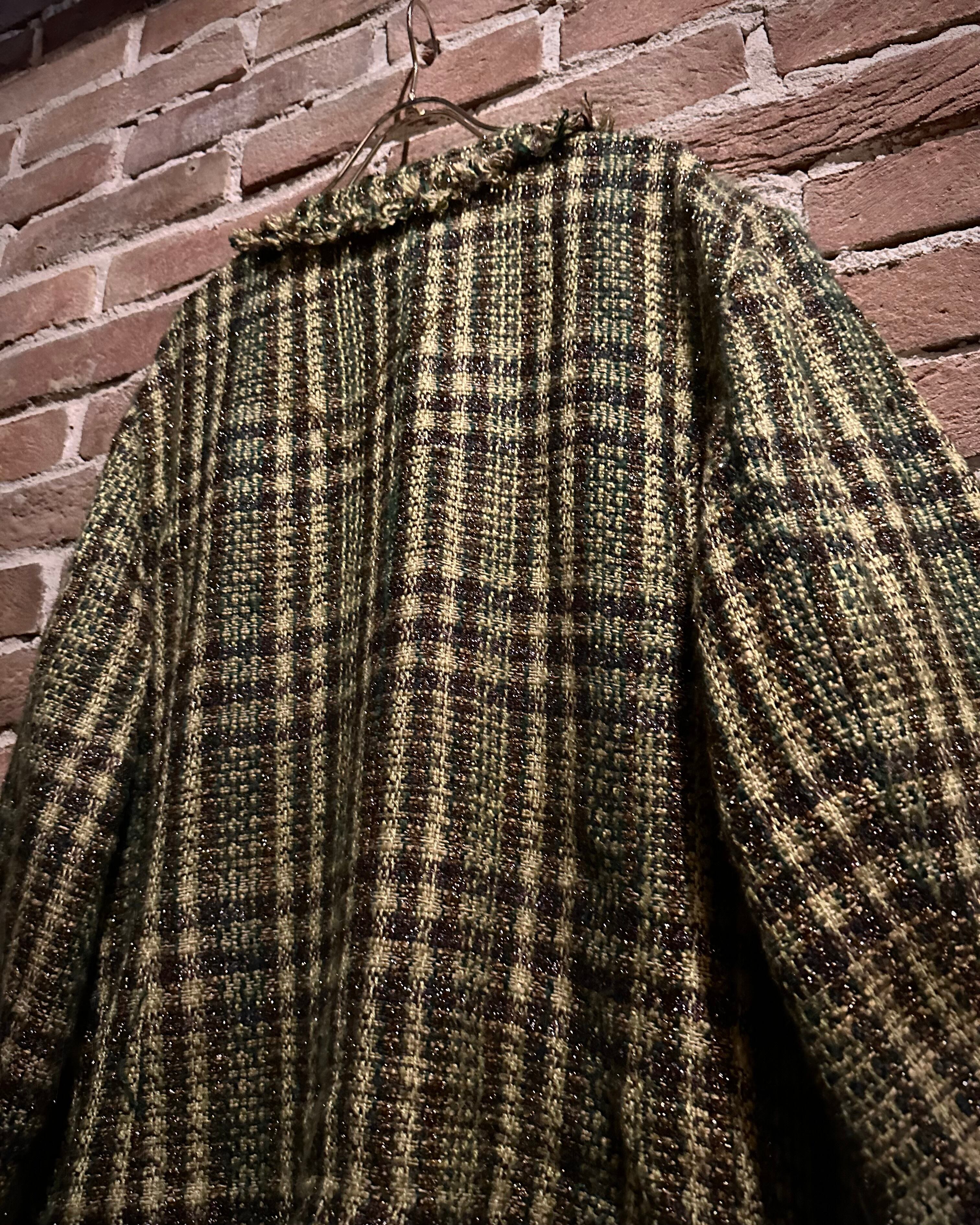 黄色、茶、緑のカラーリングを用いて、織りによってチェック柄を表現したツイードジャケット。