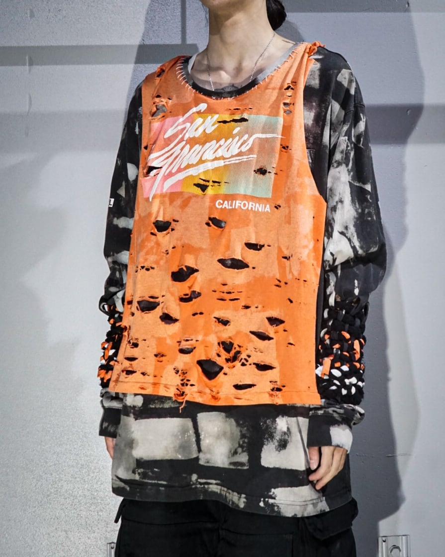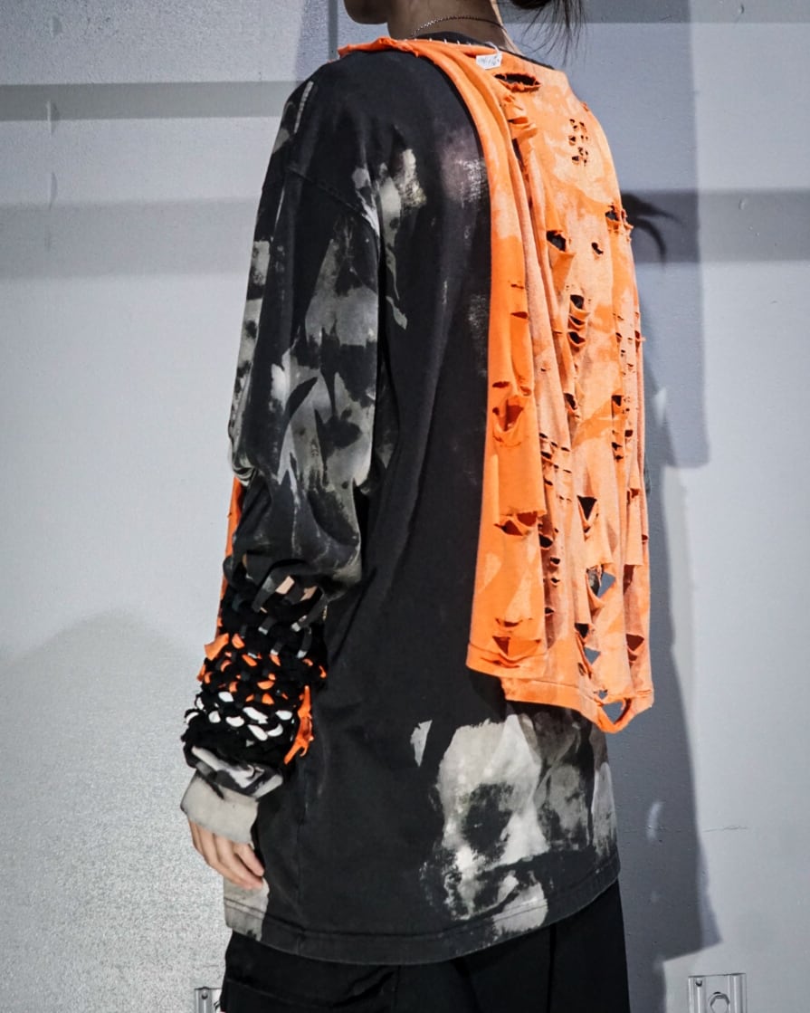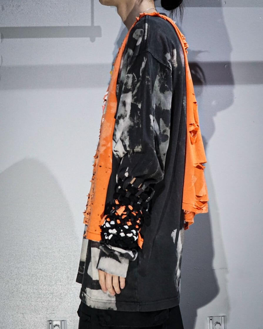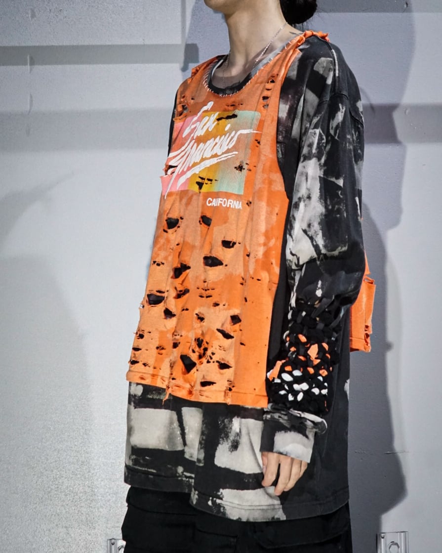"Original Remake"シリーズより、ランダムにブリーチしたロンTのボディに、ダメージ加工したカットソーをベスト風にレイヤードしたスペシャルな1着。