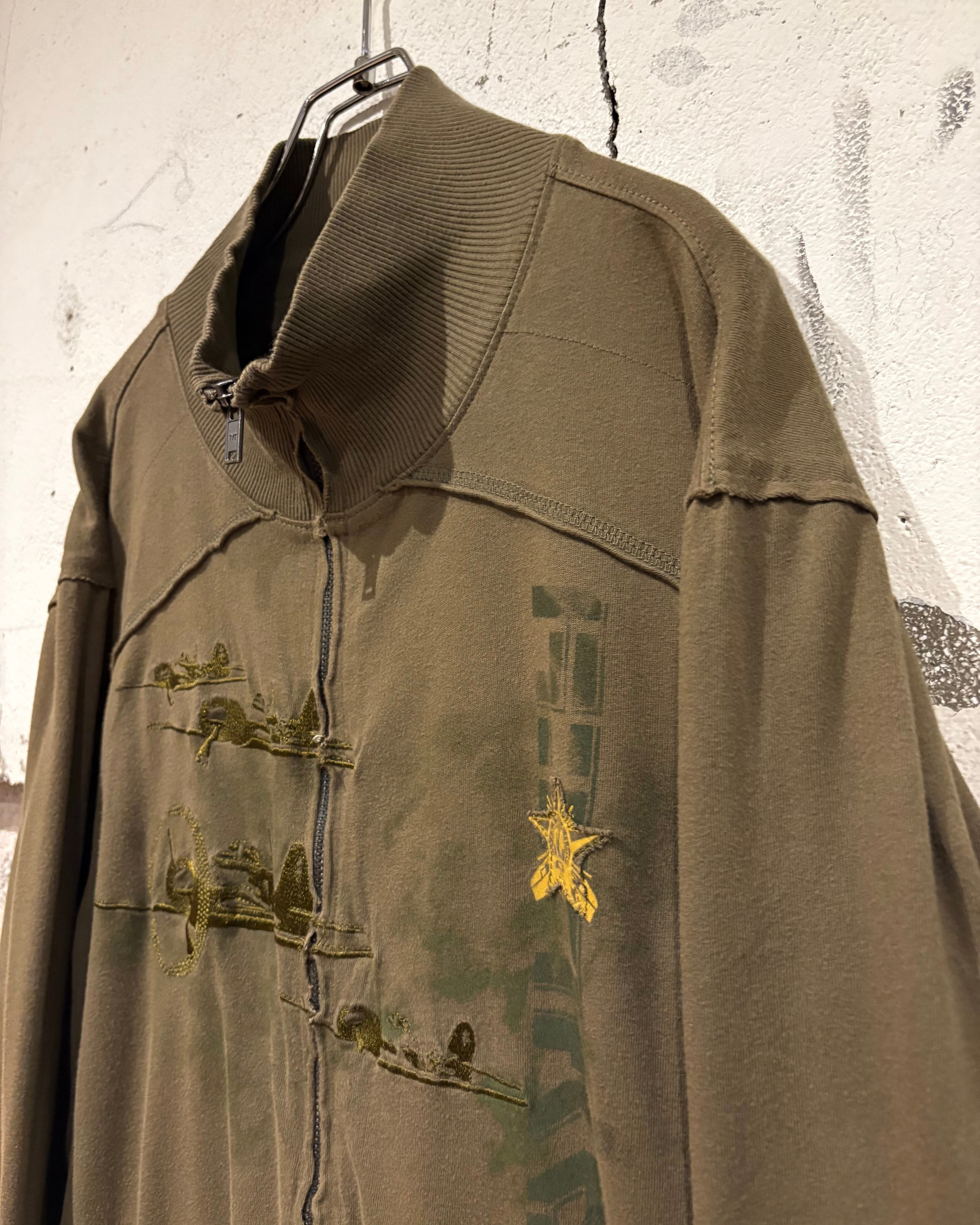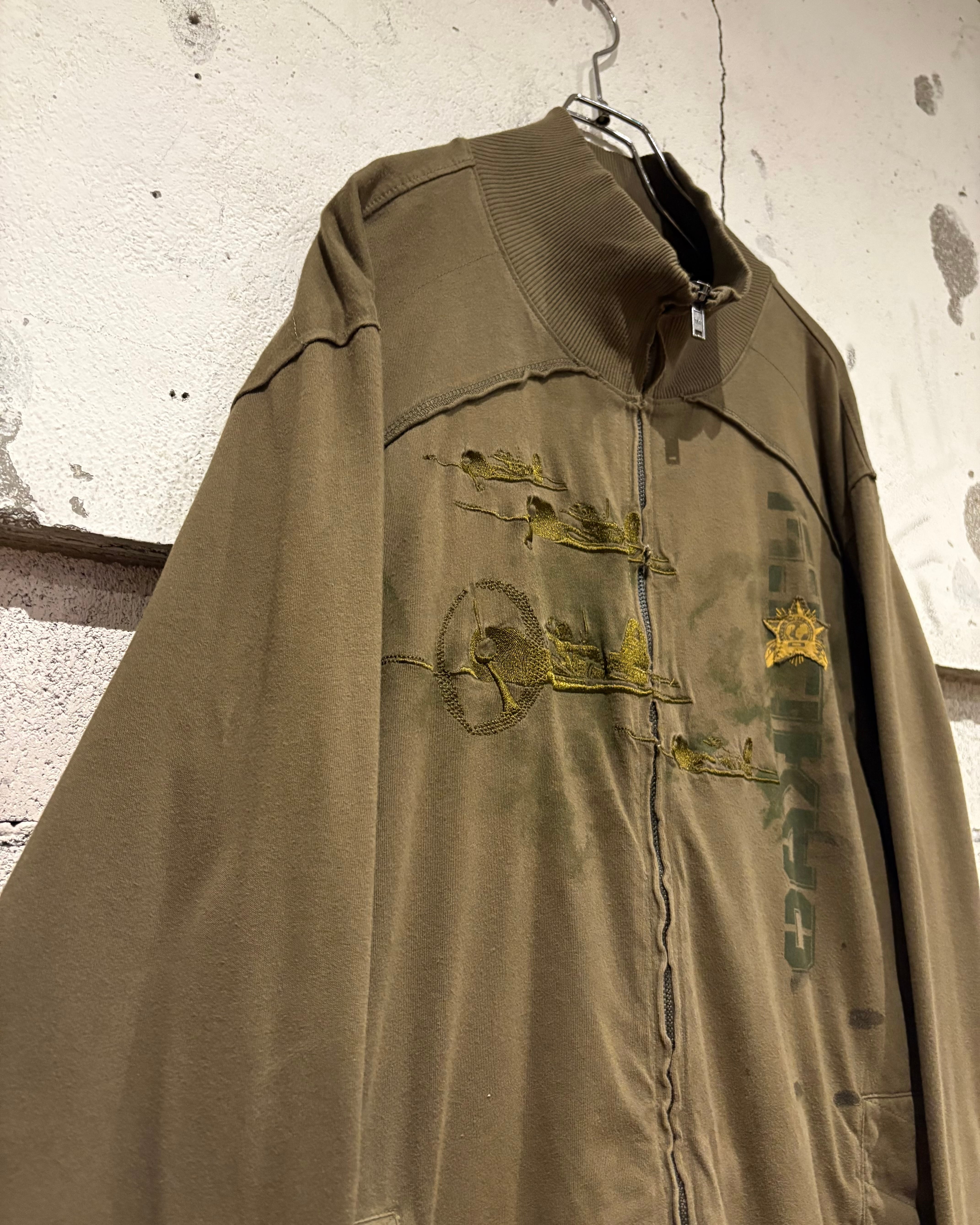 ブラウンのスウェット生地に、フロントには航空機の刺繍、左胸には階級章のようなパッチにプリント、ブランドネームをプリントで載せたジップアップスウェットジャケット。