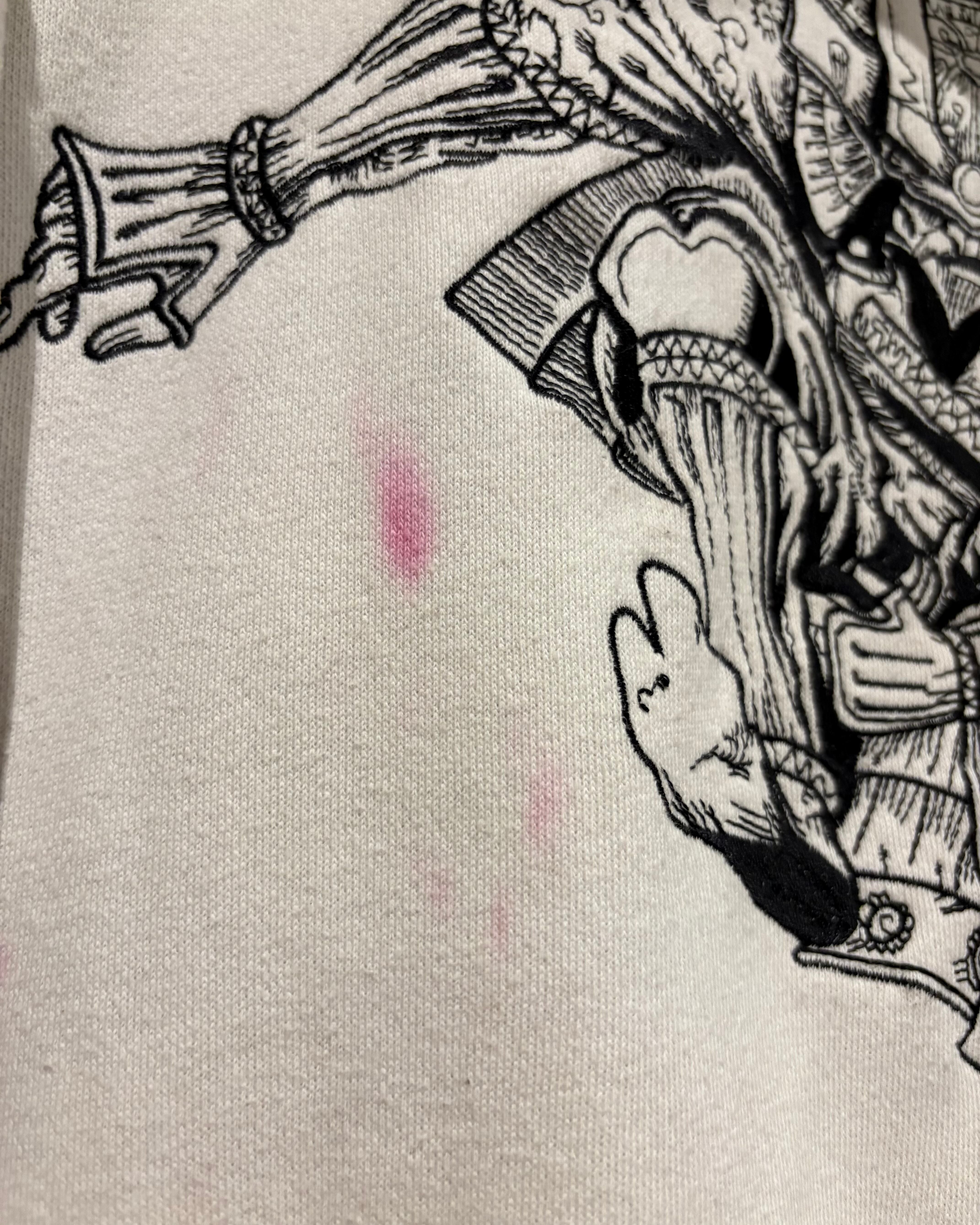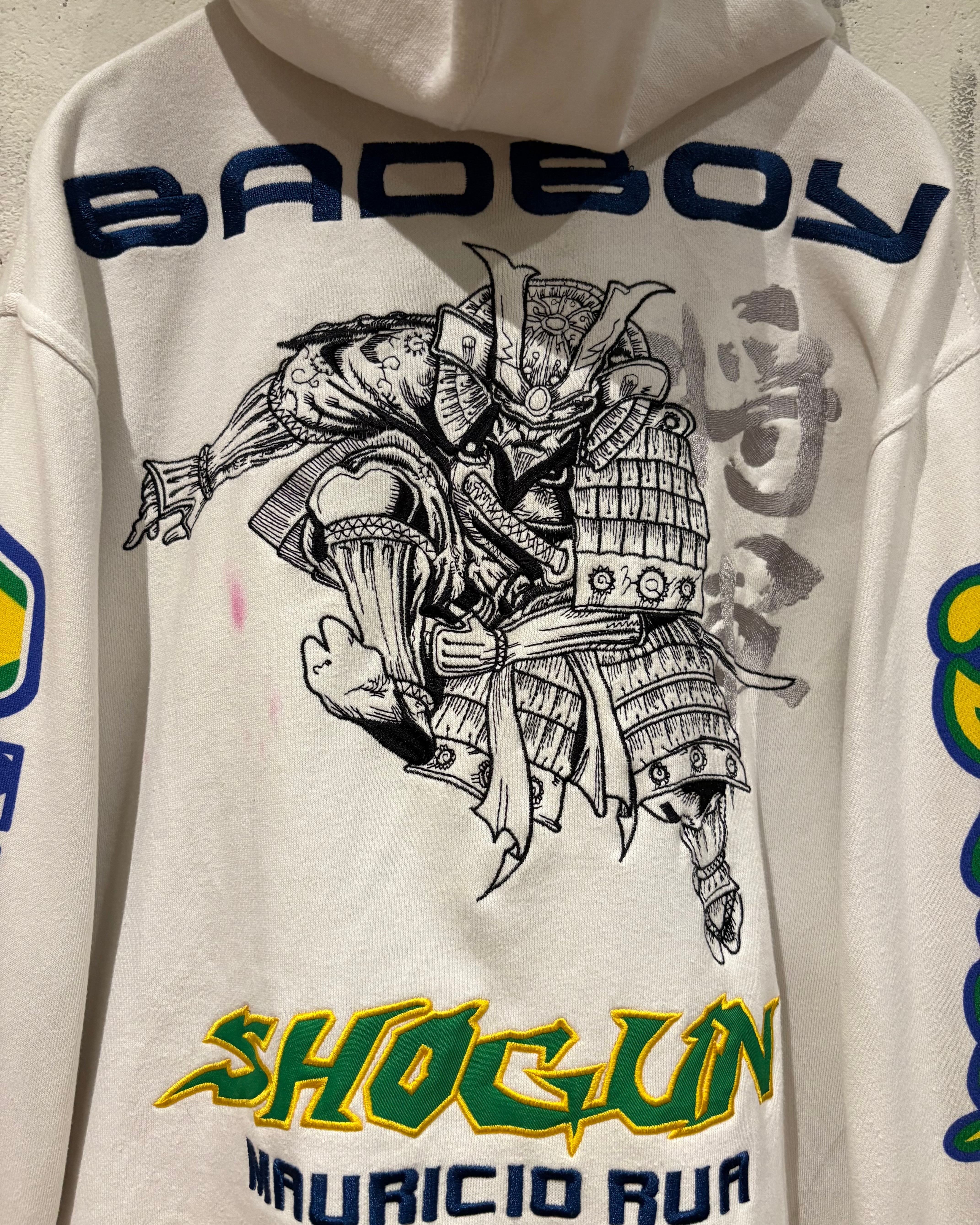 白のボディをベースに、フロントにはロゴ、背面には"将軍"の漢字と共に将軍の姿を緻密な刺繍で表現したジップアップフーディ。