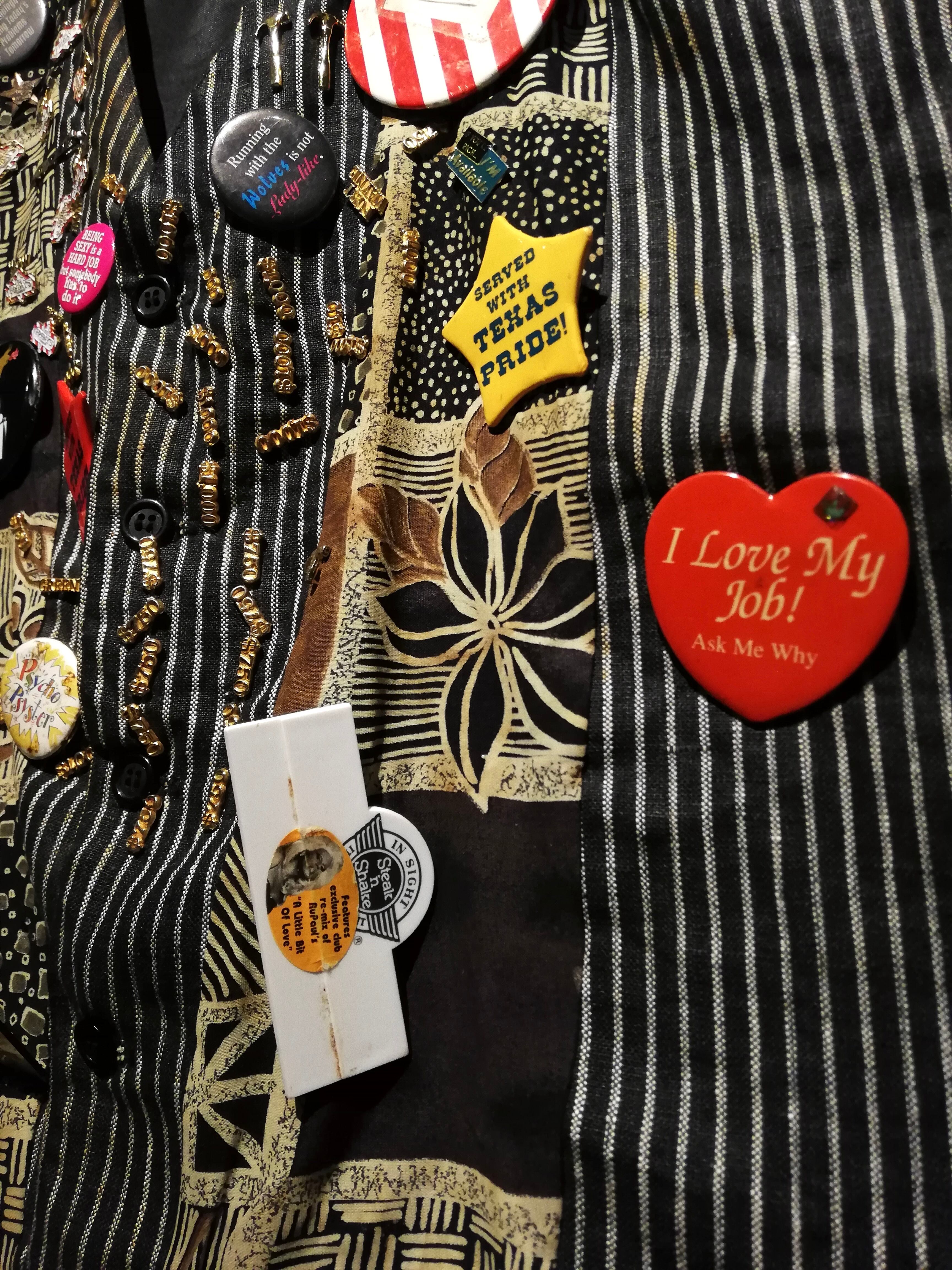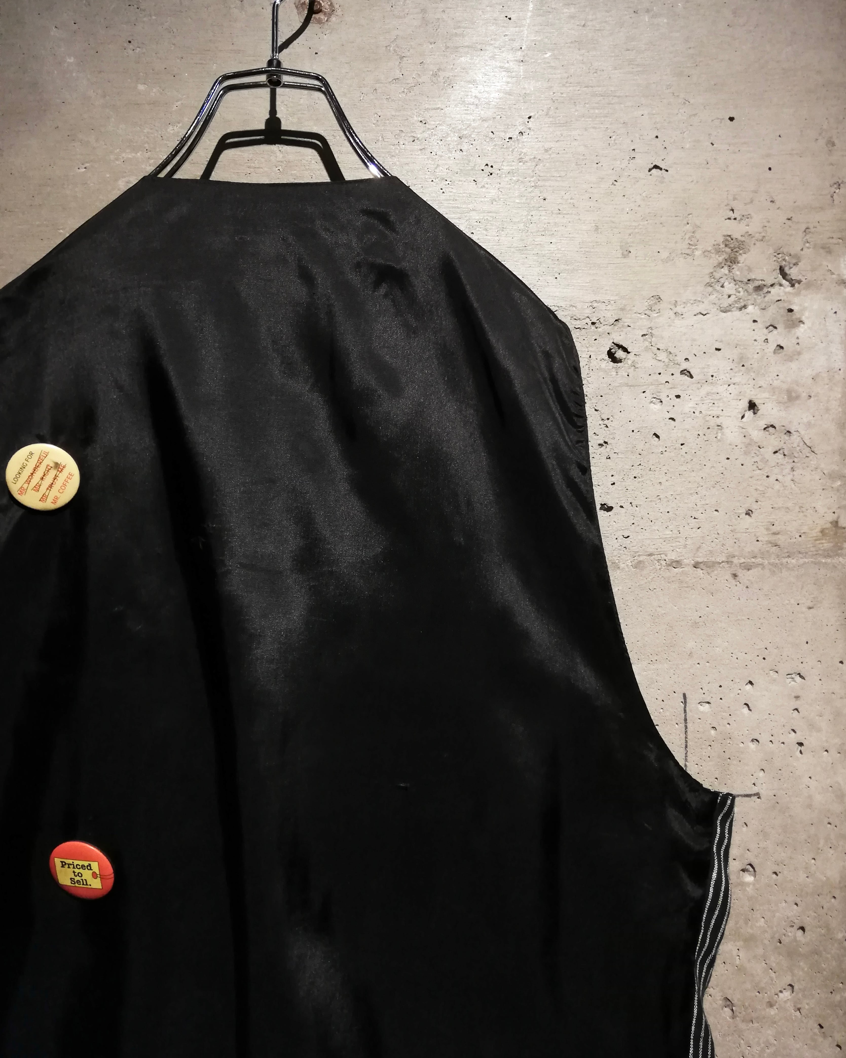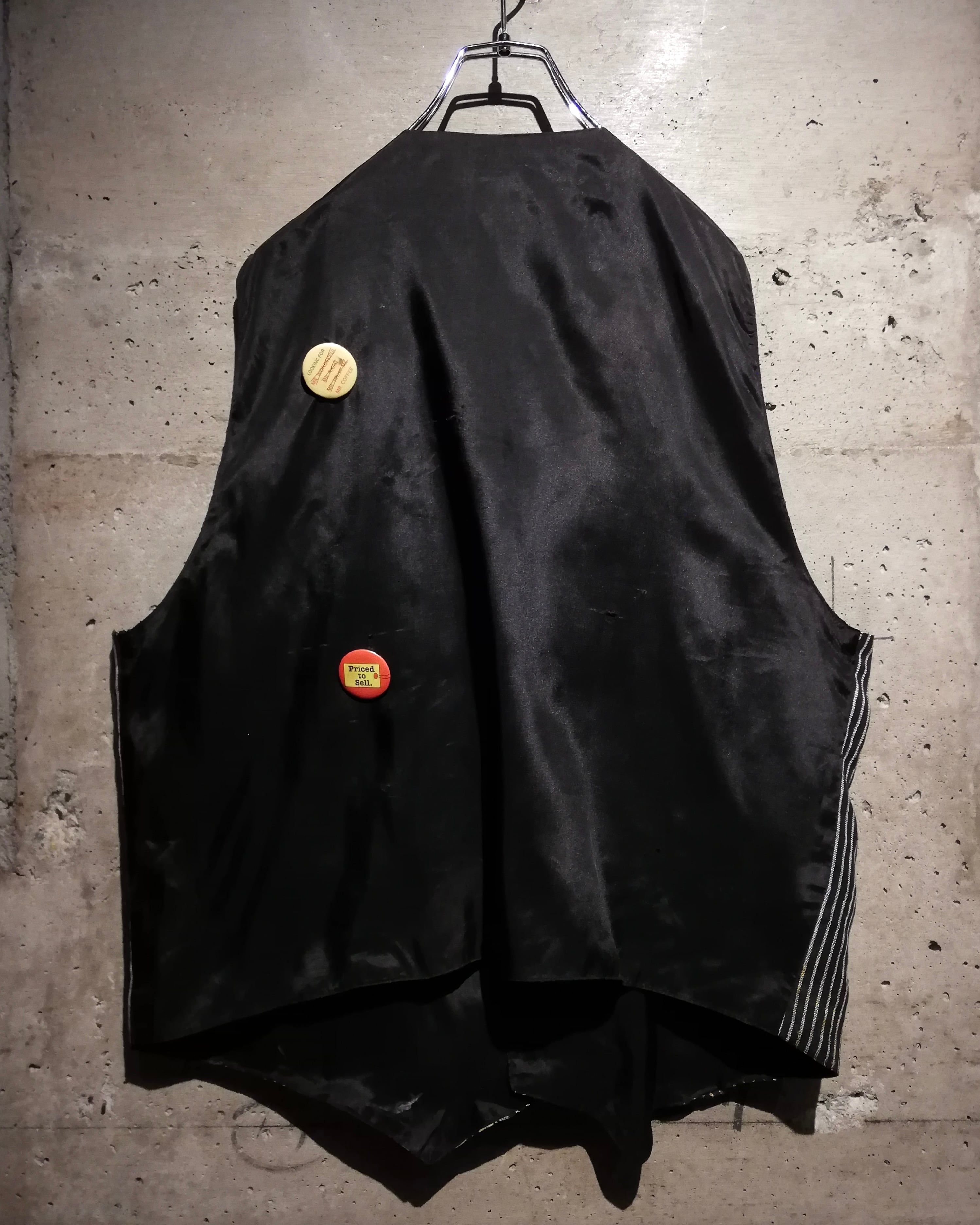 ストライプ×エスニックな柄が切り替えられたボディに、ピンズやバッジによるカスタムが施されたスペシャルなベスト。