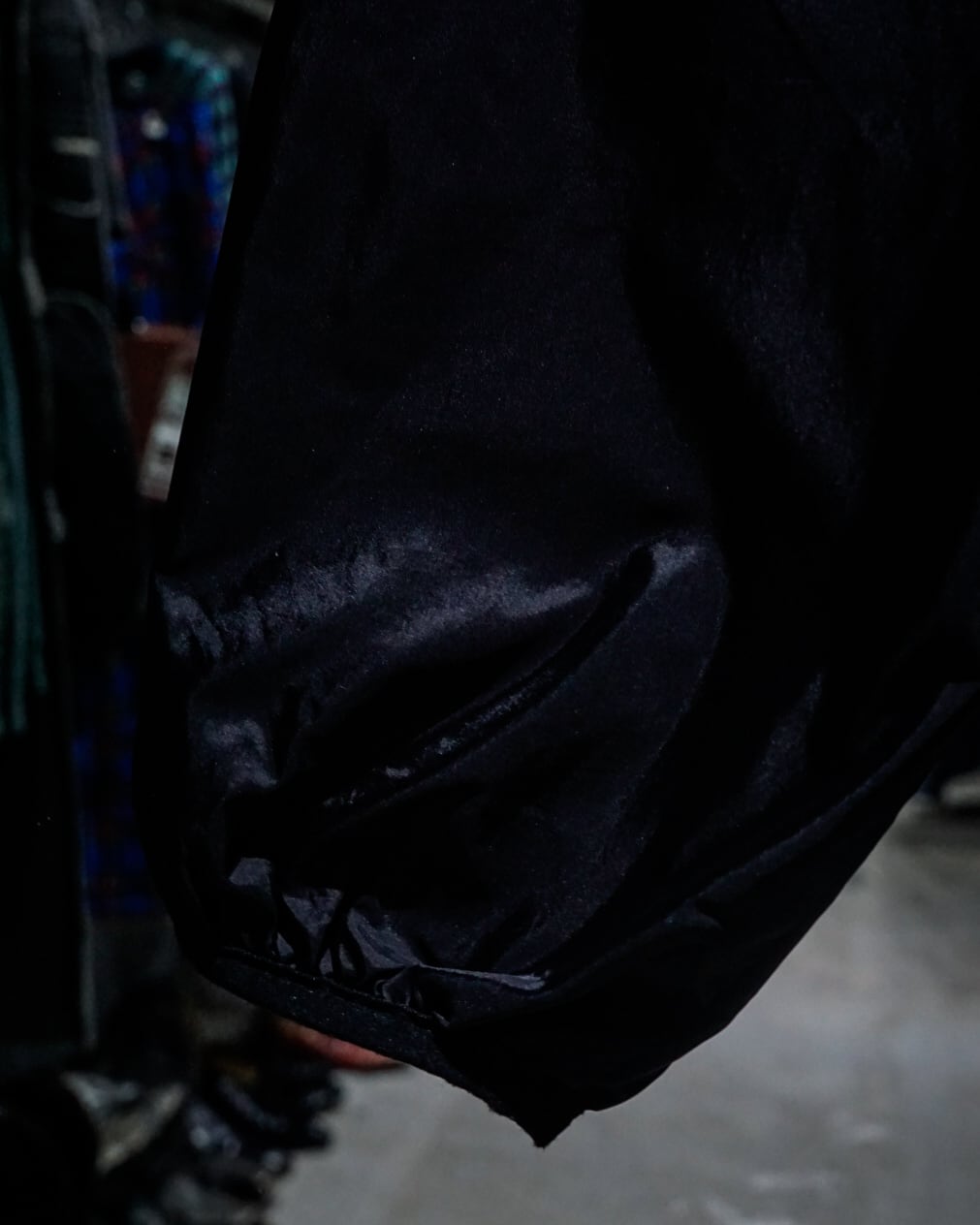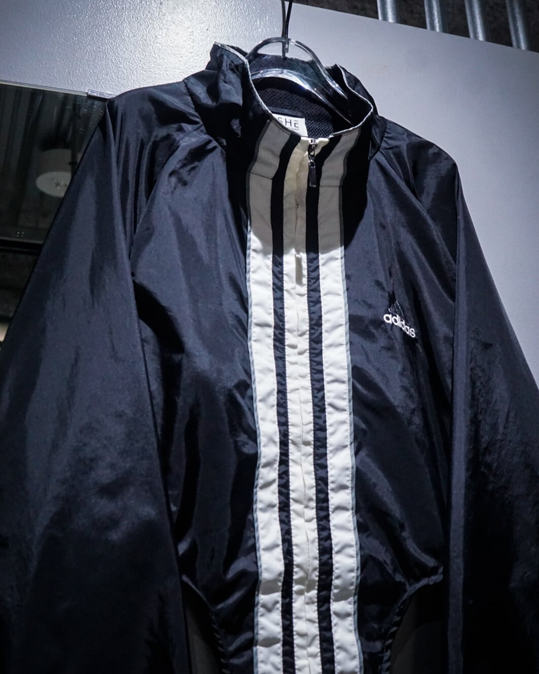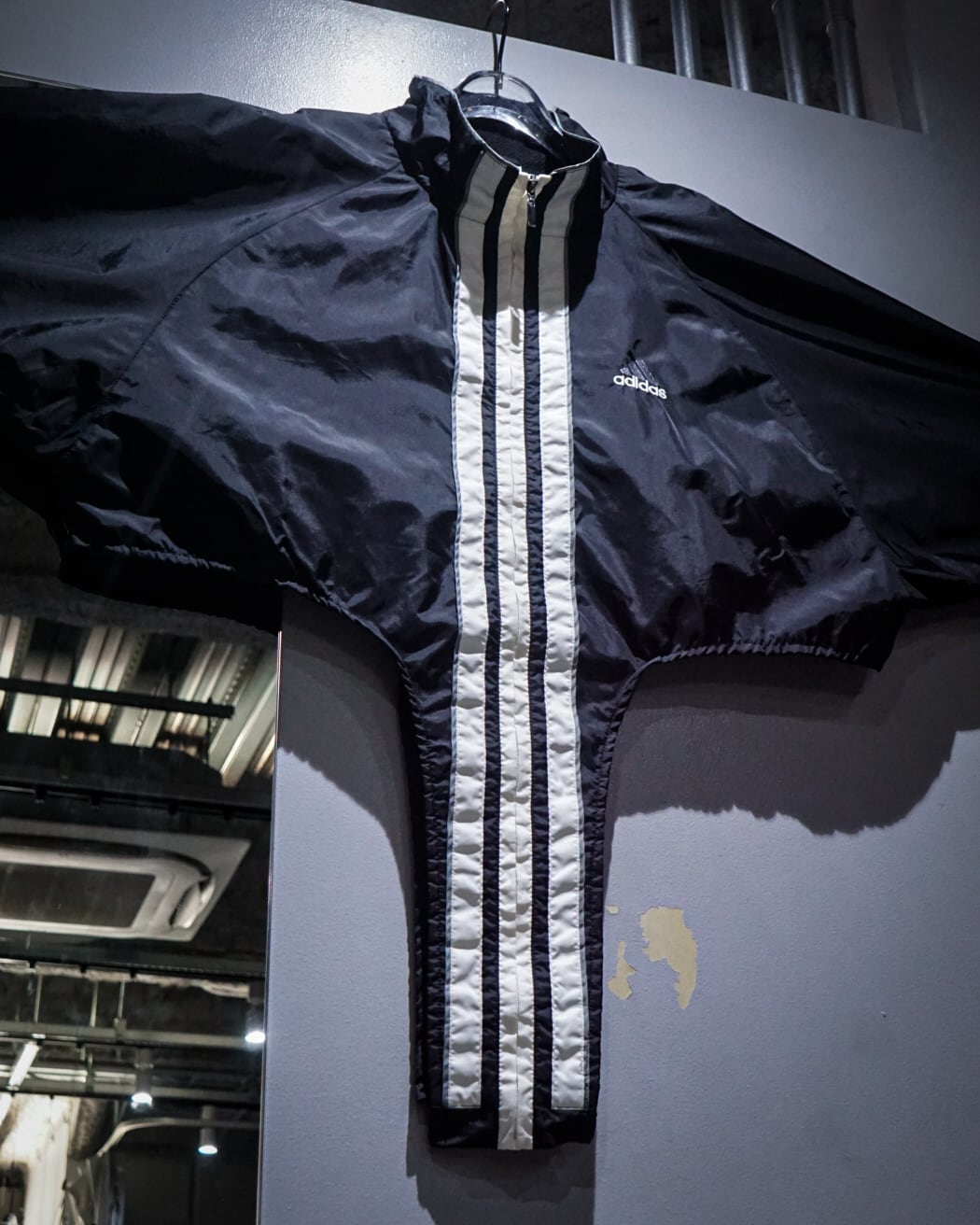 シャリ感のあるナイロントラックジャケットをベースに、裾をカットしロンパースのようなシルエットに変形させた風変わりな1着。