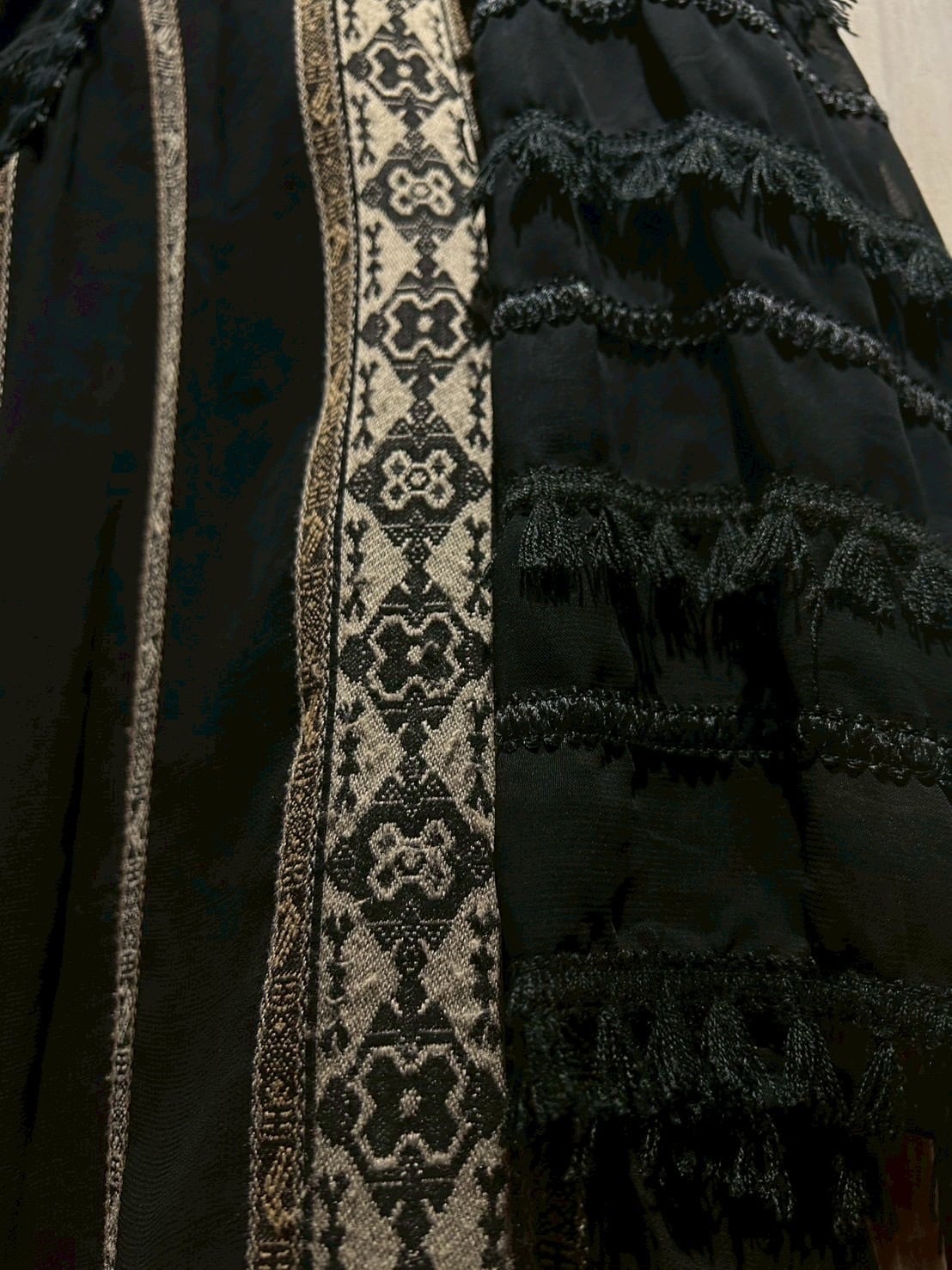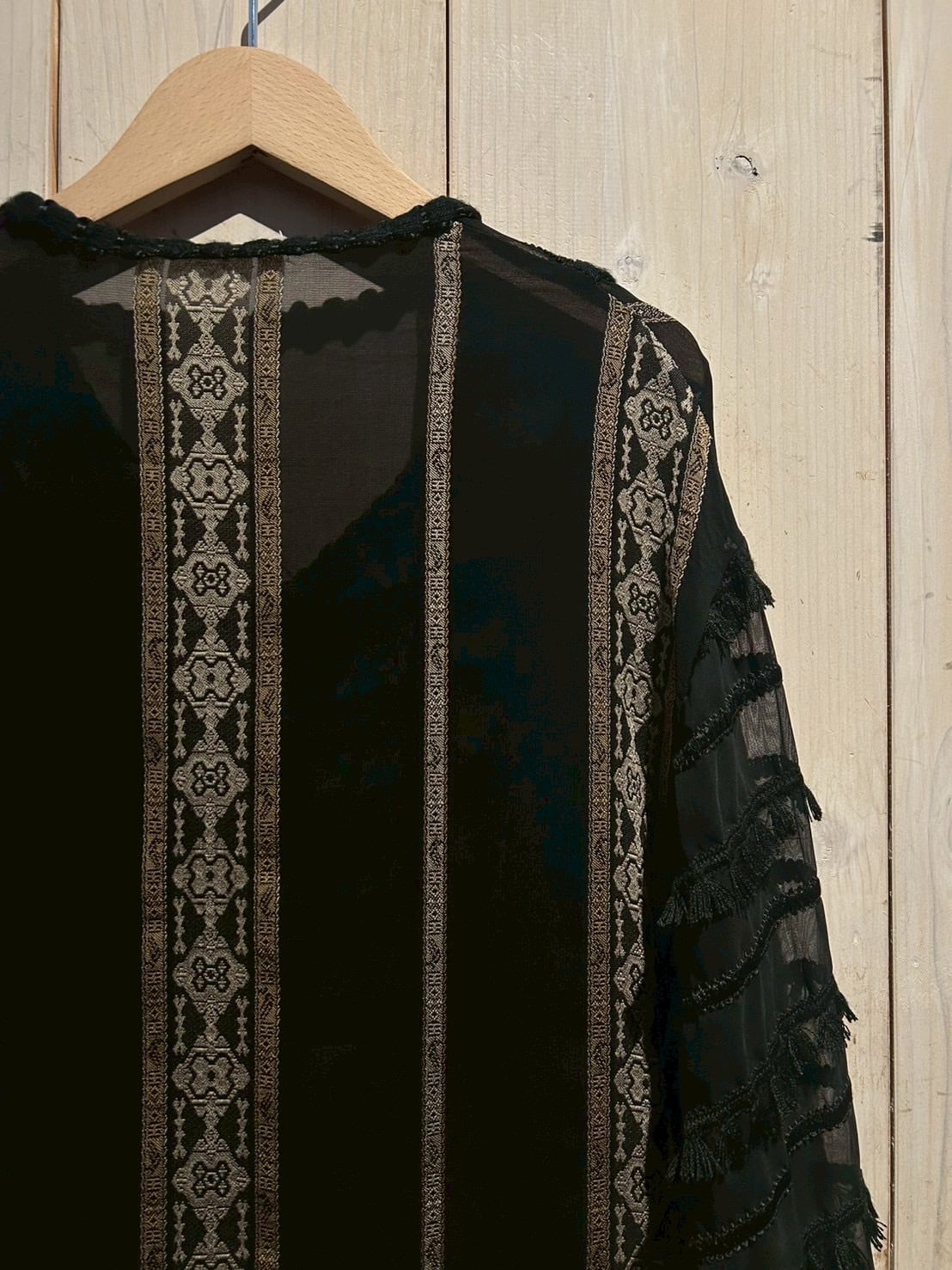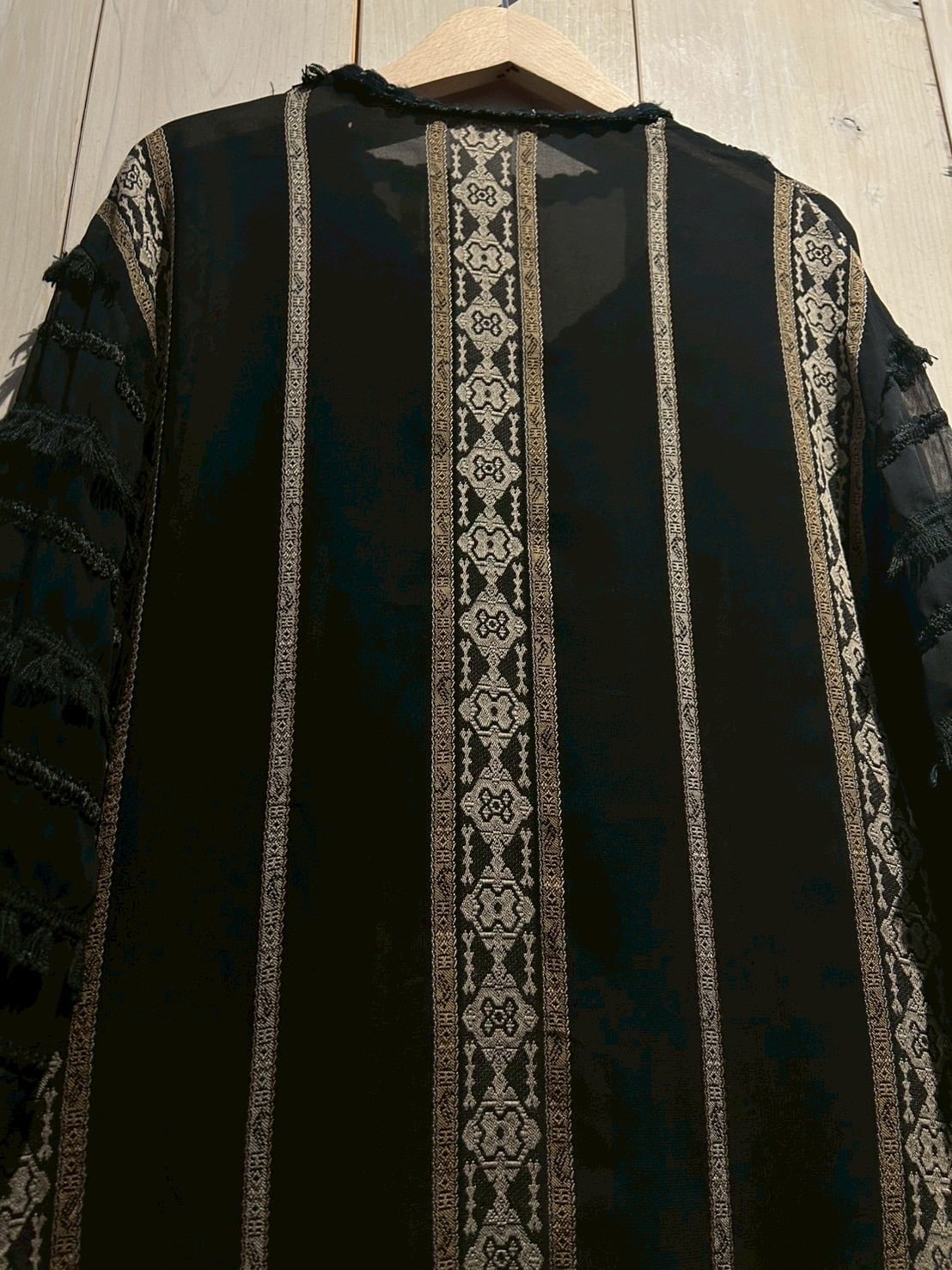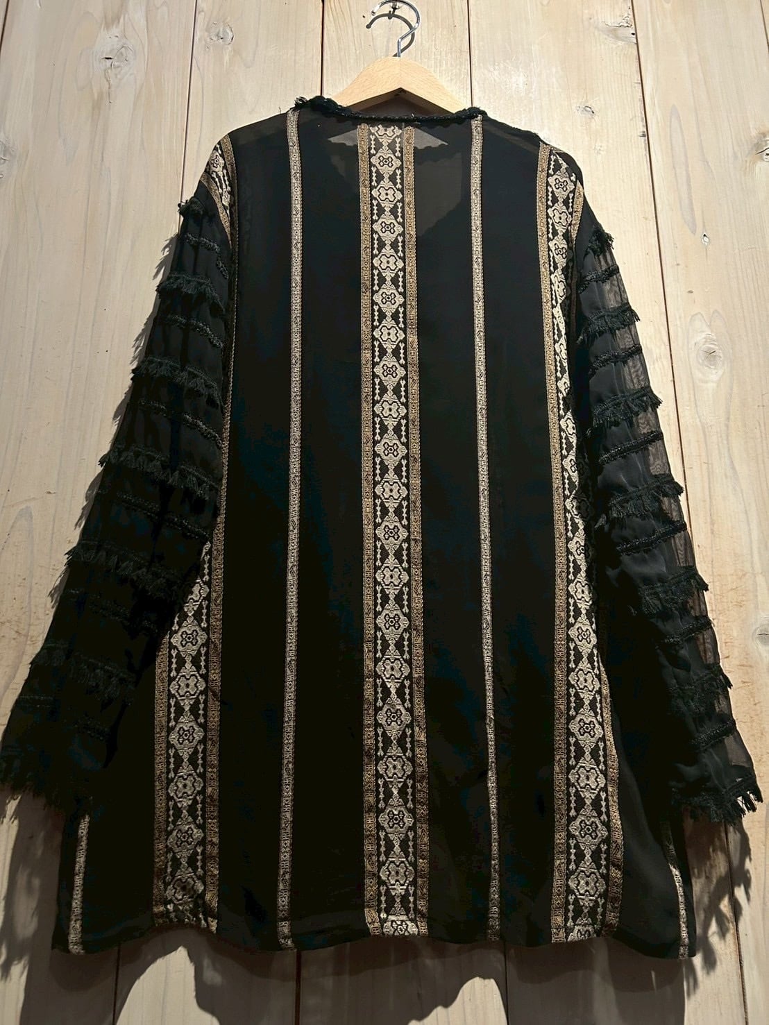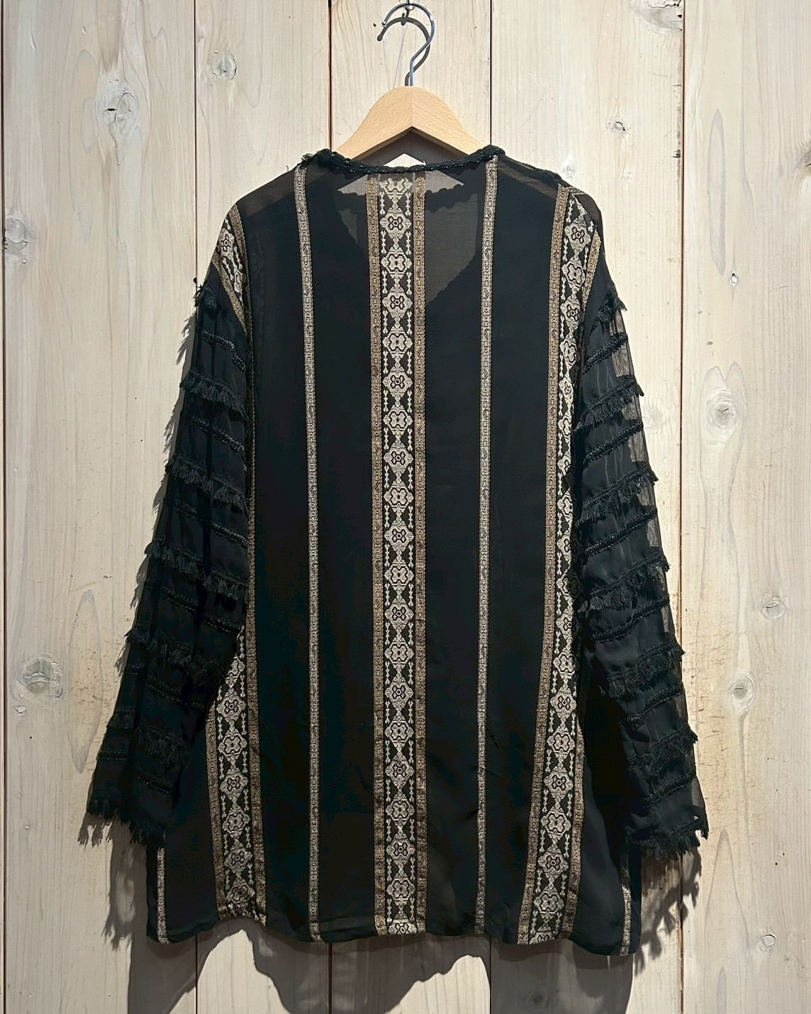 透け感の美しいブラックシアーに、エスニック調のデザインを織りで表現したテキスタイルをストライプ状に切り替えたジャケット。