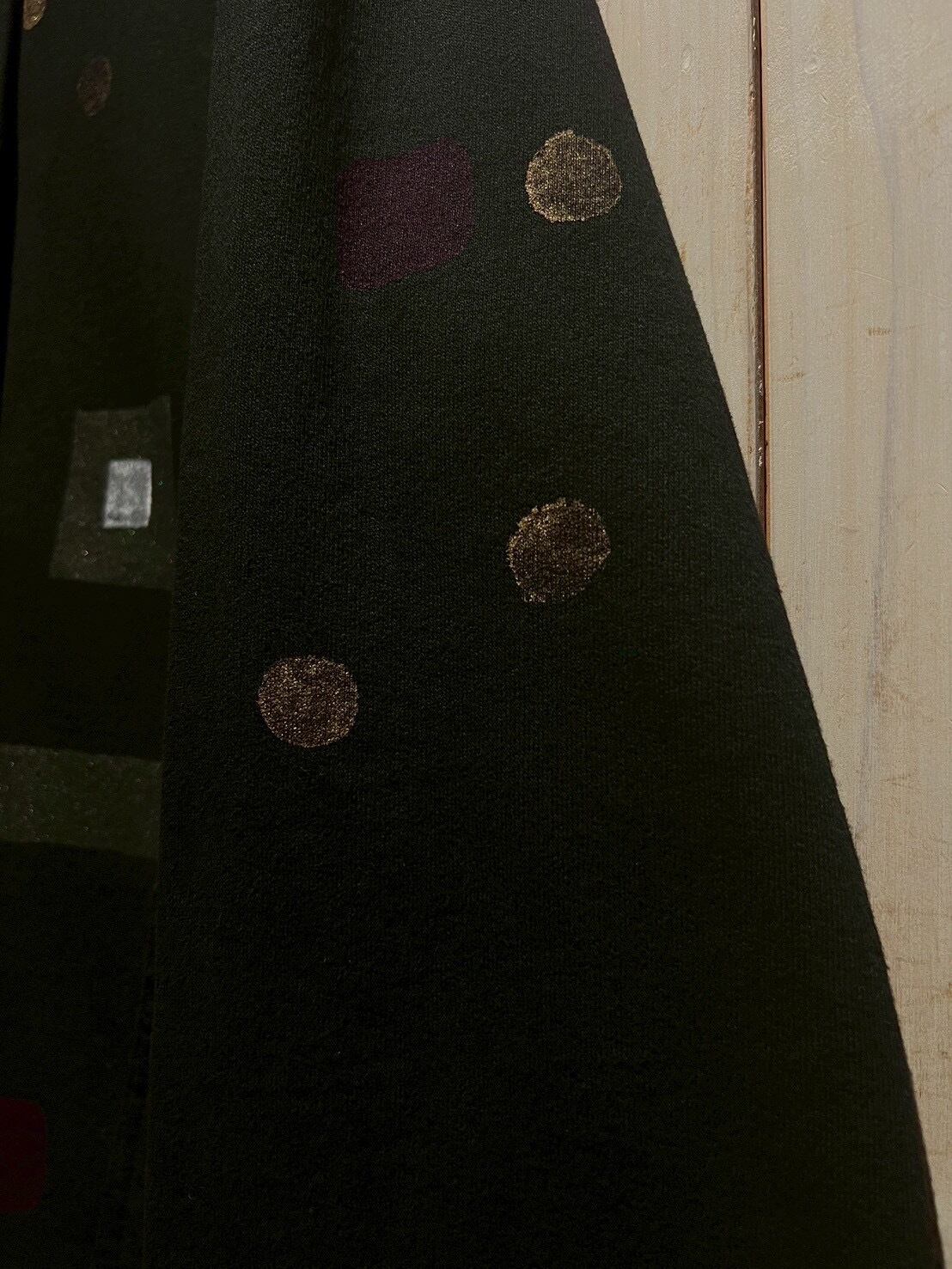 ハンドペイントで柄模様を施したことで、プリントとはまた違う"味"のある1着に。デザインバランスや配色も素晴らしく、思わず作った当時の背景に思いを馳せてしまいます、、、
