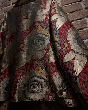 ゴールドの鈍い輝き、ジャガード織りの花の立体的な表情が存在感を抜群に放っており、今からの季節の主役のアウターとして大活躍必至ですね。