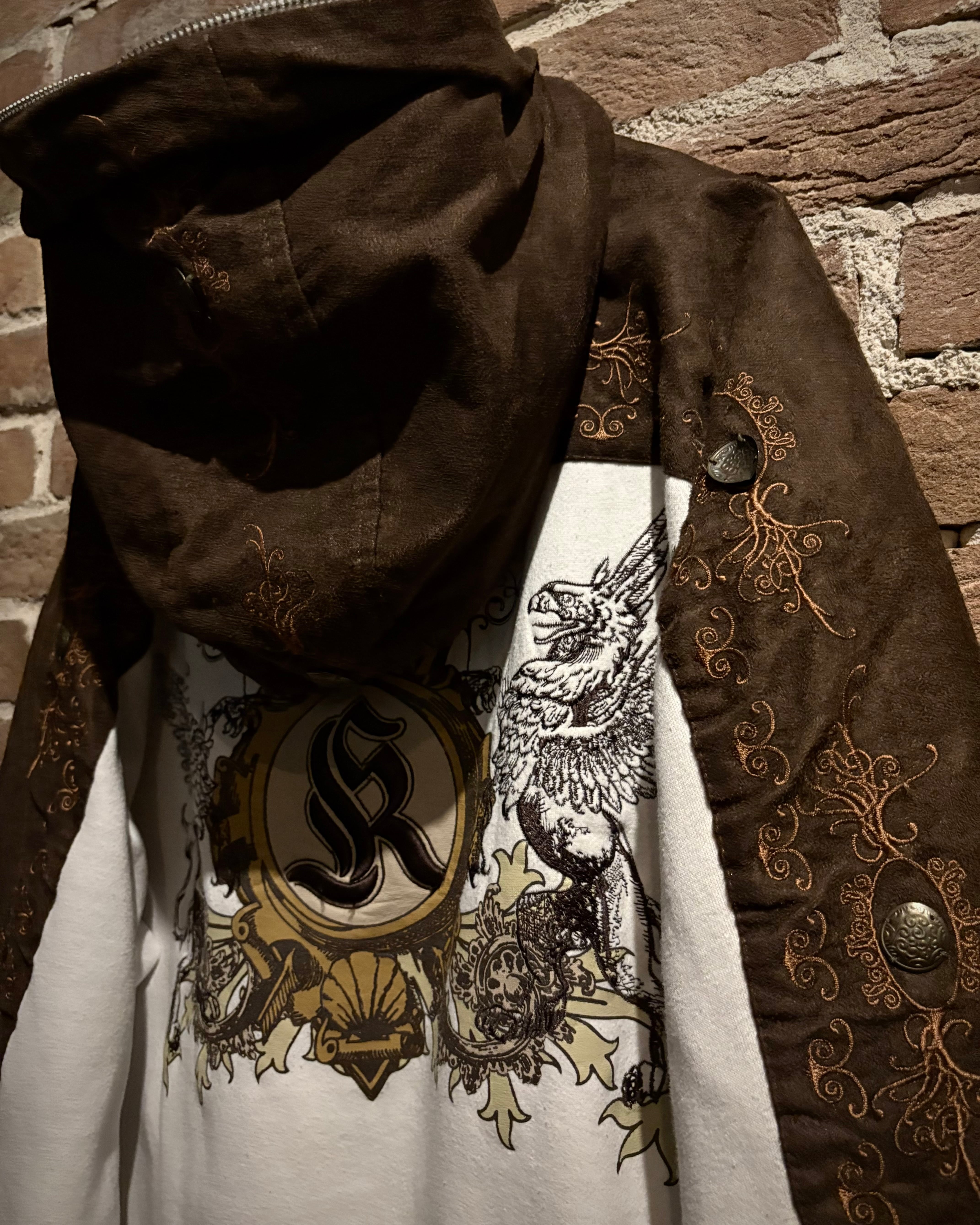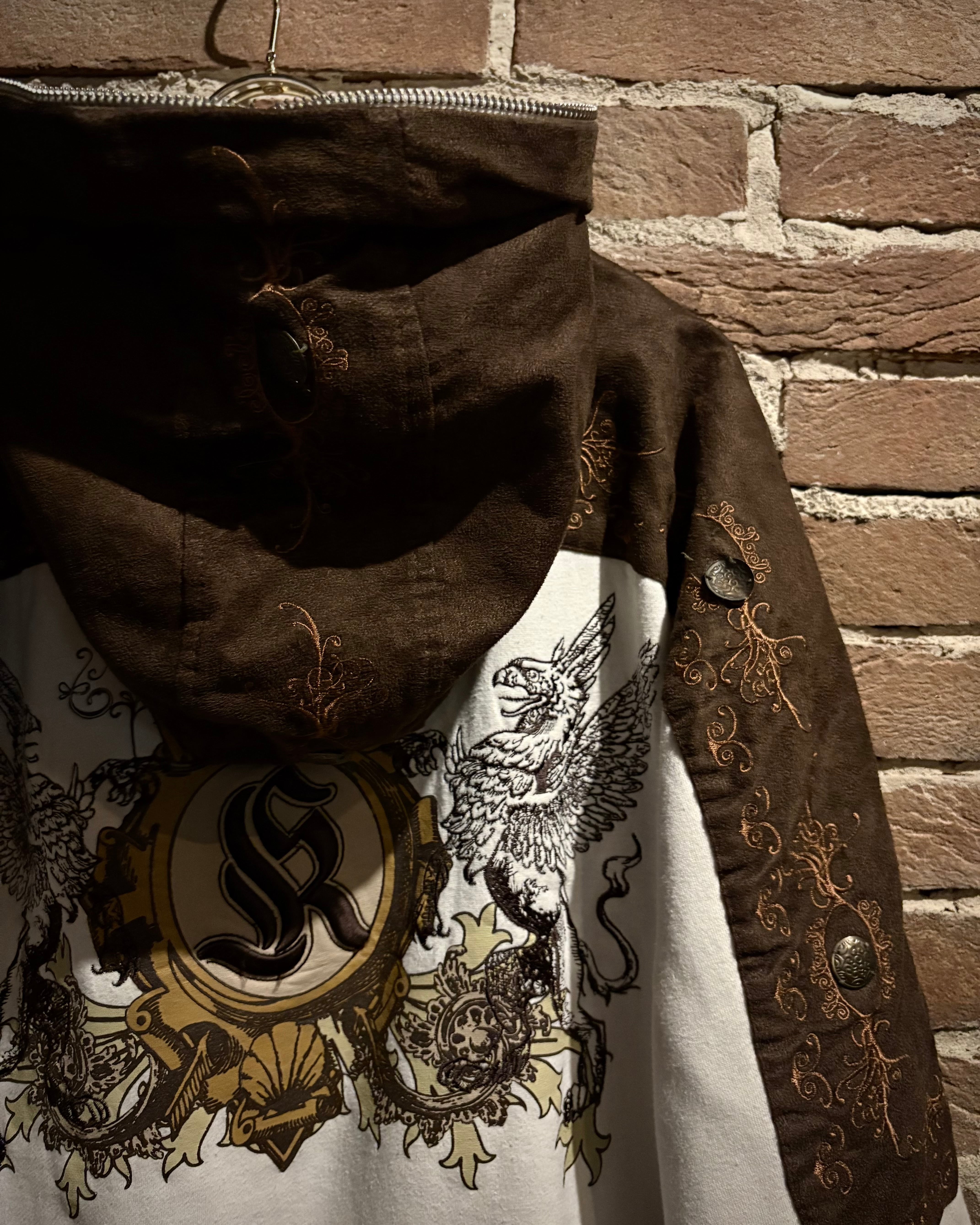 肩から袖、フードに起毛感のあるフェイクスエードを切り替え、その上からボタニカルなデザインの刺繍。さらにはコンチョボタンで装飾を施した、ストリート感がありながら当店らしい雰囲気も纏った1着。