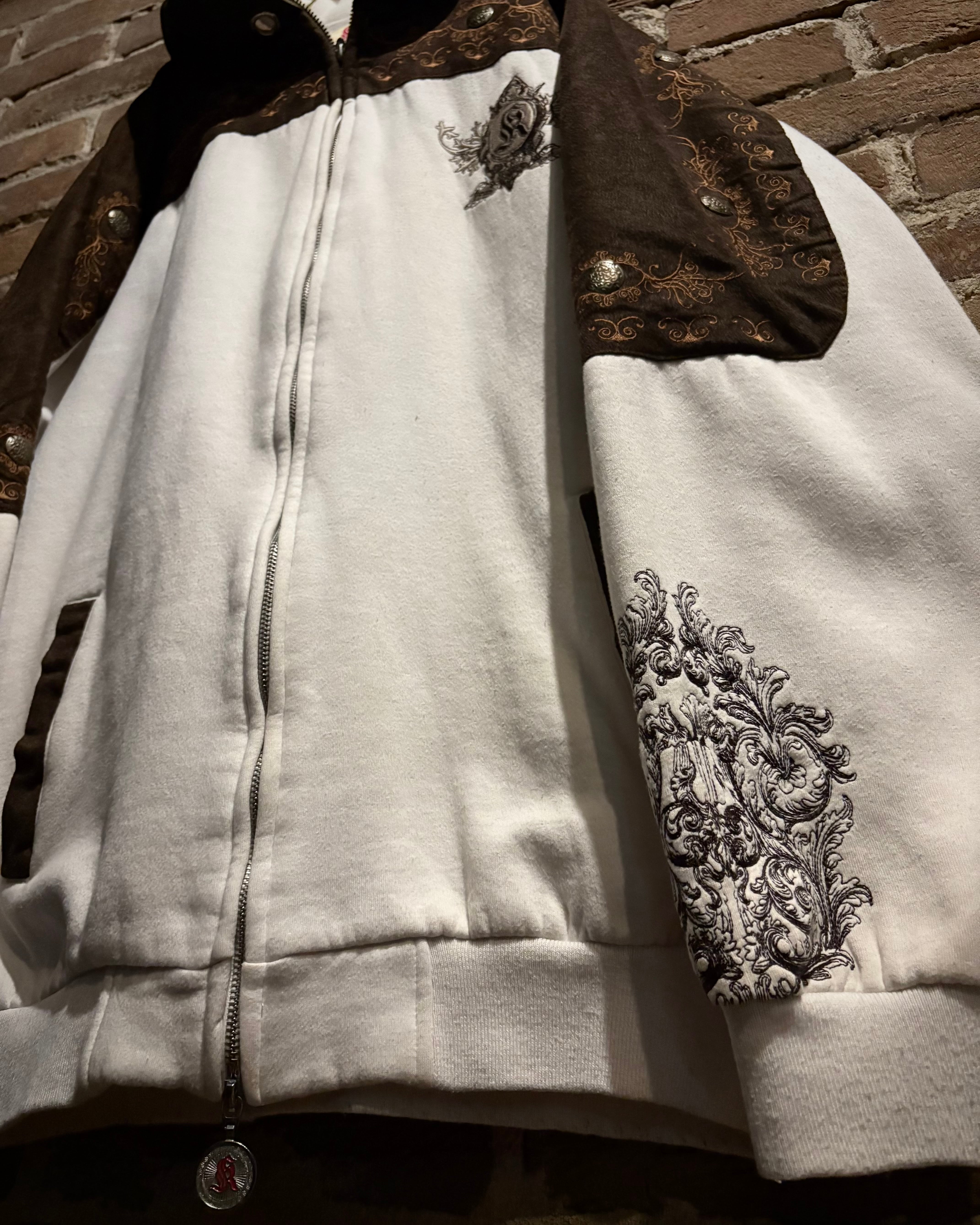 白のボディをベースに、異素材の切り替えなど様々な装飾を施した"KANJI JEANS"のスペシャルなジップアップフーディ。