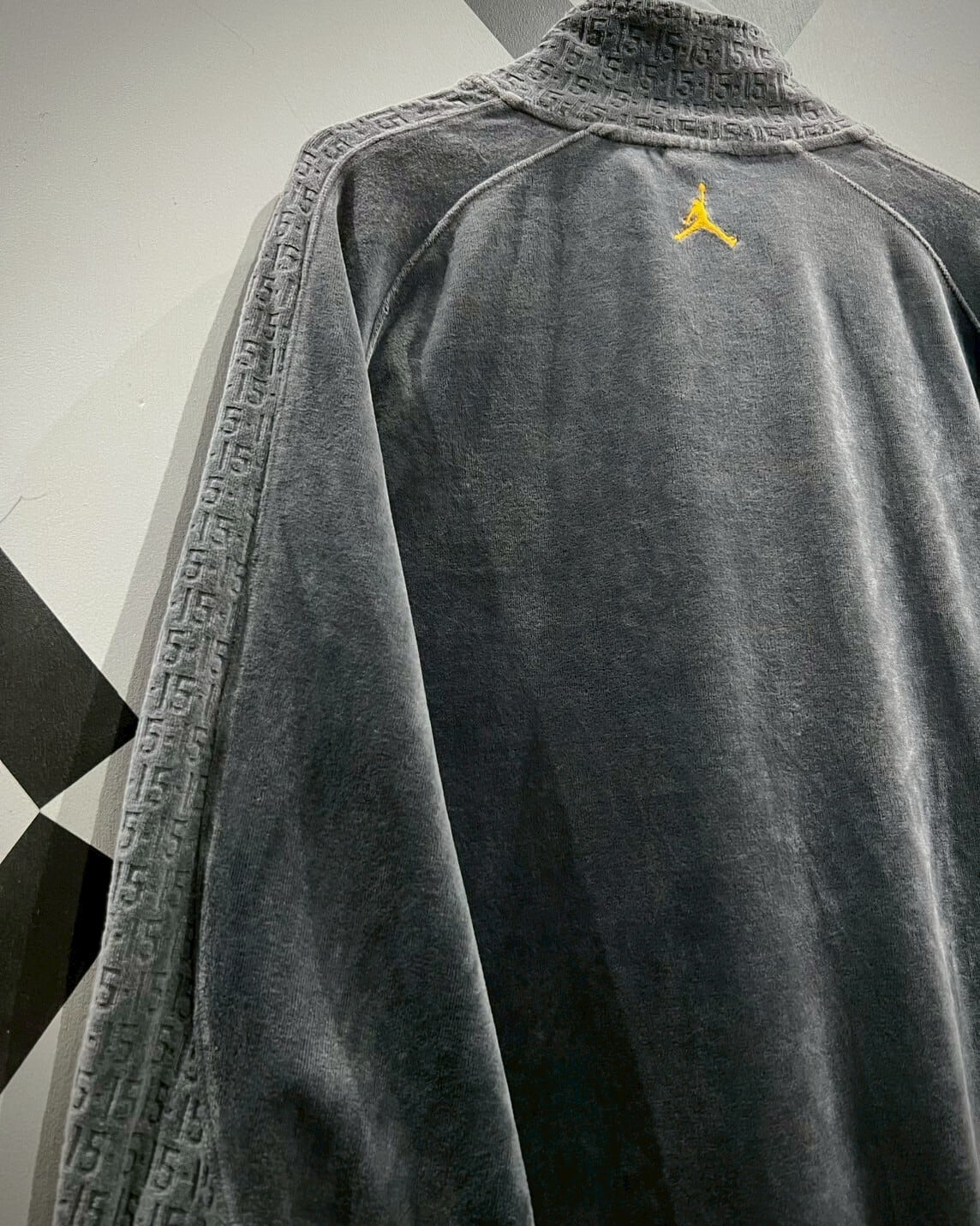 鈍い光沢を放つグレーのベロアを用いたボディに、左胸、背面首元にはジャンプマンのロゴ、首元から袖には15ナンバーパターンを載せたベロアトラックジャケット。