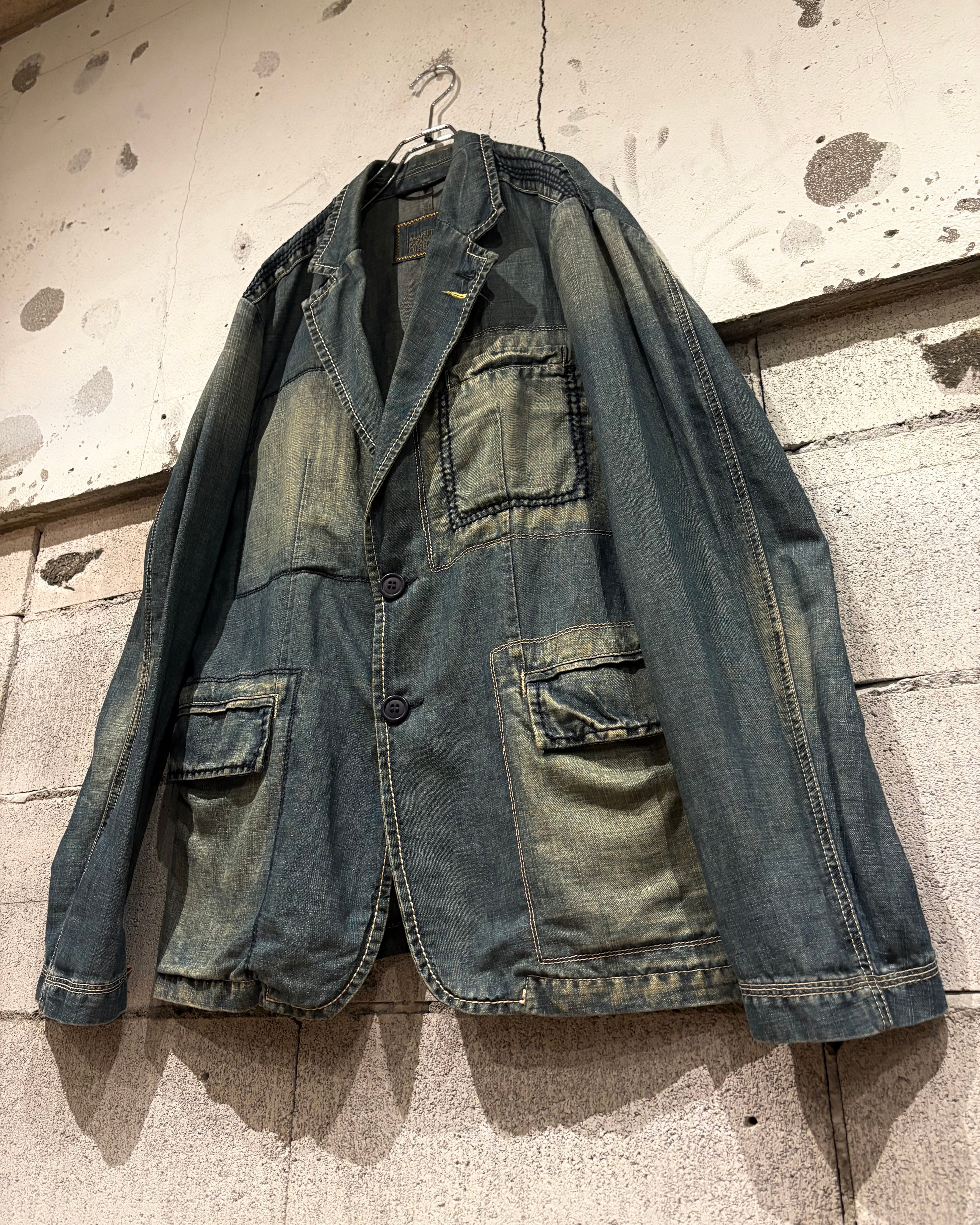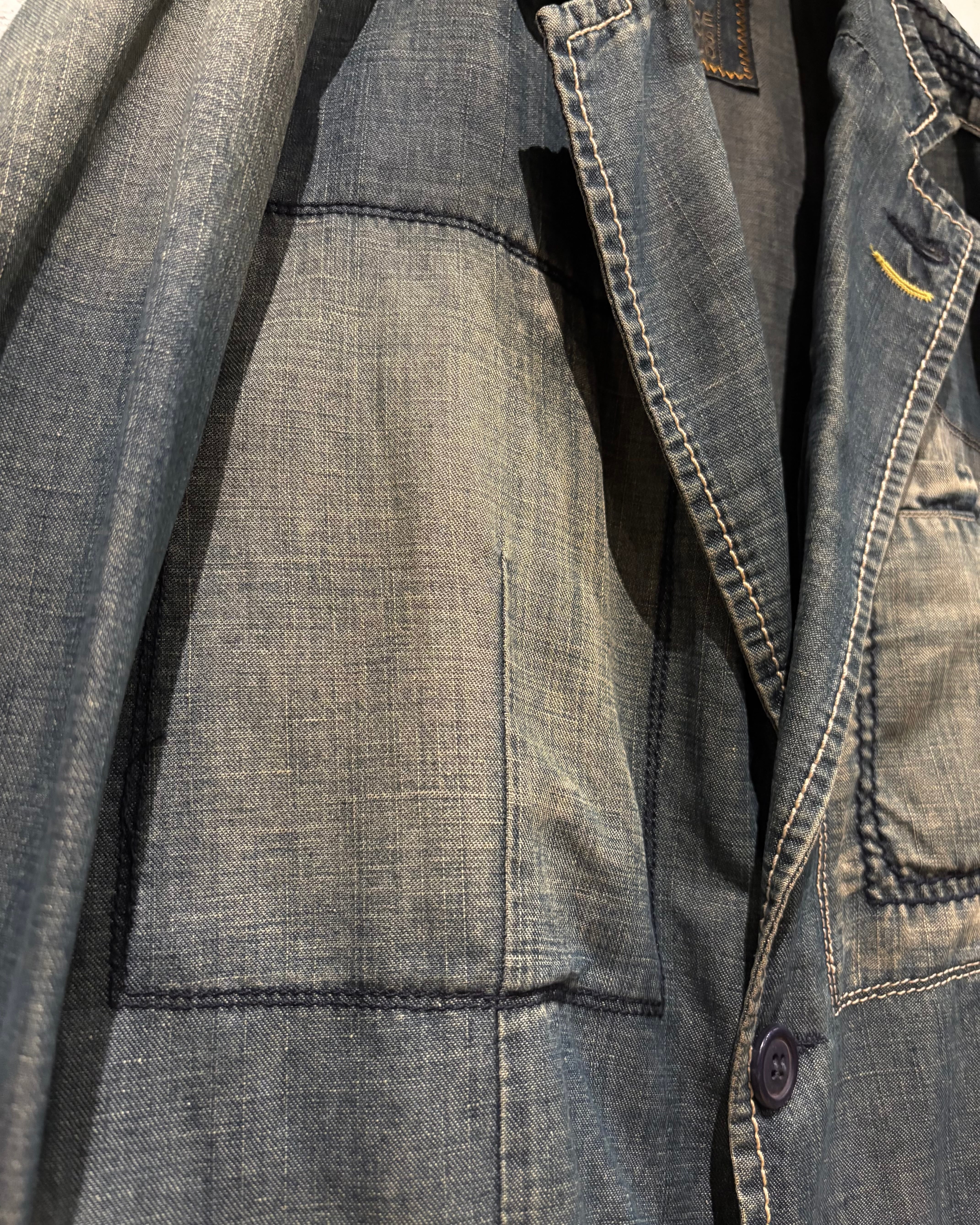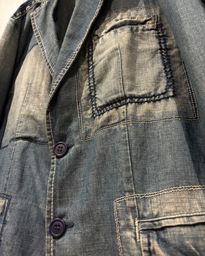経年変化による色落ちが加工によって表現されたデニムのテーラードジャケット。