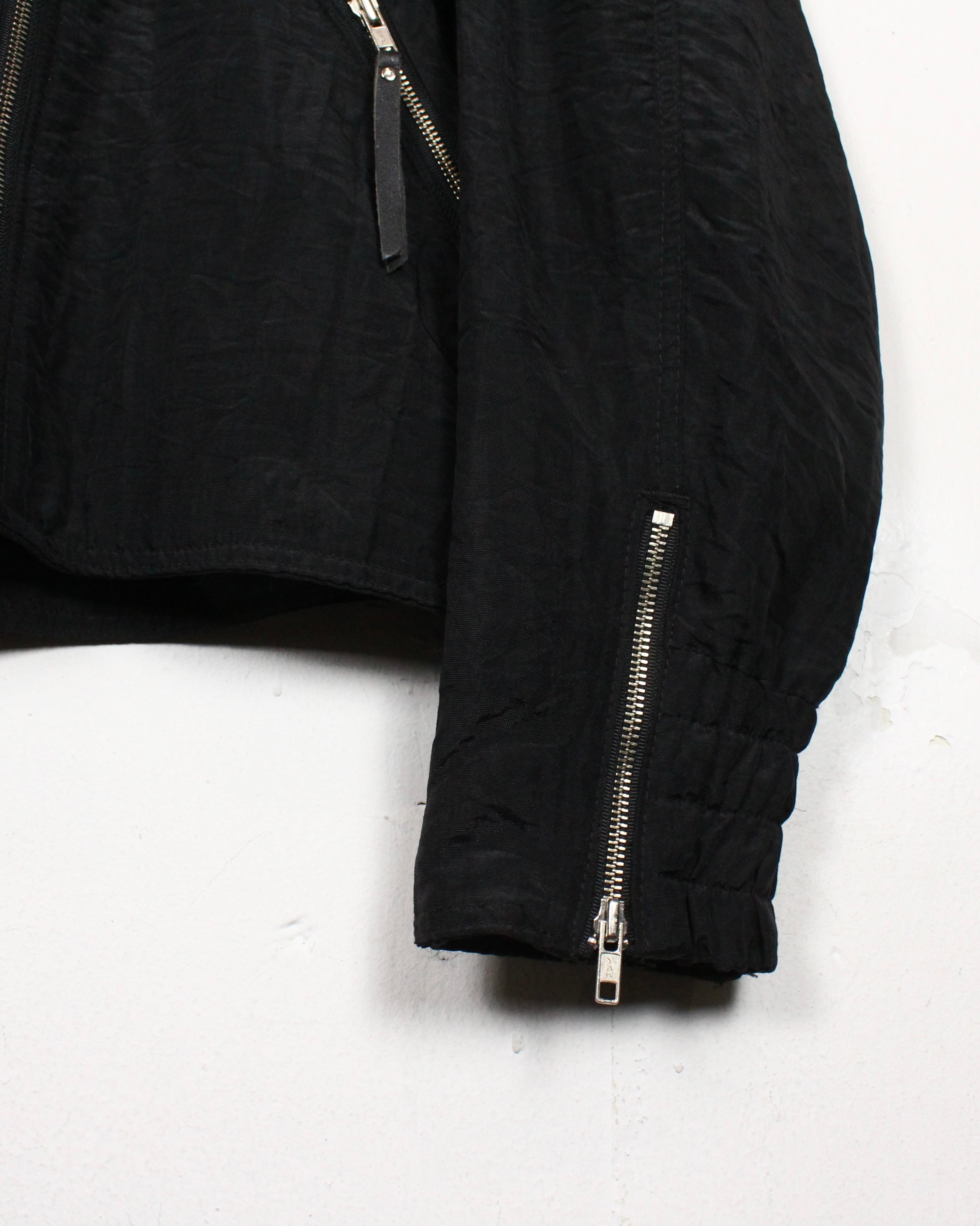 フロントにはソリッドな光沢を放つシルバーのジップにポケット、レザーのチャームに袖裾にもバイカーアイテムらしいジップを施し、細やかなディテールも抜かりなし。