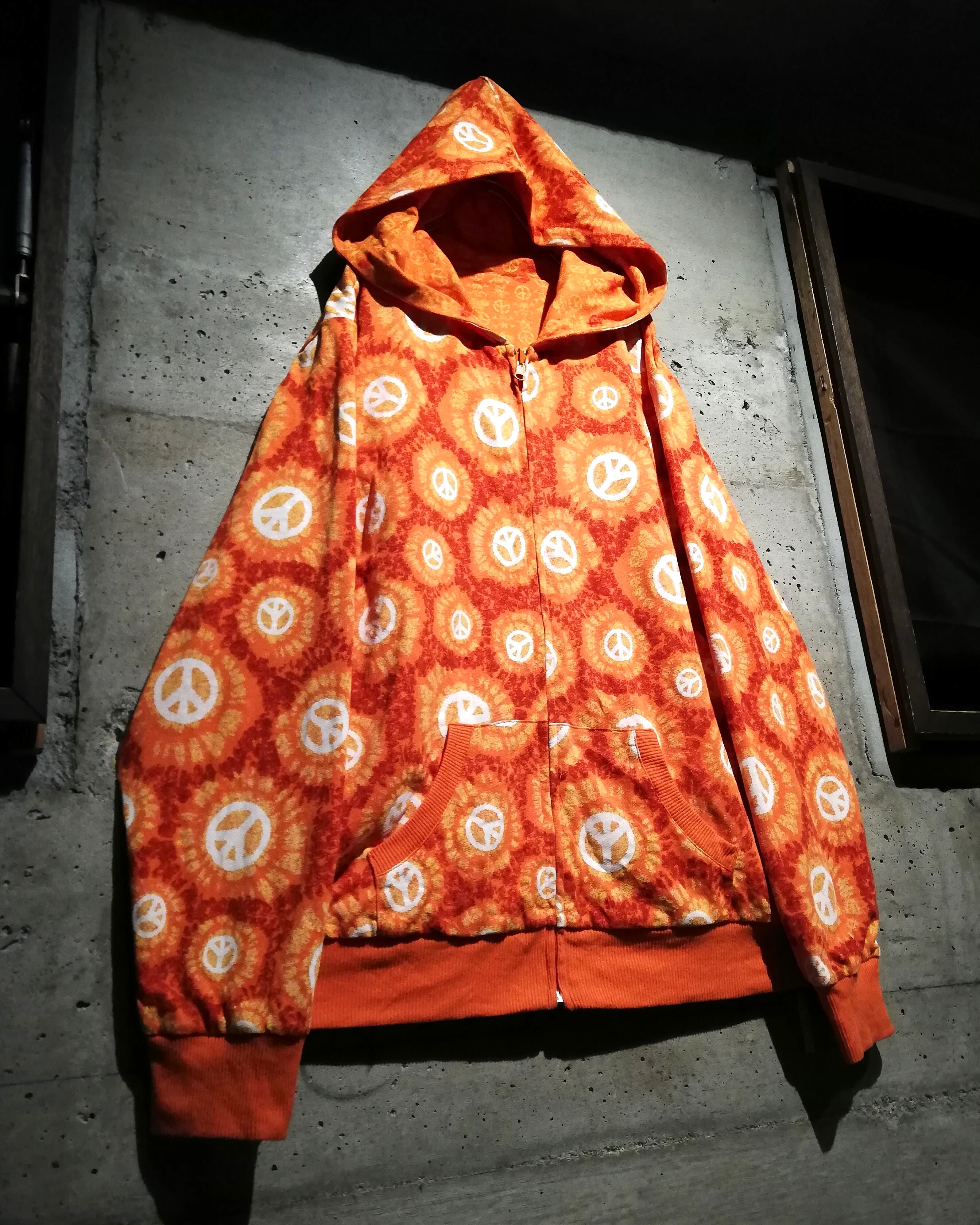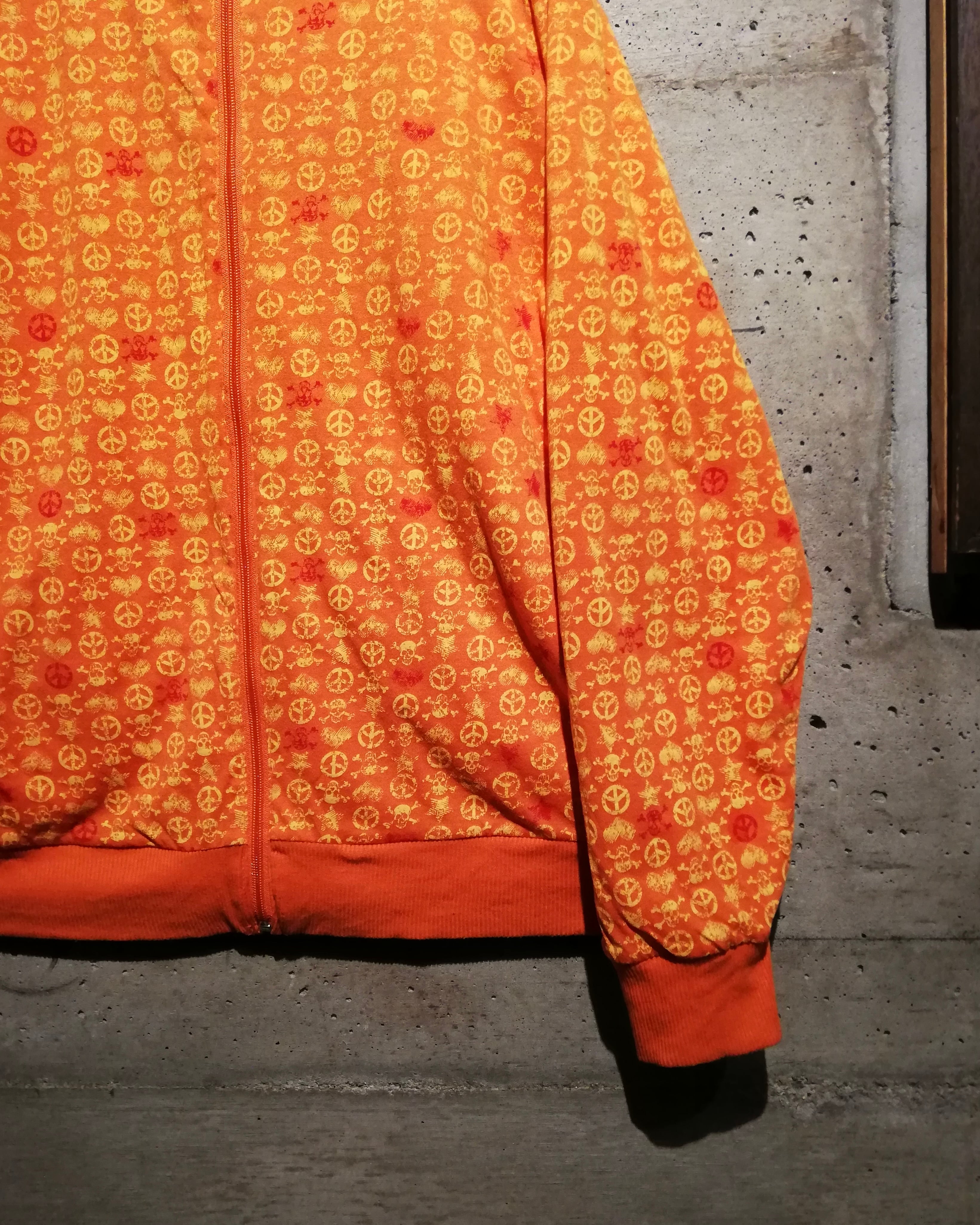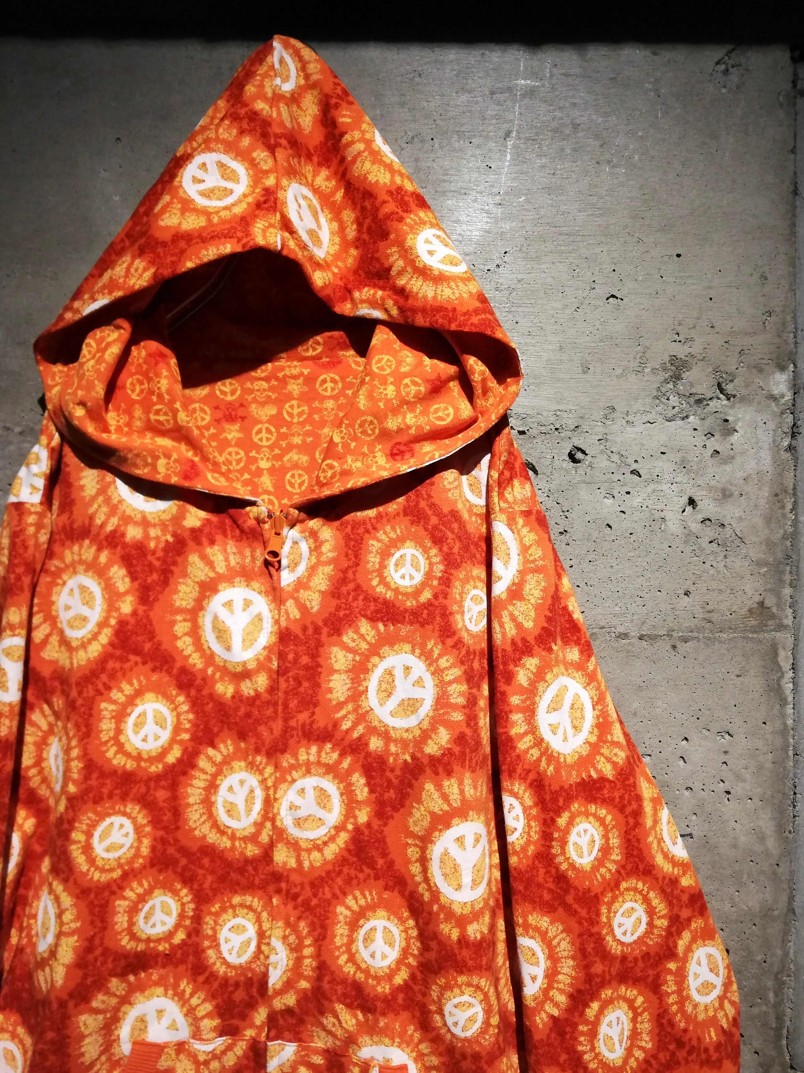 鮮やかなオレンジのボディに、ピースマークを、ガバッと裏返すとスカル、ハート、星のパターンに切り替わる、リバーシブル仕様のジップアップフーディ。