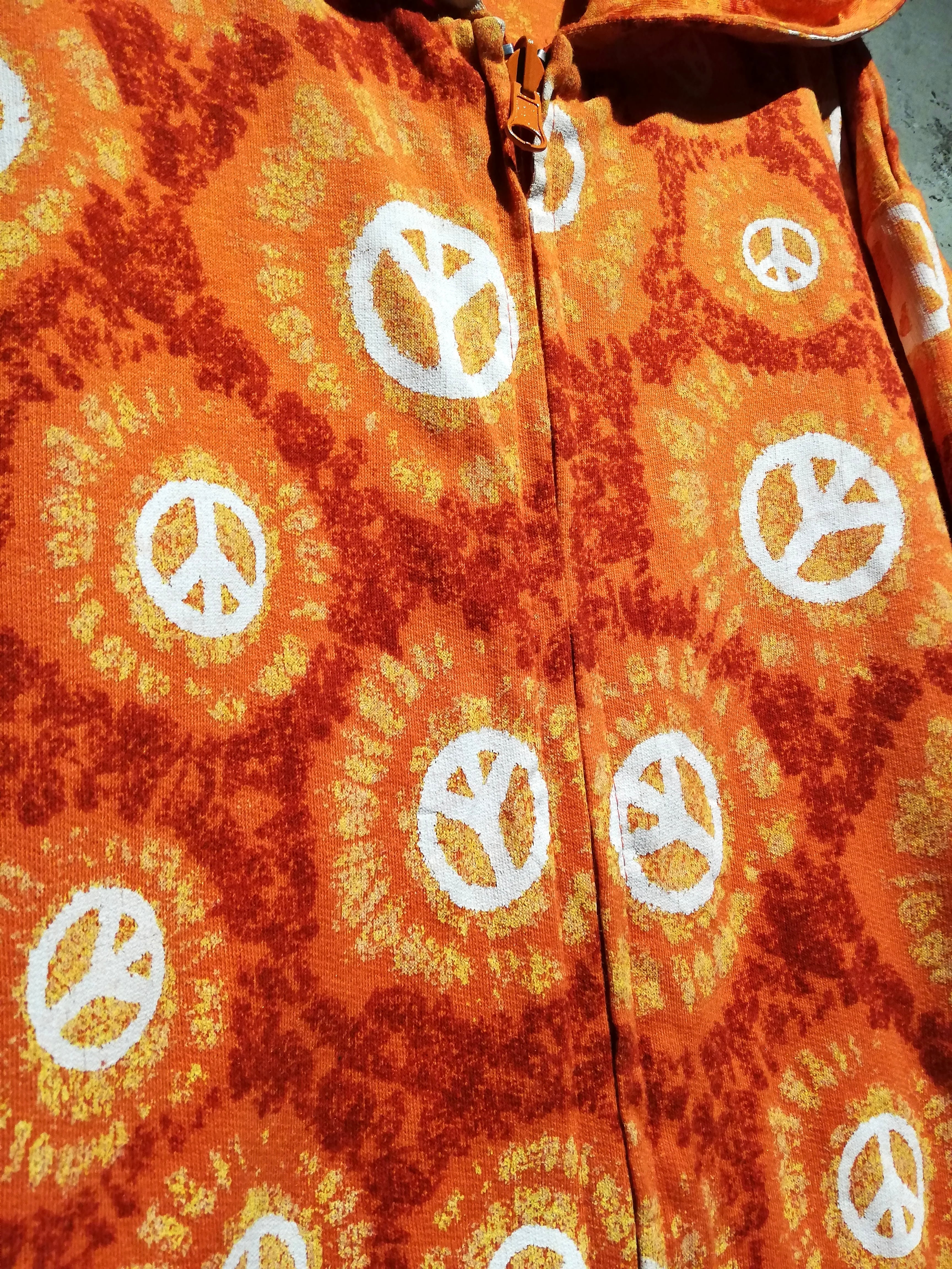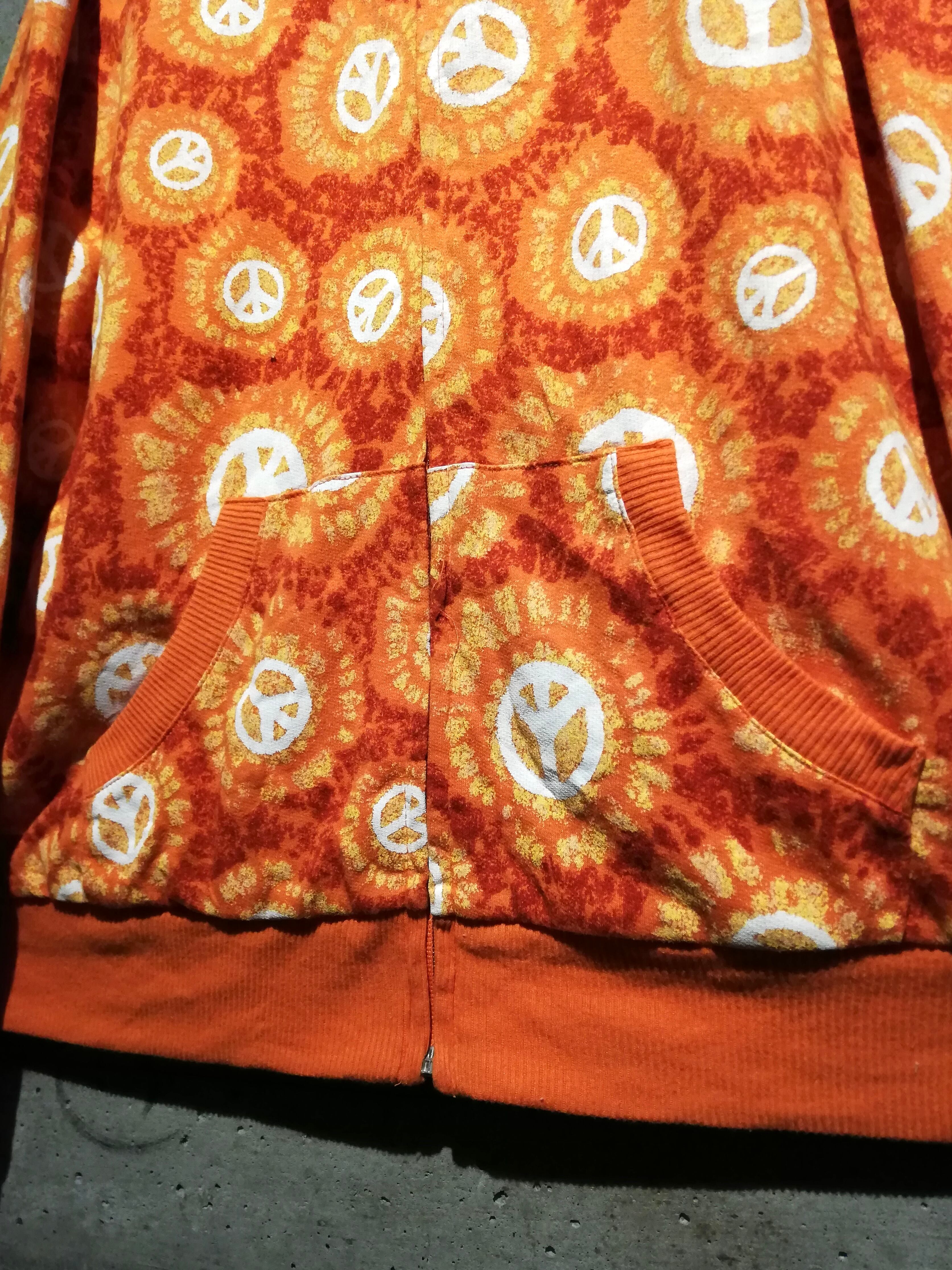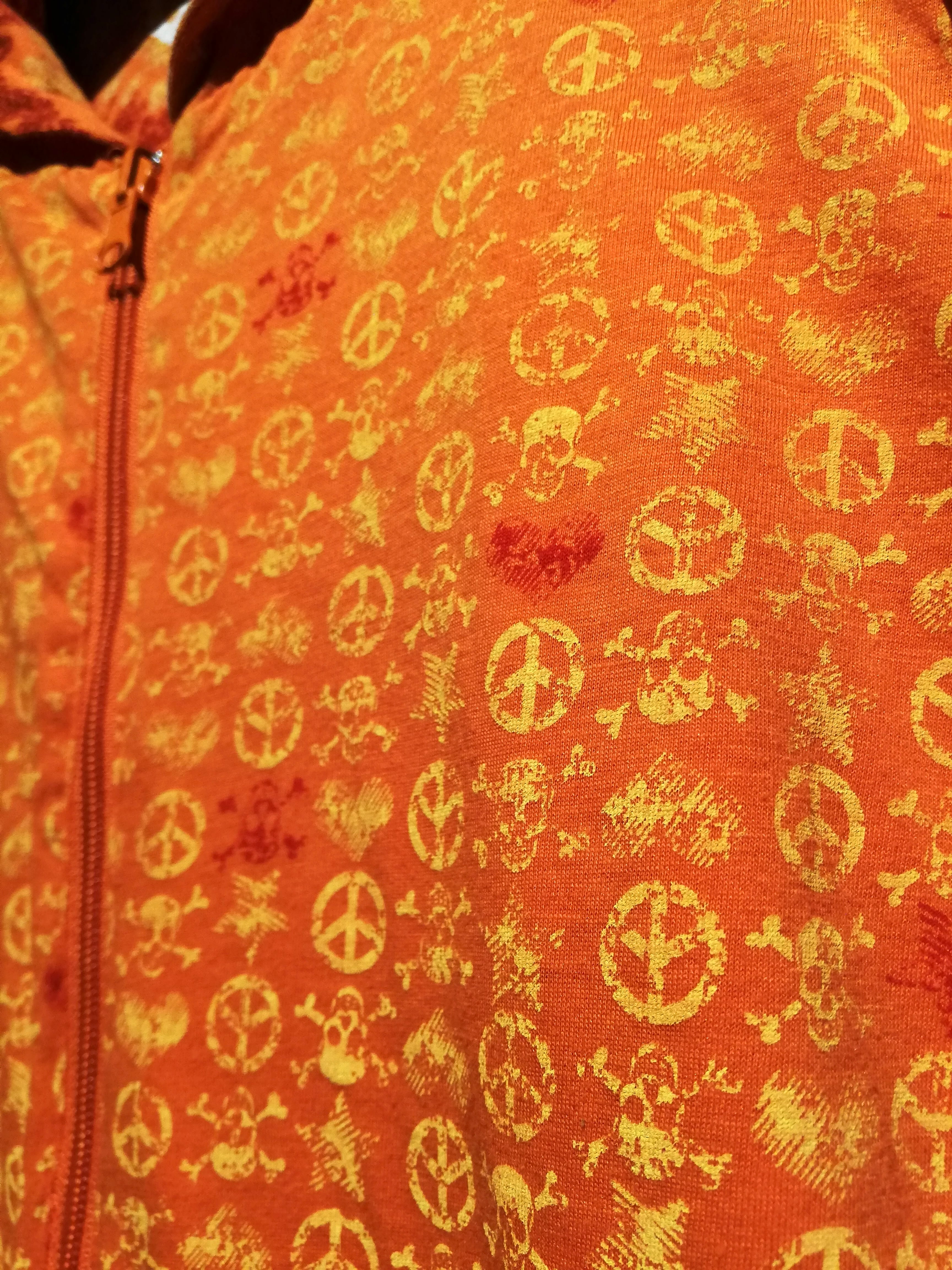 鮮やかなオレンジのボディに、ピースマークを、ガバッと裏返すとスカル、ハート、星のパターンに切り替わる、リバーシブル仕様のジップアップフーディ。