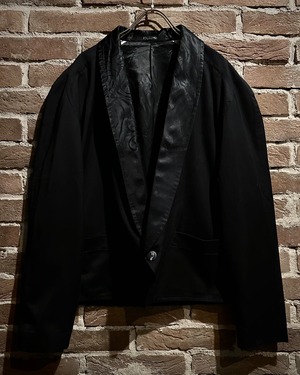 ハリのある黒のテキスタイルを用いたボディに、襟部分に波状のデザインを載せた生地を切り替えたショートレングスのテーラードジャケット。