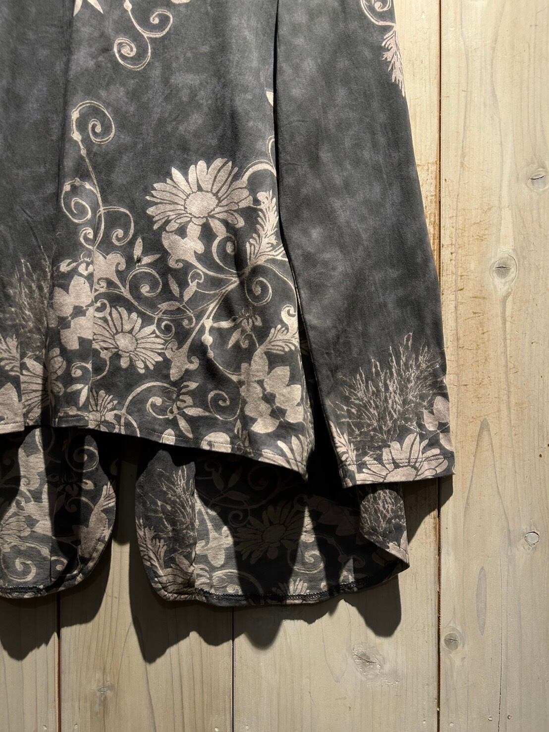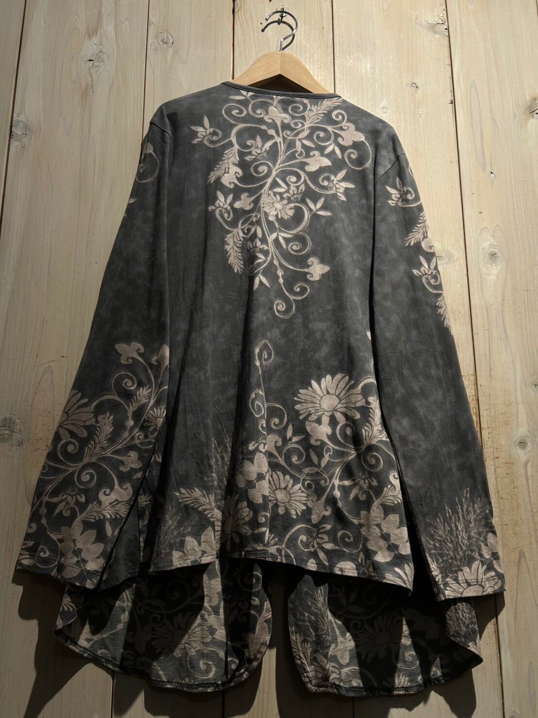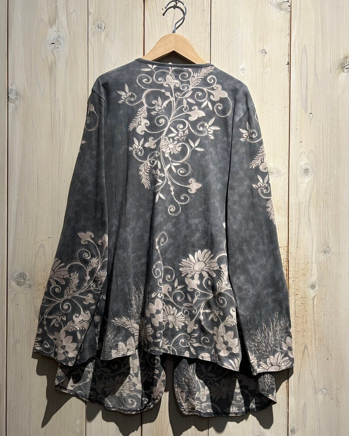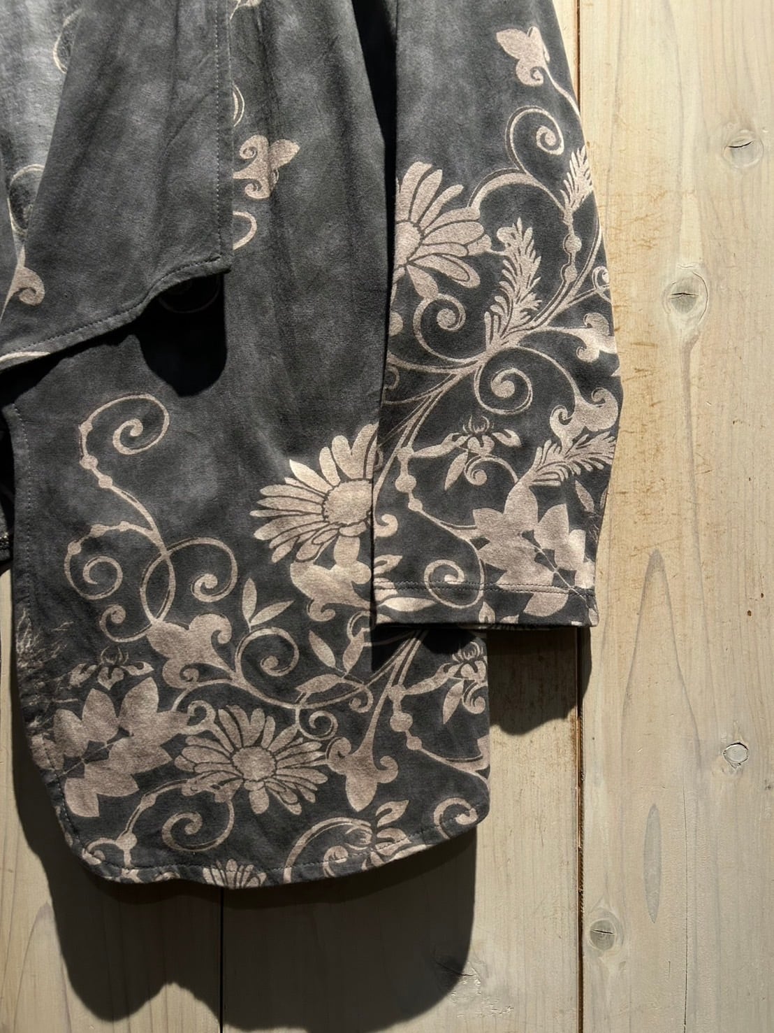ムラのある染めによって仕上げられた、深みのある表情を見せるグレーカラーのボディに、花柄を載せた羽織り型のシャツジャケット。