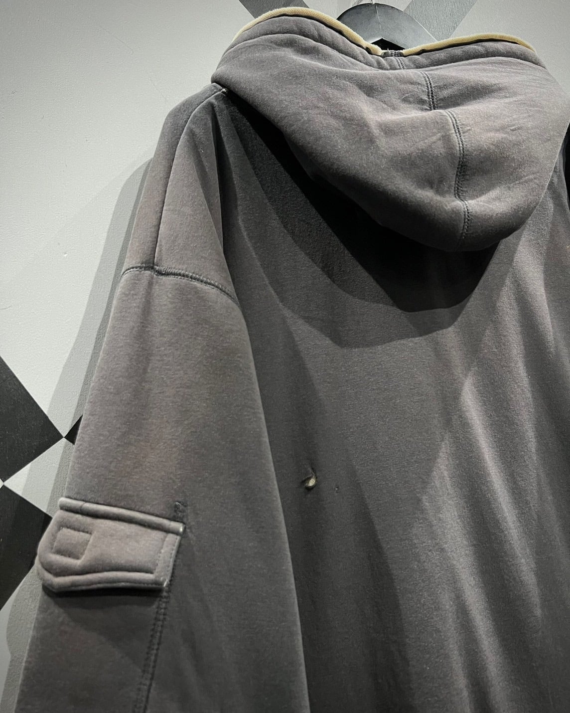 ハトメの装飾、フロントのポケットやジップ付近はインサイドアウト風のデザインとなっており、フェード感と相まって退廃的な雰囲気を漂わせています。
