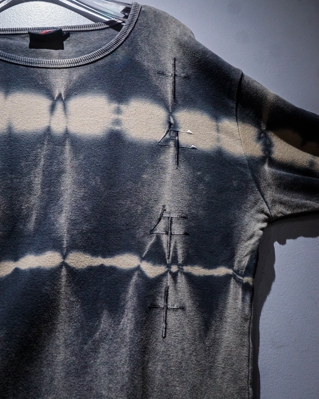染めによって独特な柄をボディ全体に映し出したプルオーバーニット。