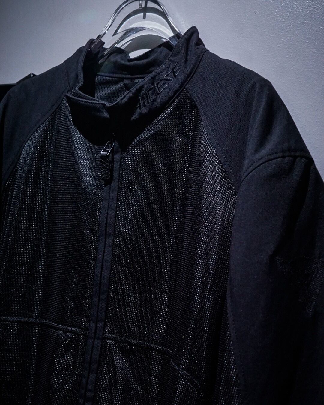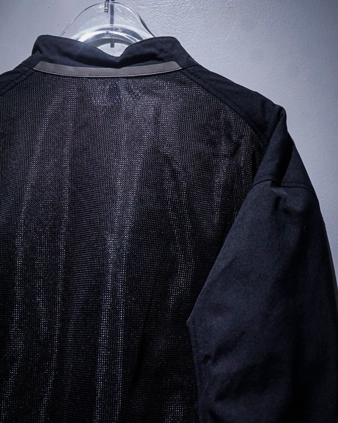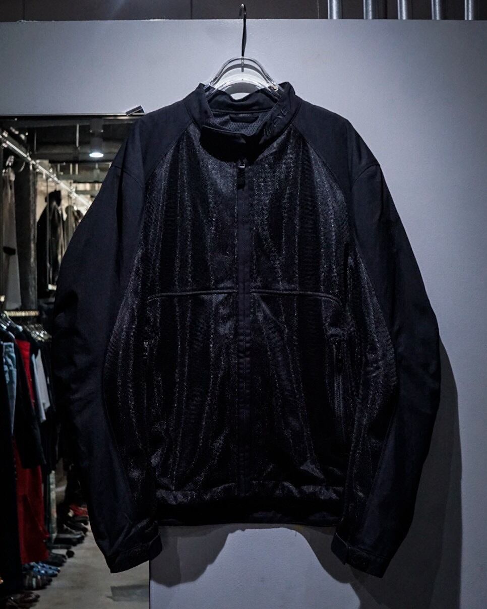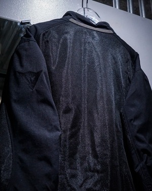 ハリのあるナイロン生地×メッシュ生地でボディを切り替え、オールブラックで仕上げたモーターサイクルジャケット。