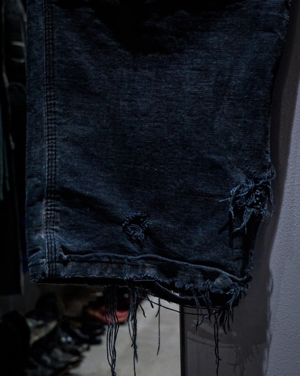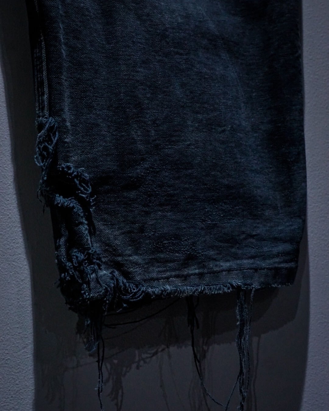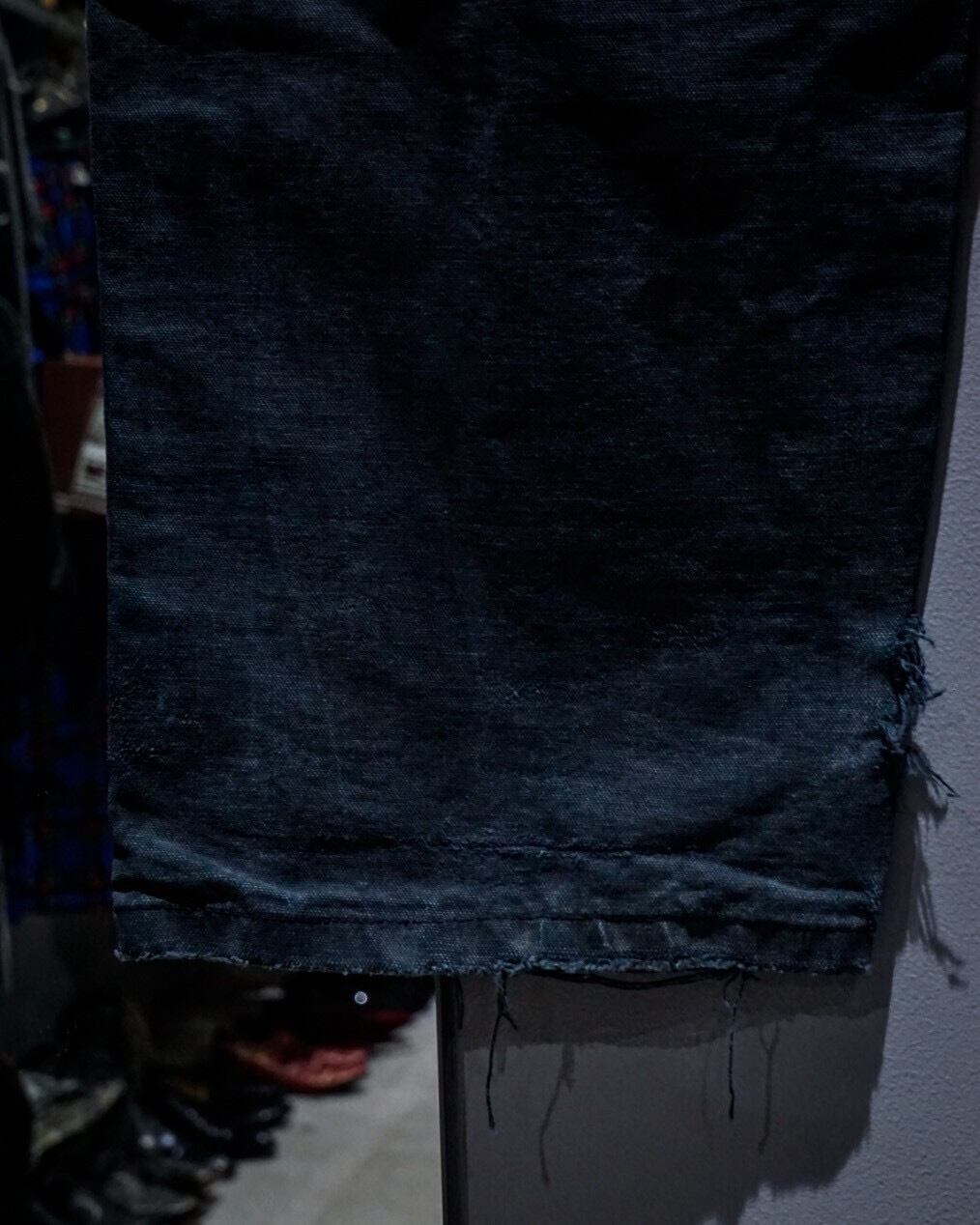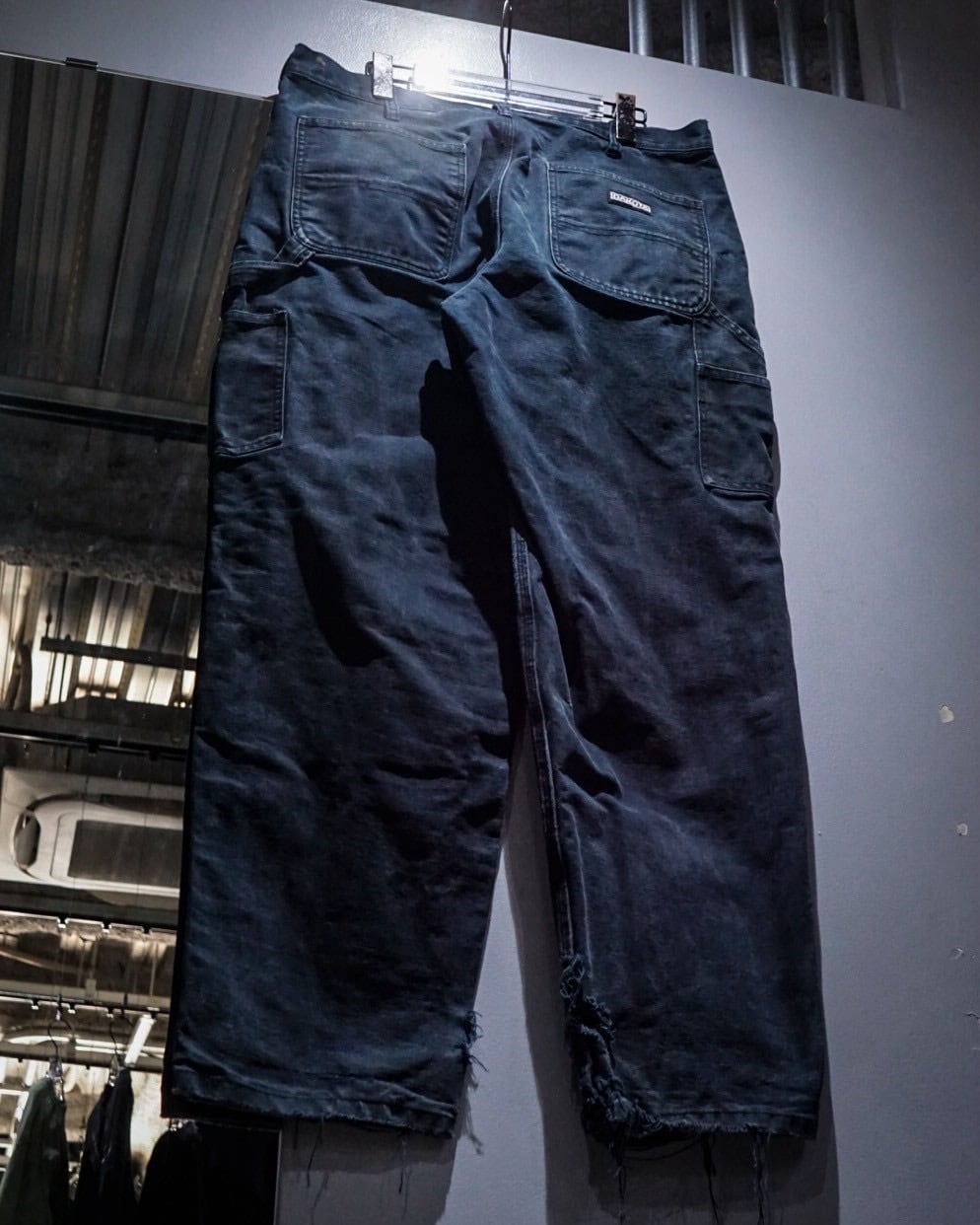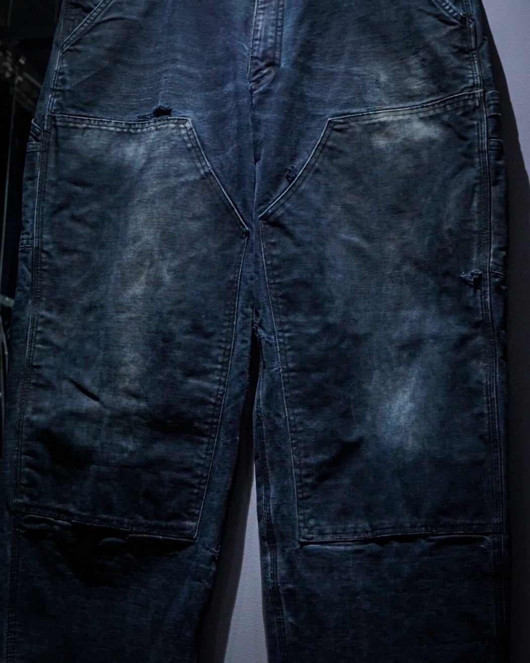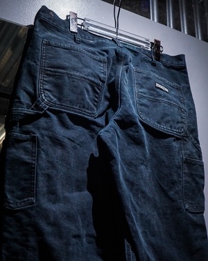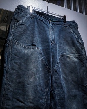 ブラックのダック地をボディに使用し、経年変化や着用によるフェード、ダメージが効いたダブルニーペインターパンツ。