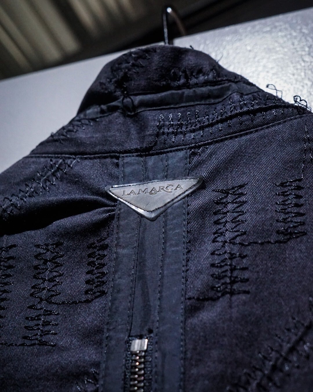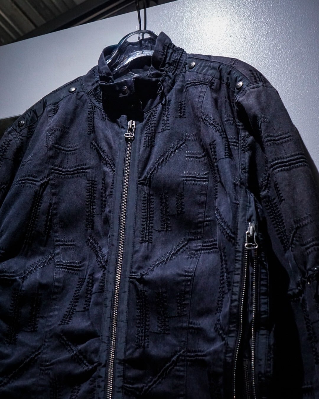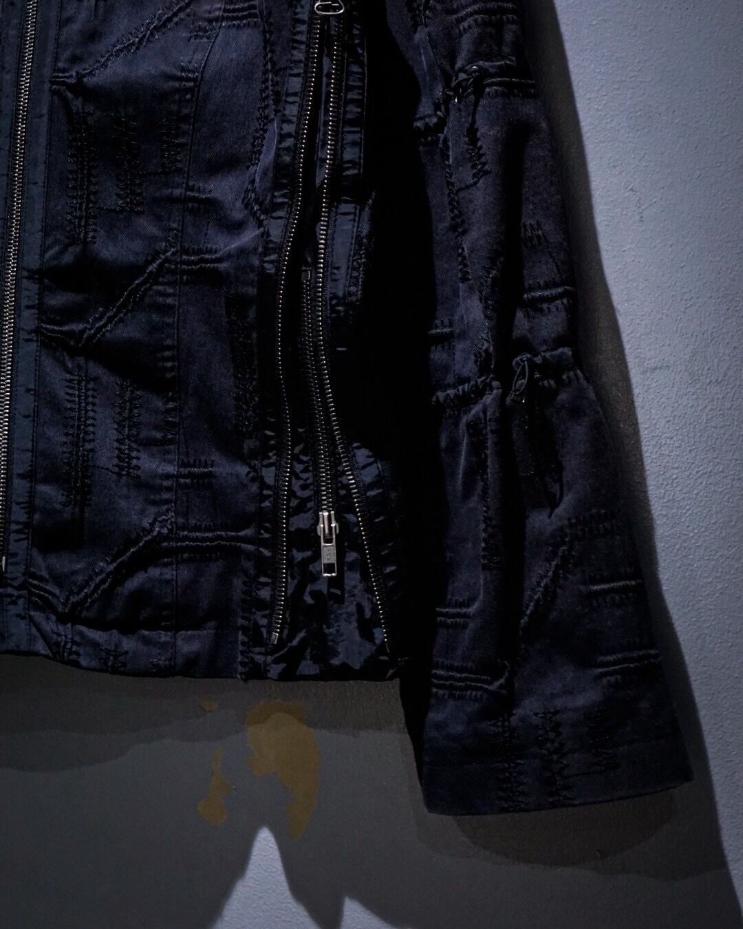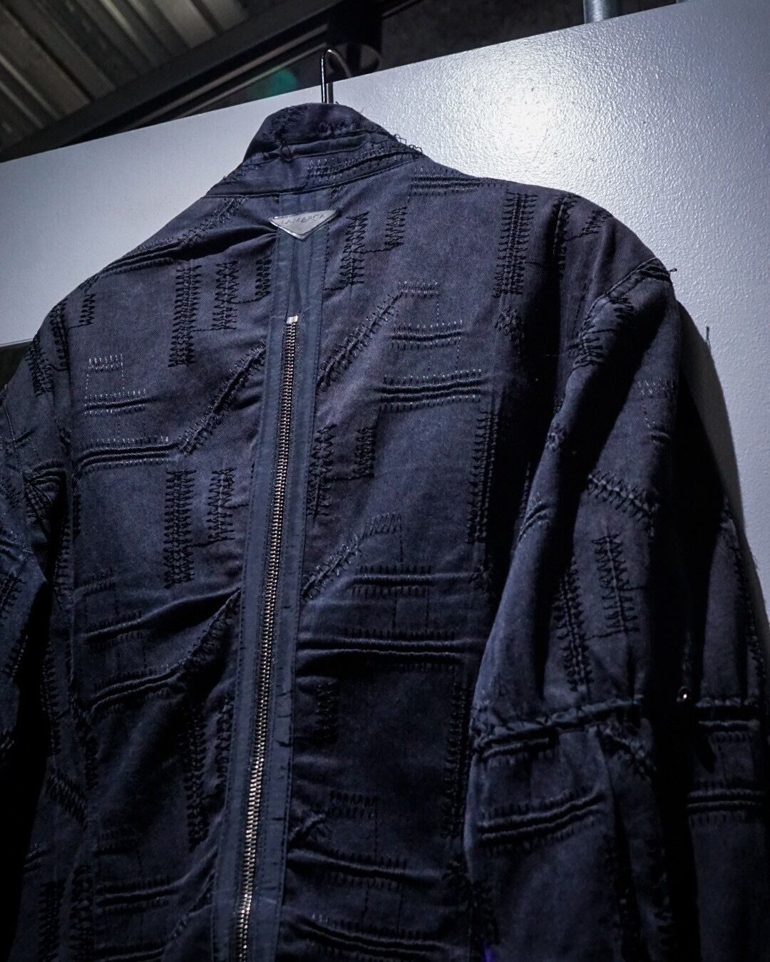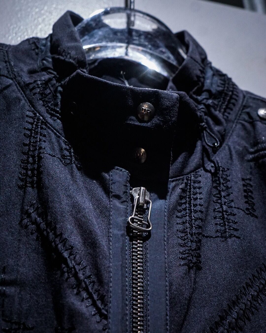 美しいサンフェードの効いたコットンツイルのボディに、ジグザグのステッチを全体にランダムに施したジップアップジャケット。