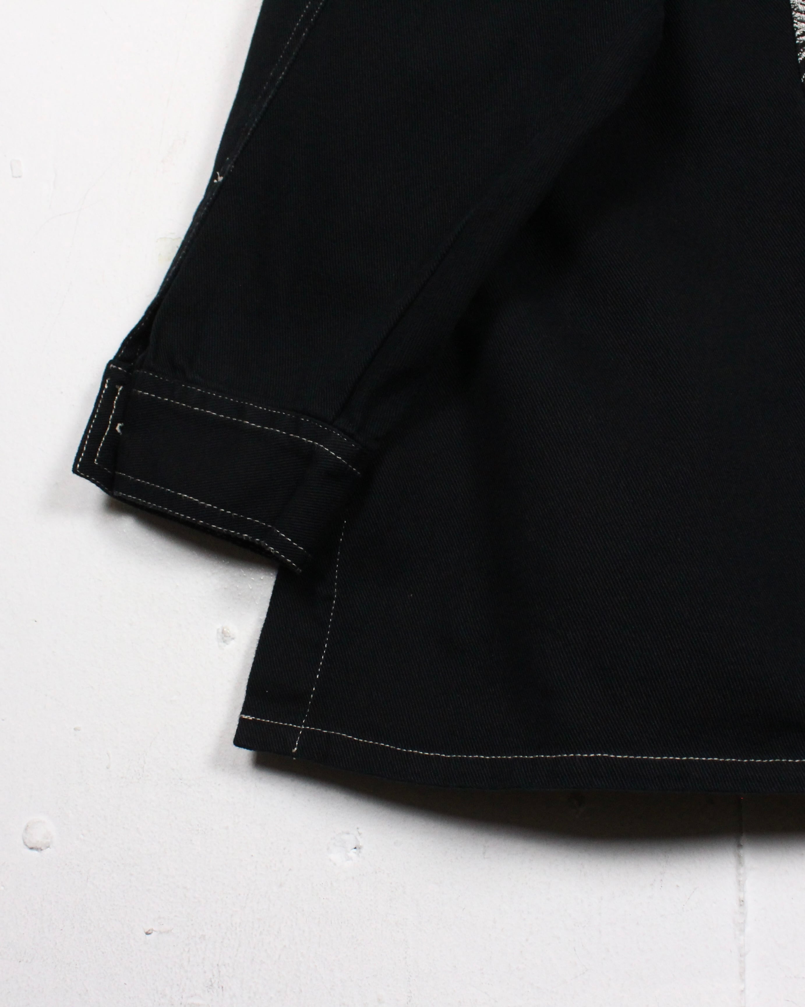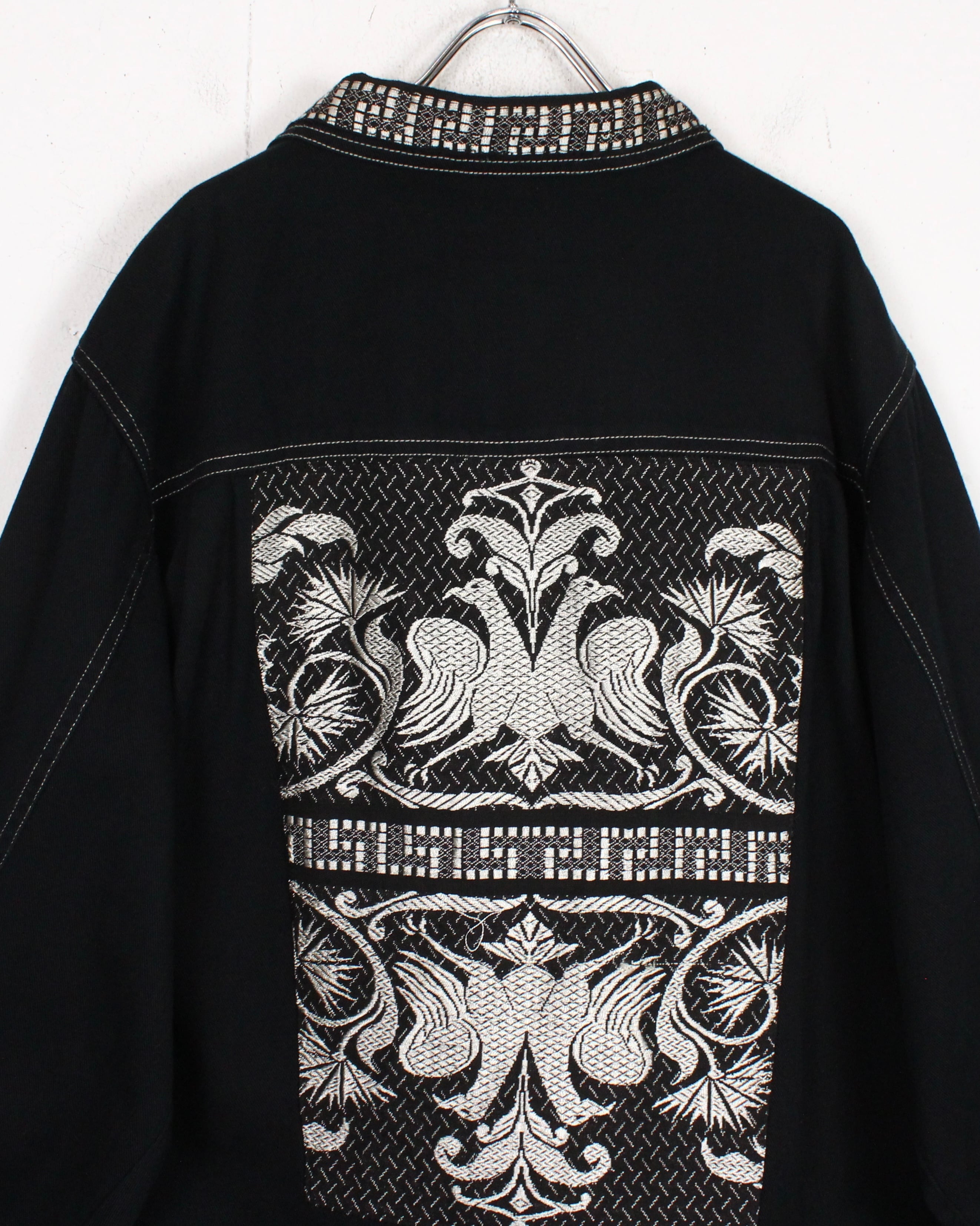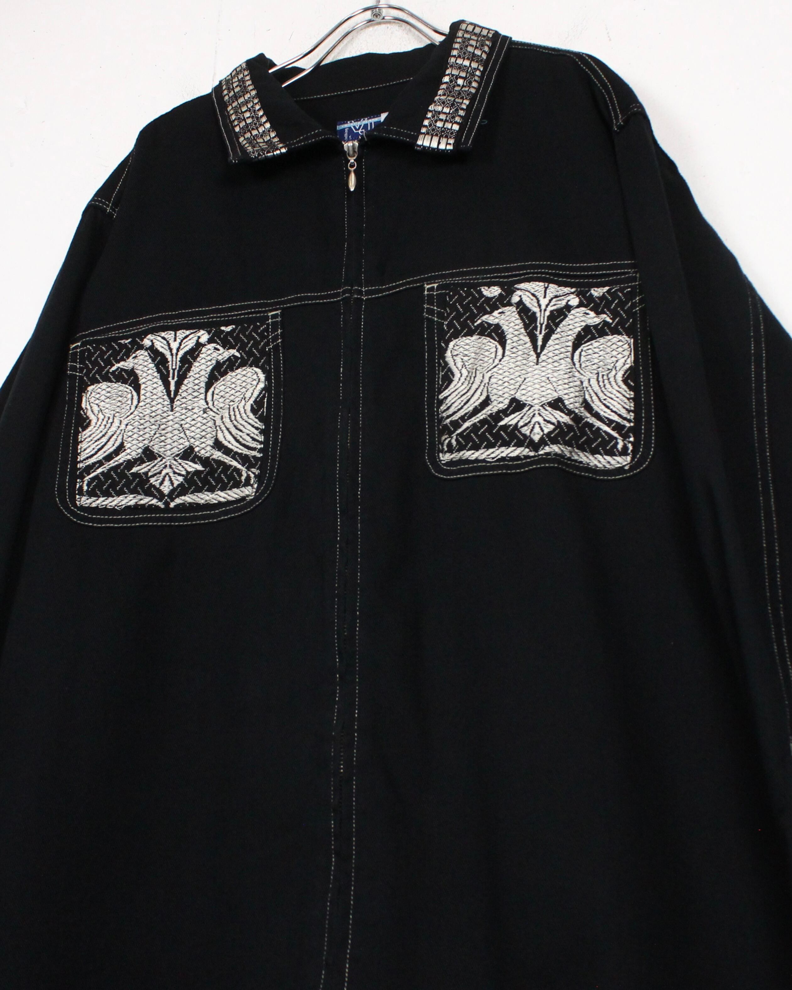 コットン素材を用いたブラックボディに、アーティスティックな刺繍によるパッチをフロント両胸、背面に載せたジップアップジャケット。